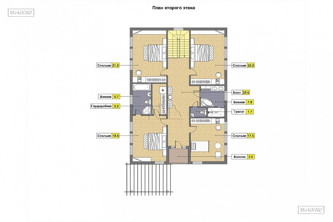 В доме разместиться очень большая семья с детьми. Две небольшие спальни на первом этаже и четыре спальни на втором этаже. А также раздельные ванная и туалет, чтобы по утрам и вечерам на собирались очереди в коридоре.