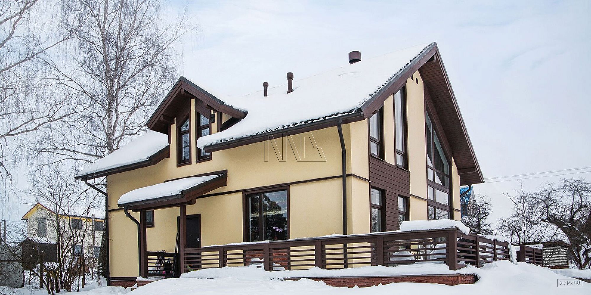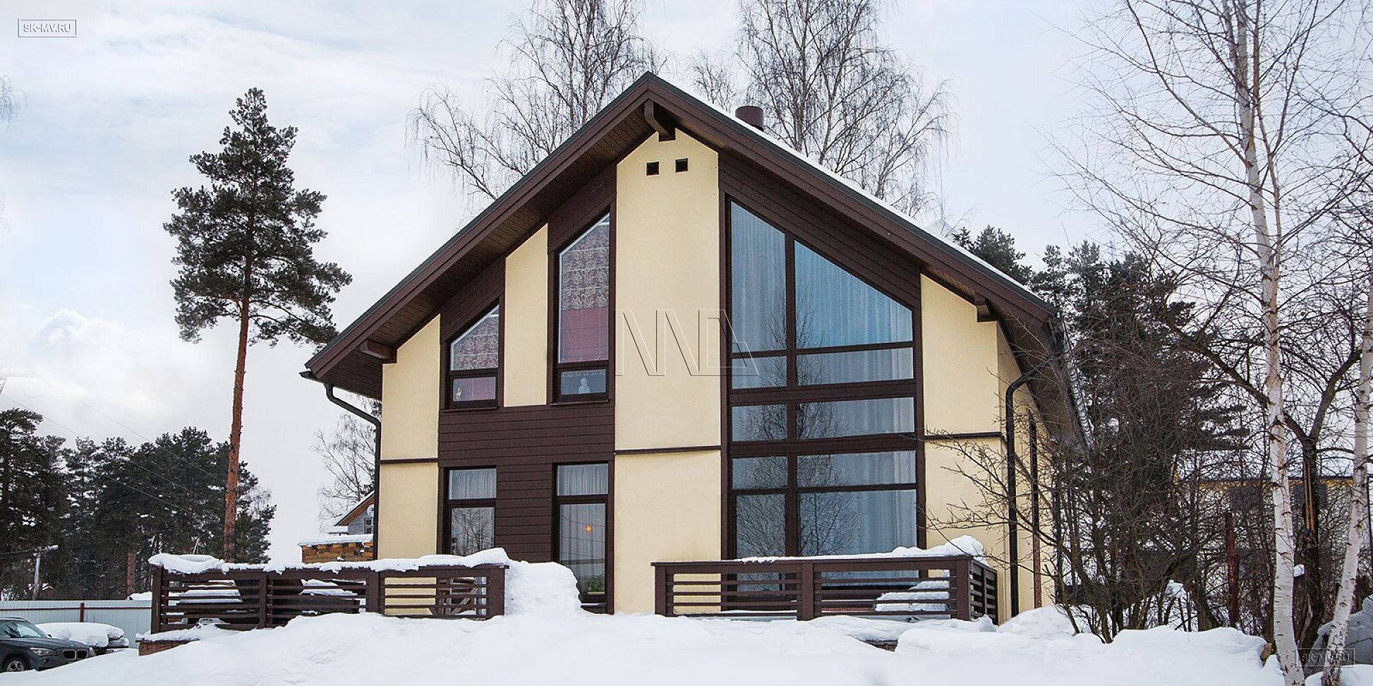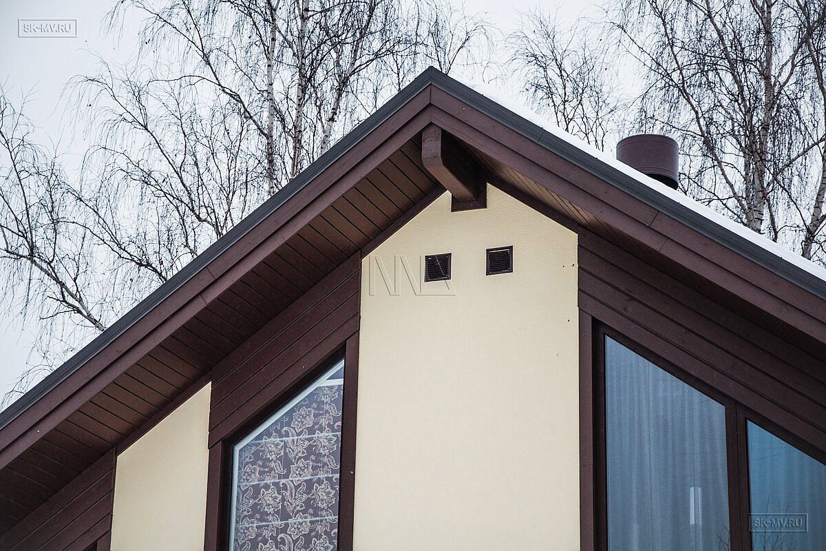 Комбинированная отделка дома штукатуркой и отделочной доской задает асимметрию главного фасада, но не разрушает цельный образ дома. Коричневая вагонка поддержана другими деревянными и металлическими элементами: ограждениями, стойками, планками, элементами водосточной системы, цветом кровли и т.д.