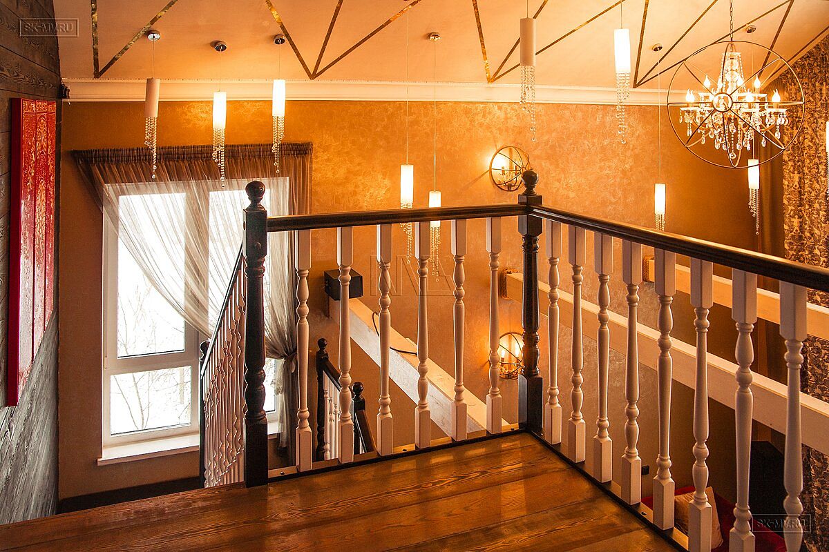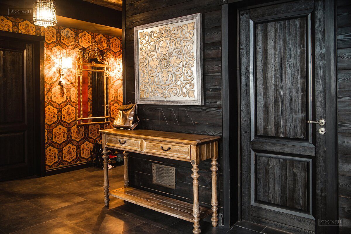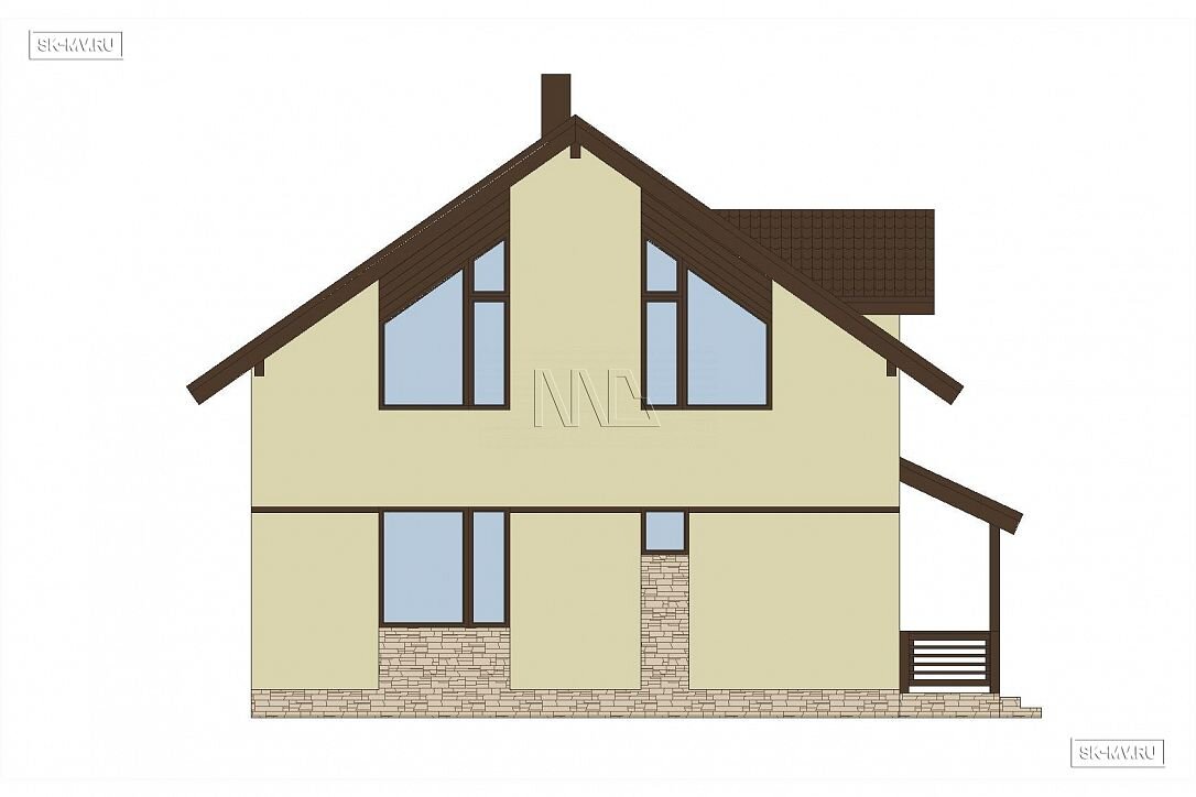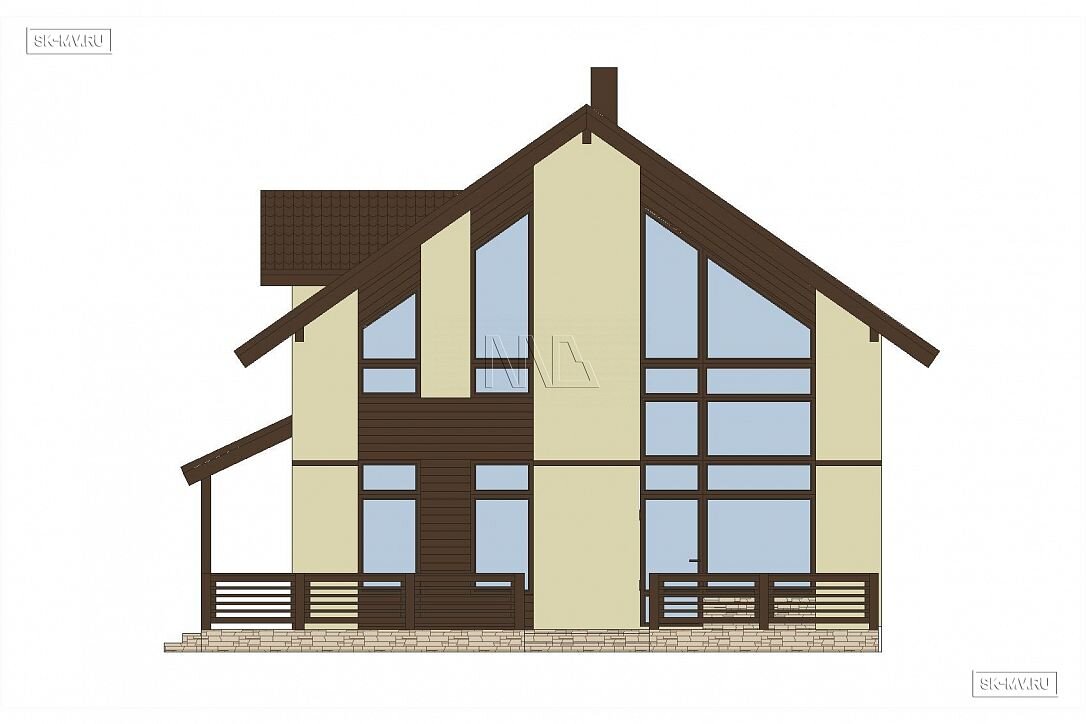 Комбинированная отделка дома штукатуркой и отделочной доской задает асимметрию главного фасада, но не разрушает цельный образ дома. Коричневая вагонка поддержана другими деревянными и металлическими элементами: ограждениями, стойками, планками, элементами водосточной системы, цветом кровли и т.д.