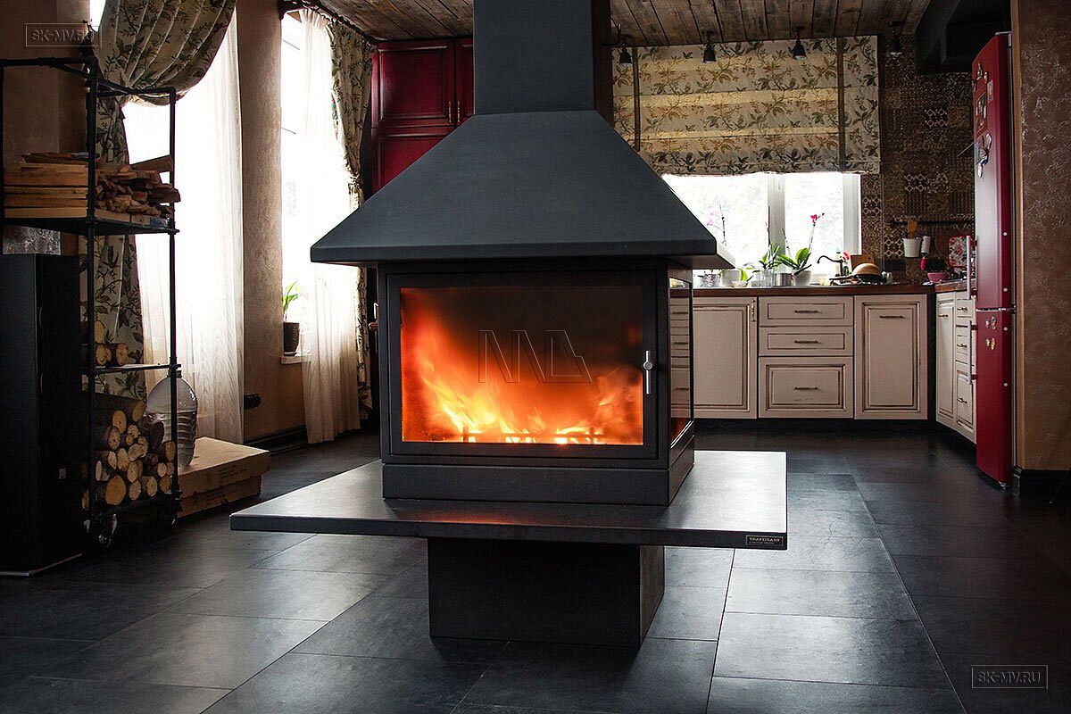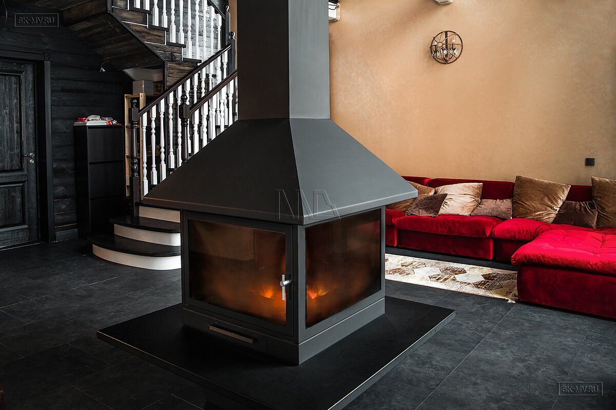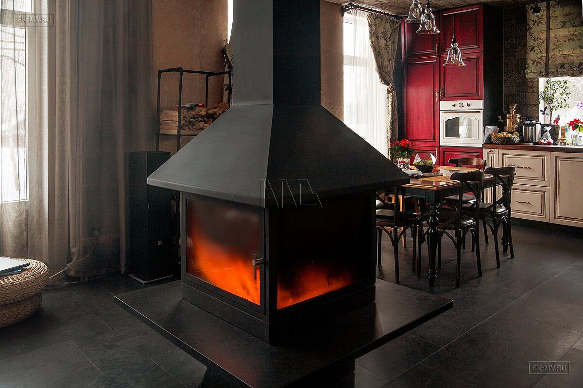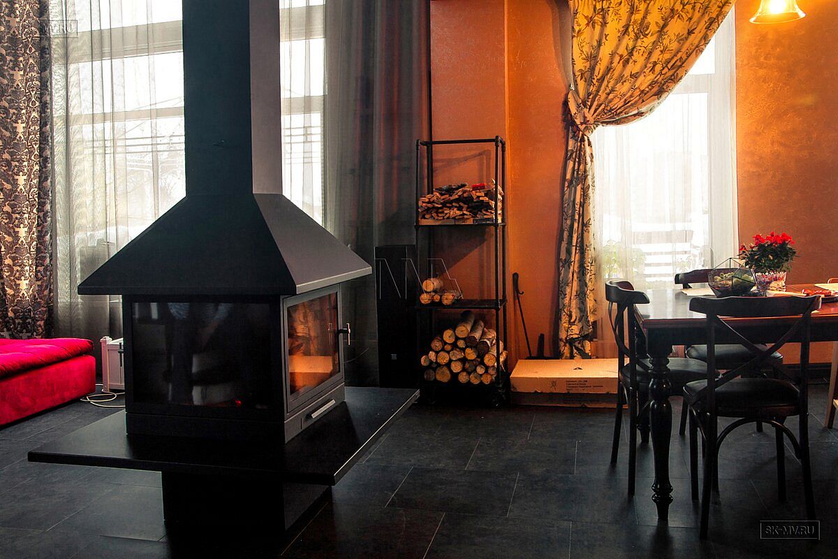 Второй свет и большие панорамные окна создают солнечный ясный и приятный объем первого этажа. Интересным решением нашего архитектора является камин, который удачно расположен в центре совмещенной гостиной-столовой-кухни. Не смотря на сложность монтажа такой конструкции — островной камин оптимальное решение для этой площади. Из гостиной мы выходим на солнечную большую террасу, которая может быть как открытой, так и закрытой, например, пергалами.