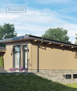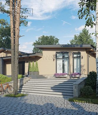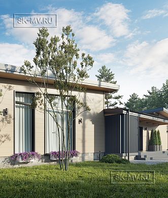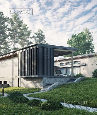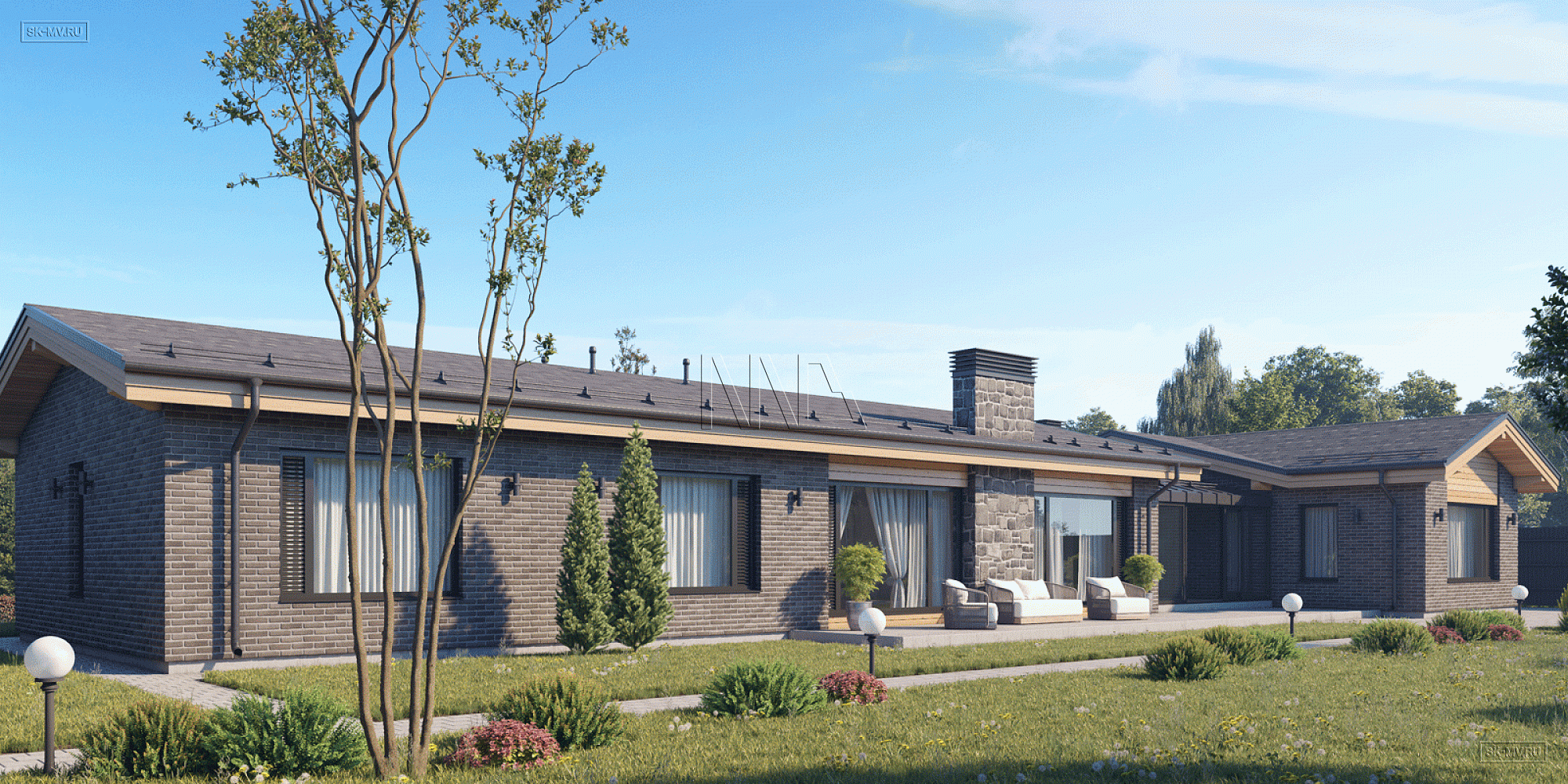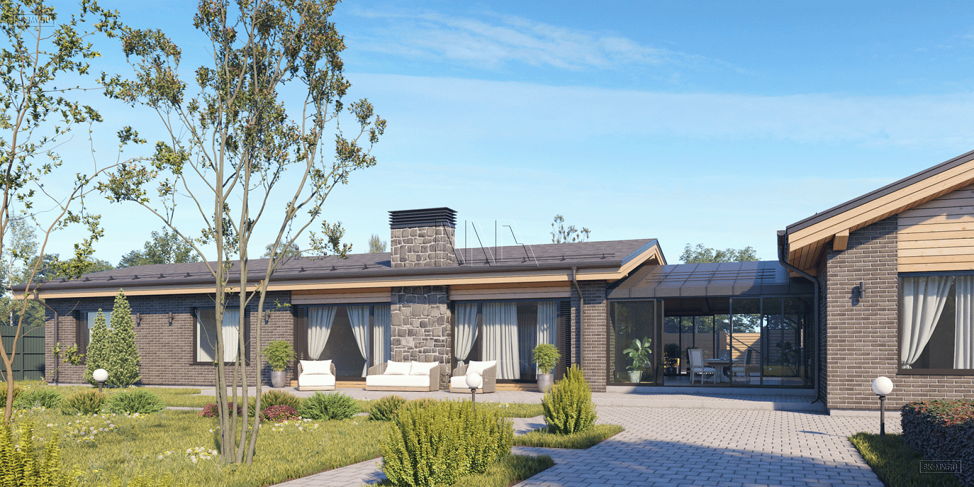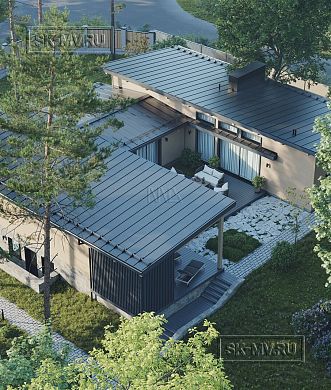 Проект современного сблокированного одноэтажного загородного дома с террасой-барбекю «Дом на озере» — это интересное решение для небольшой семьи.