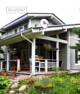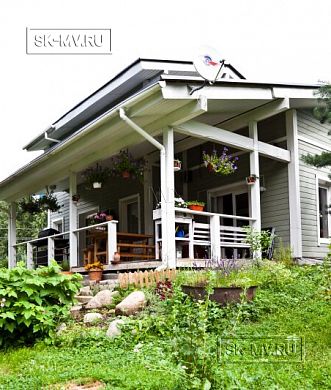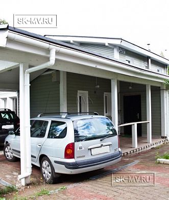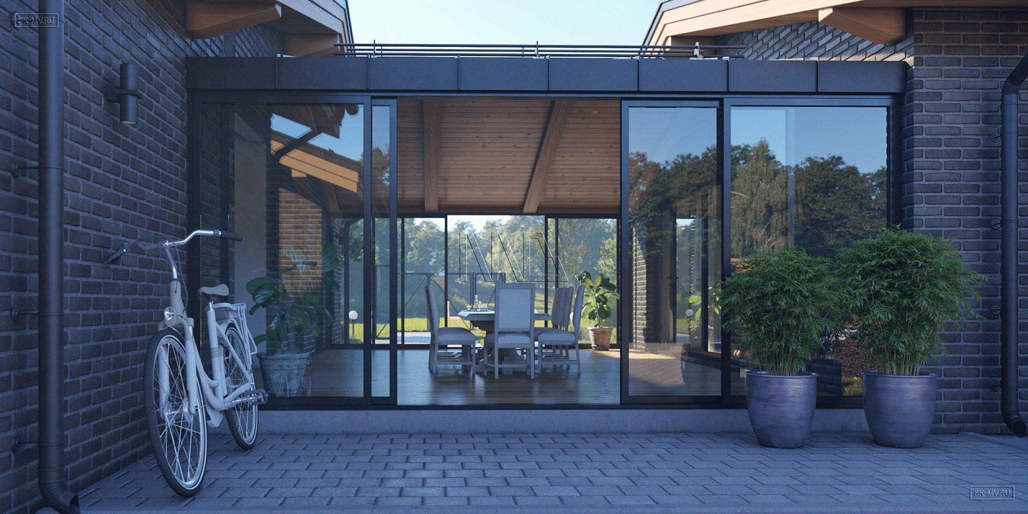 Интересно рассмотреть использованное в этом проекте дизайнерское решение — комбинация металлической фальцевой кровли террасы-веранды с мягкой кровлей основного дома. Такое «металлическое» решение удачно перетекает на фасад и поддерживает стилистическое современное решение раздвижных дверей открывающих вид на две стороны террасы. При этом отделка потолка террасы-барбекю выполнена деревянной вагонкой в тон подшивки карнизных свесов основного здания и витражных деревянных вставок на фасаде.