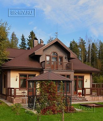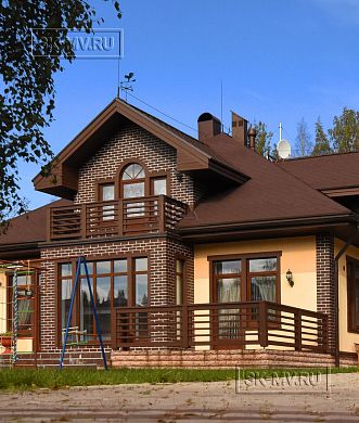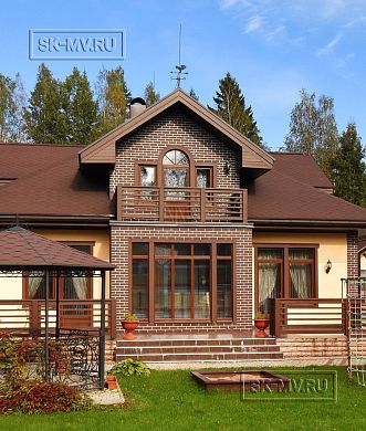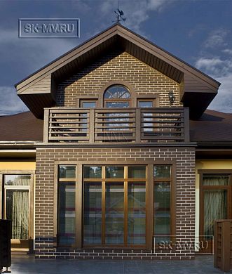 Архитектурный облик дома сформирован темно-коричневой кирпичной кладкой, красиво отделанным натуральным камнем дымоходом камина (который вынесен за пределы жилой площади), а также большими площадями остекления гостиной и террасы.