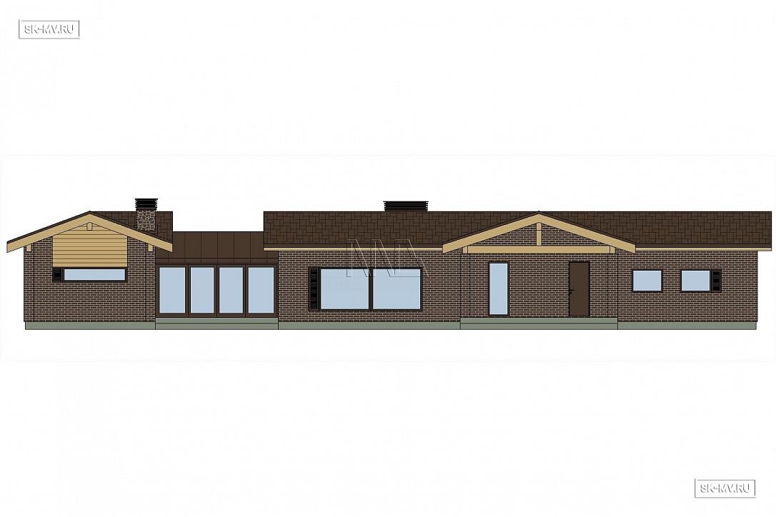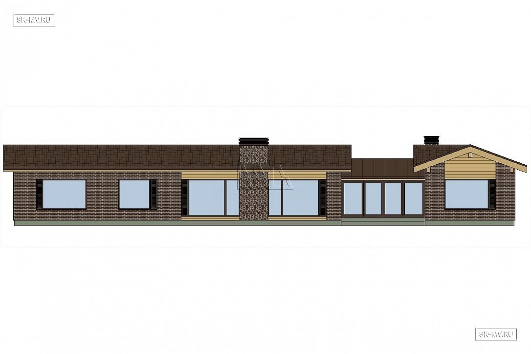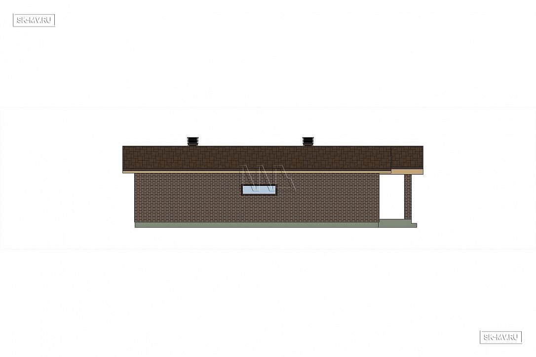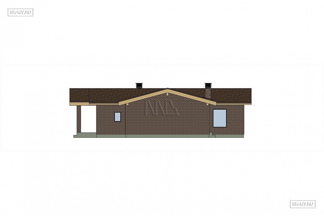 Строительство этого одноэтажного коттеджа возможно как из газобетона, кирпича, так и по скандинавской каркасной технологии.