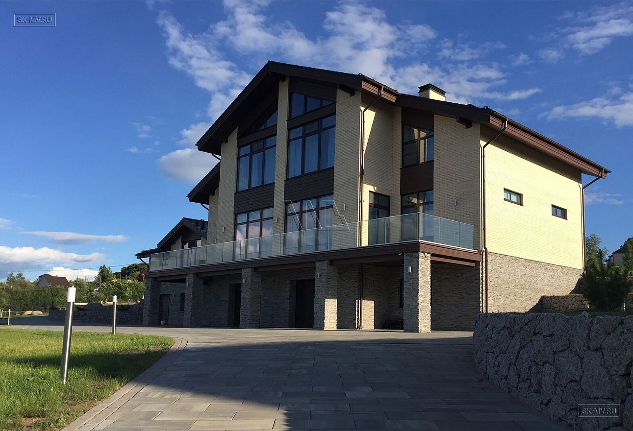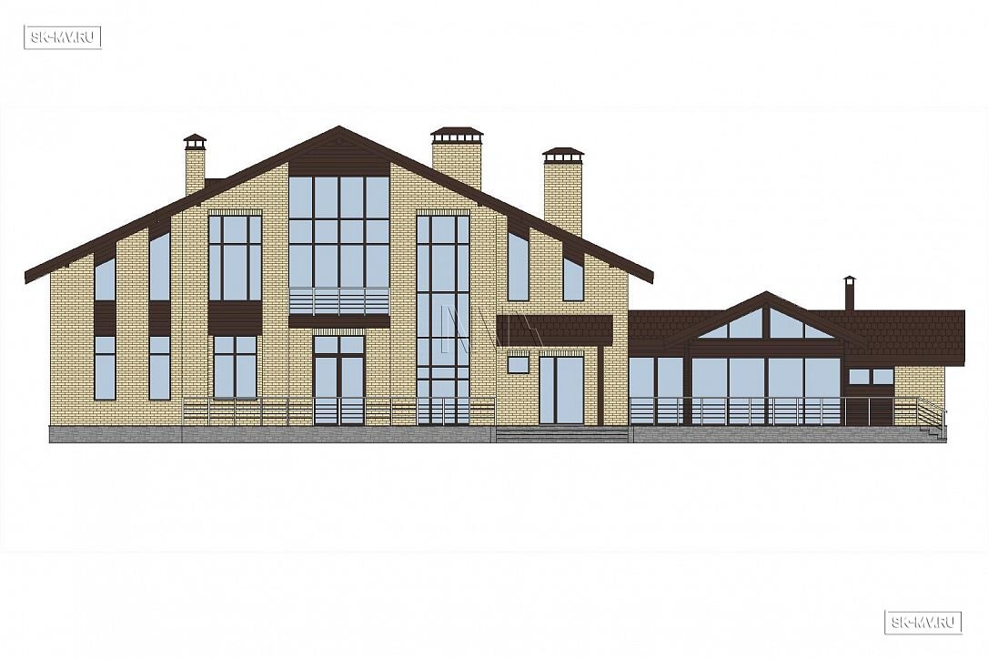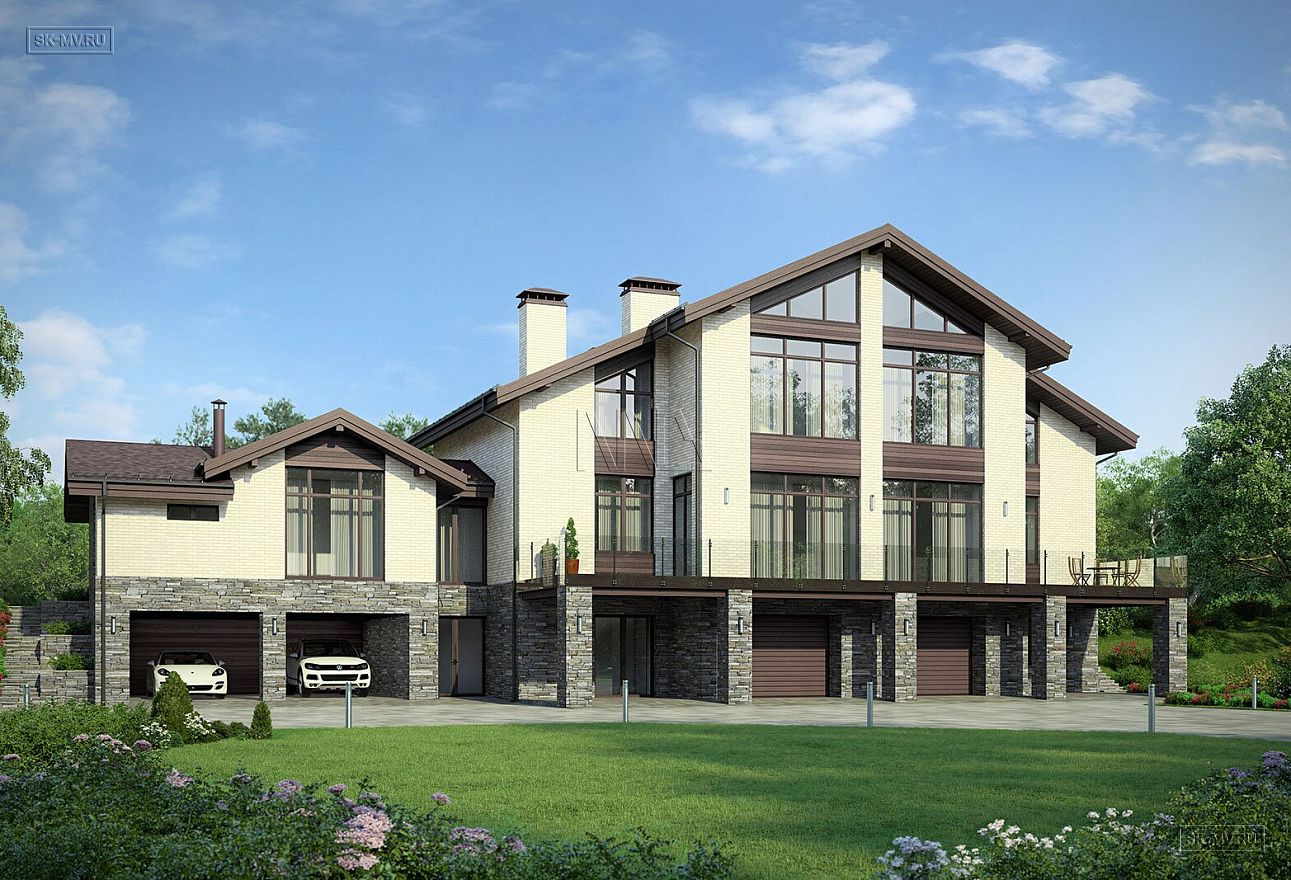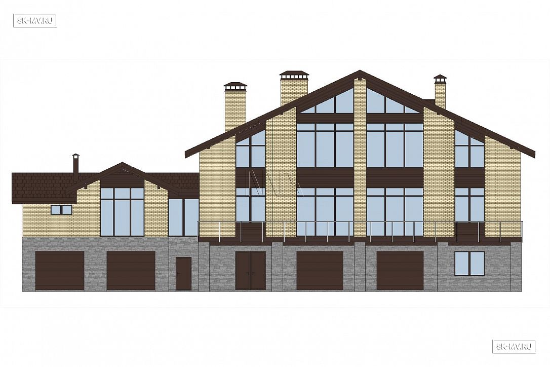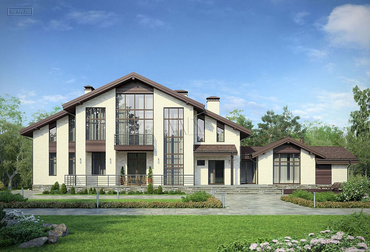 Проект «Дом на склоне» большого кирпичного (газобетонного) двухэтажного дома площадью почти 800 кв.м с цокольным этажом, гаражом, спа зоной (сауной) и тренажерным залом имеет очень интересную удачную планировку с правильной организацией пространства и подойдет для тех, кто ценит свободу и не любит стесненности.