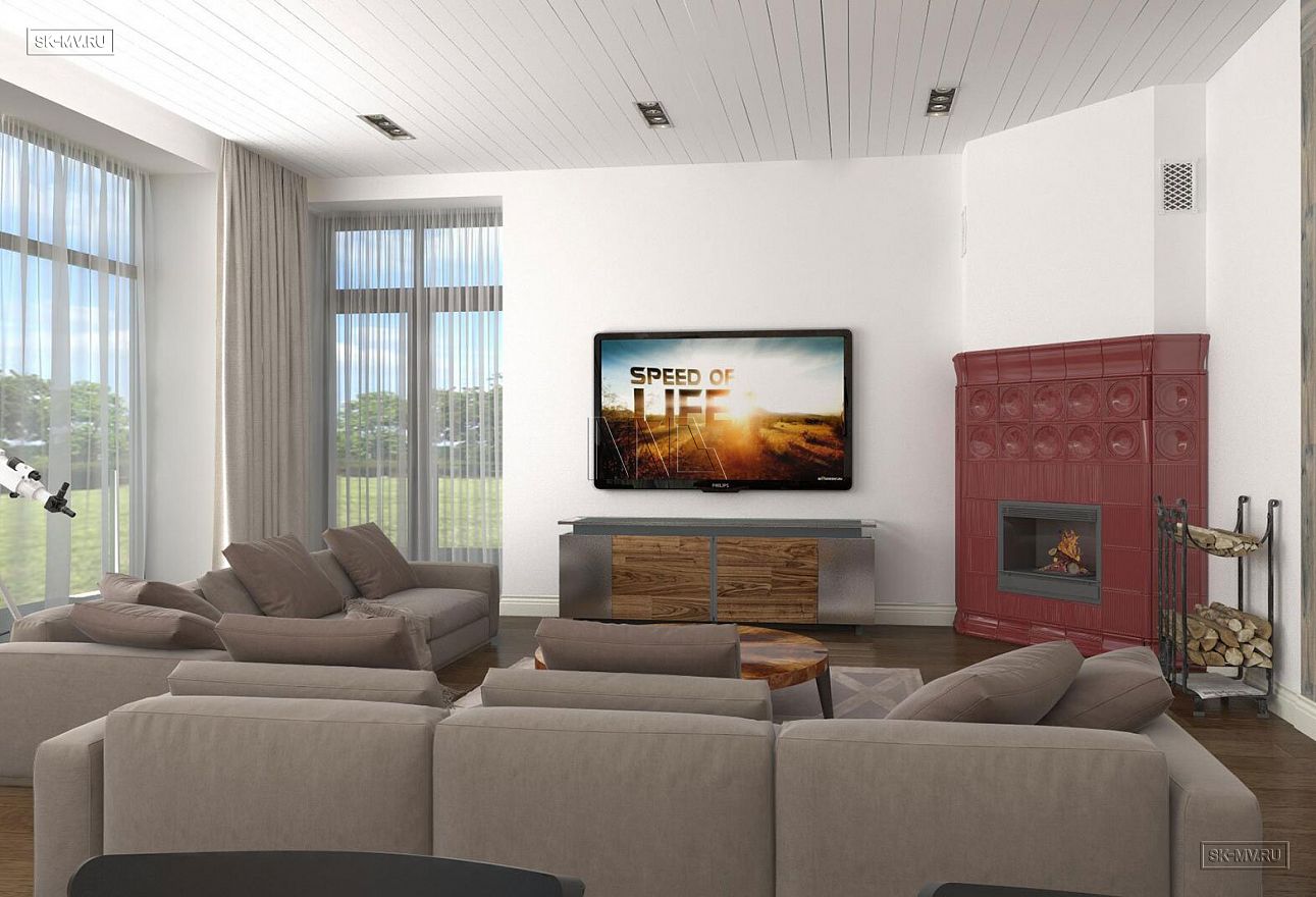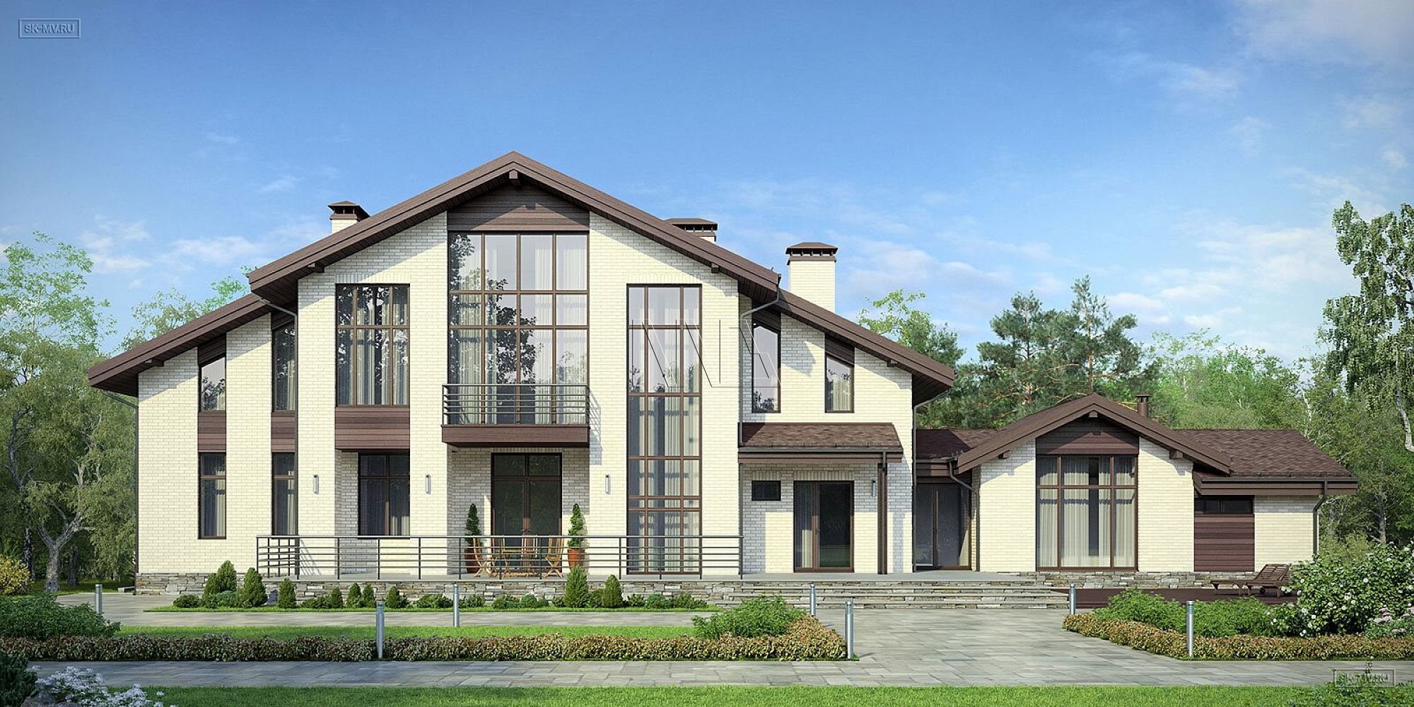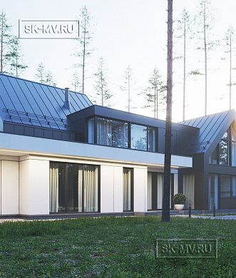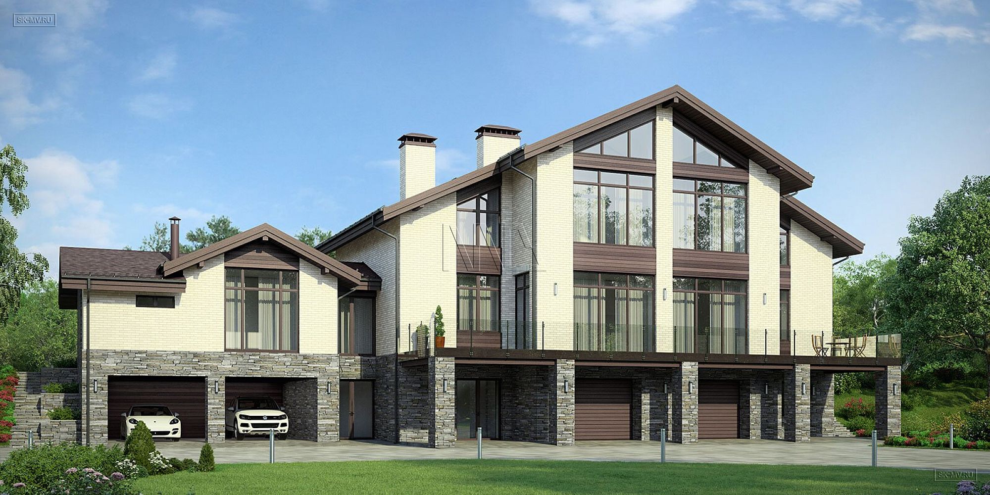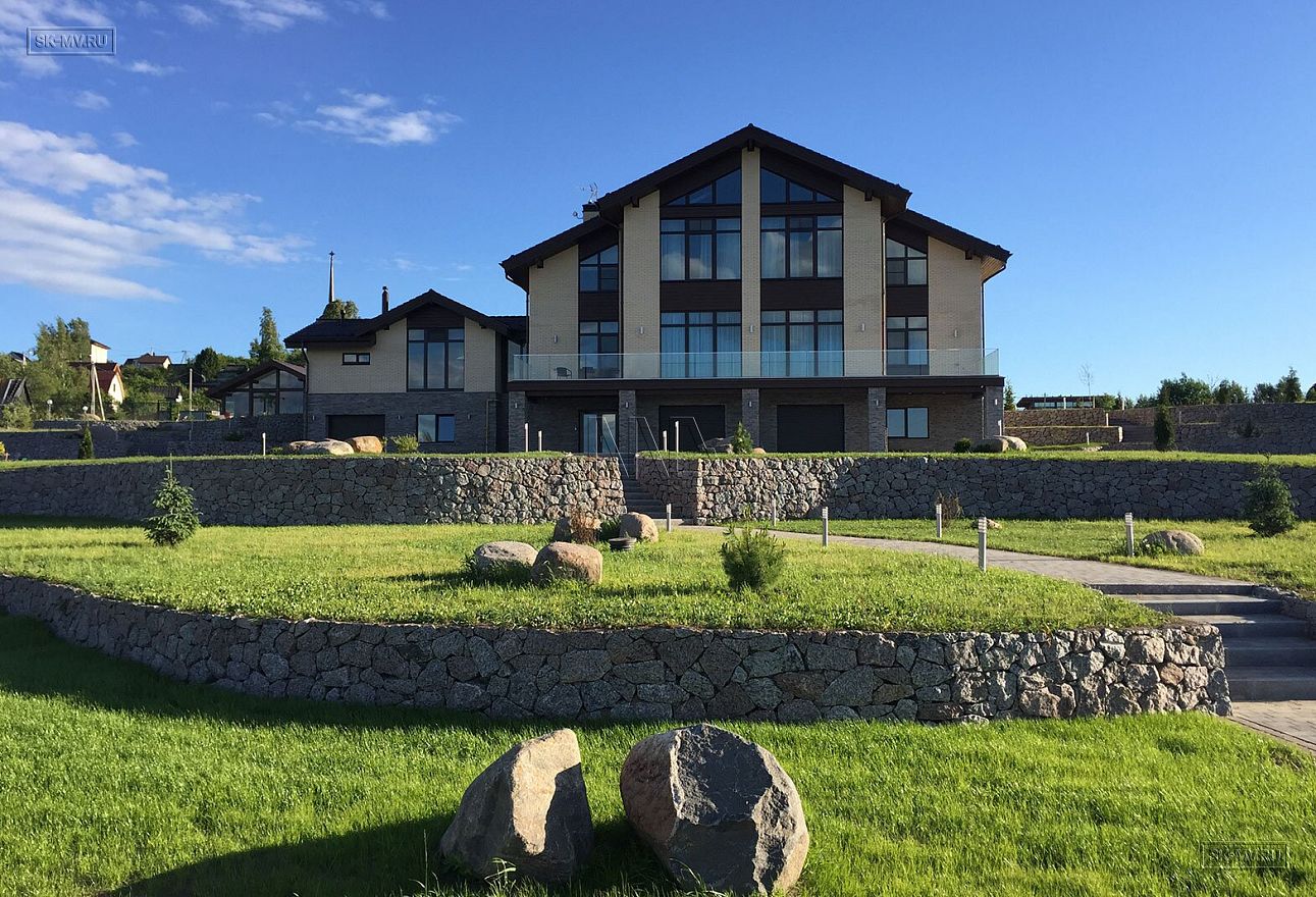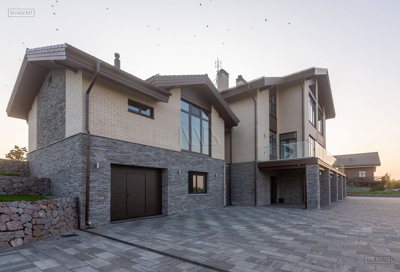 Проект «Дом на склоне» большого кирпичного (газобетонного) двухэтажного дома площадью почти 800 кв.м с цокольным этажом, гаражом, спа зоной (сауной) и тренажерным залом имеет очень интересную удачную планировку с правильной организацией пространства и подойдет для тех, кто ценит свободу и не любит стесненности.
