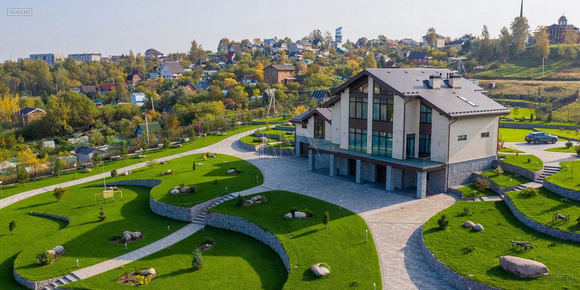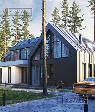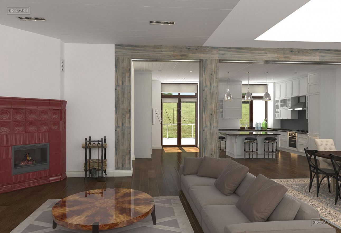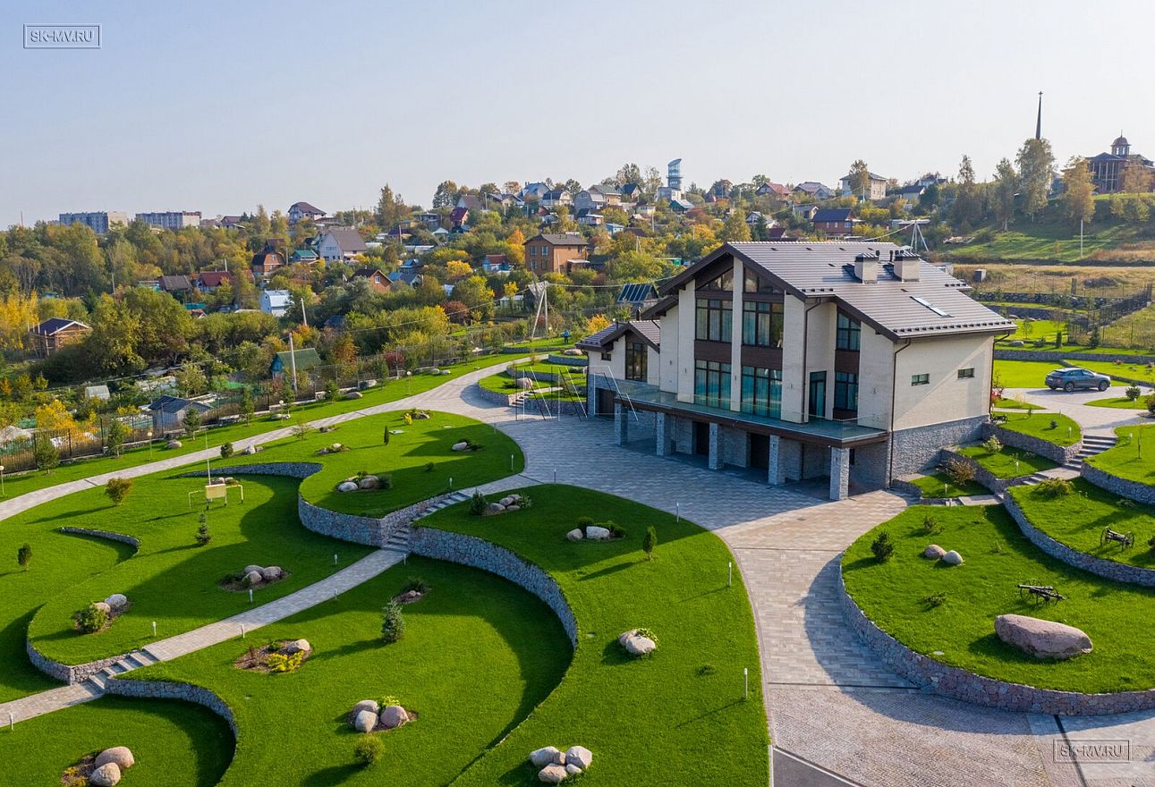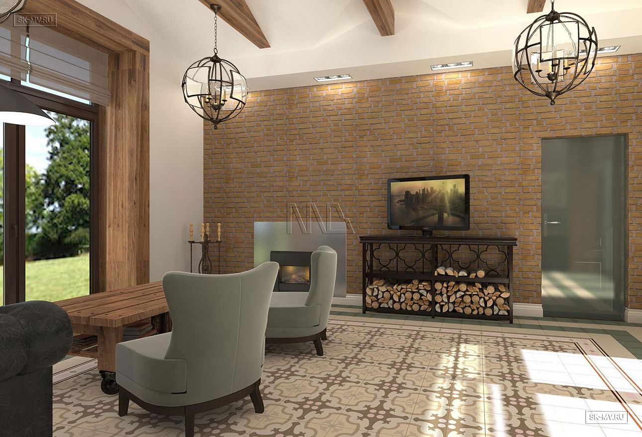 Проект «Дом на склоне» большого кирпичного (газобетонного) двухэтажного дома площадью почти 800 кв.м с цокольным этажом, гаражом, спа зоной (сауной) и тренажерным залом имеет очень интересную удачную планировку с правильной организацией пространства и подойдет для тех, кто ценит свободу и не любит стесненности.