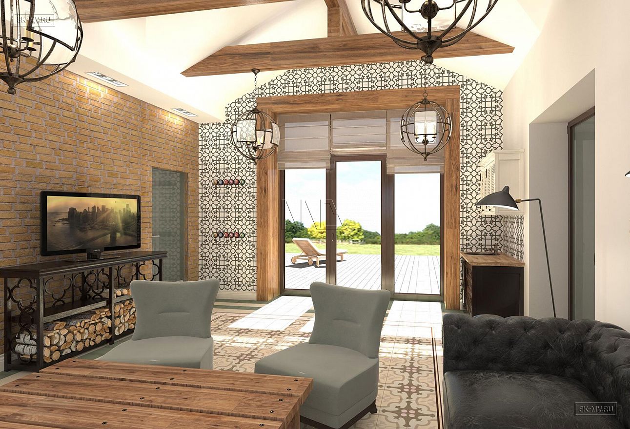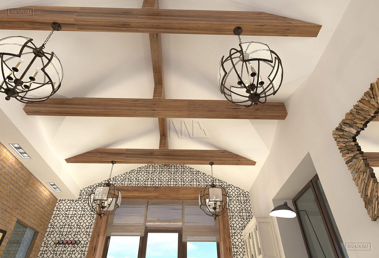 Стропильная система заводского изготовления (доска 45 × 195 мм, сухая, строганная) с применением балок из клееного бруса или бруса LVL.