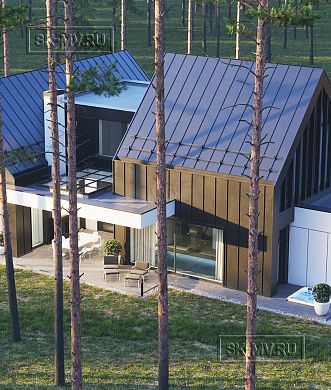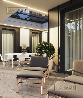 На втором этаже выполнено разделение на две зоны: жилую зону и спа (spa) зону с сауной, бассейном и комнатой отдыха, которые вместе соединяет очень большая терраса 131,2 кв.м. Жилая зона сформирована огромным единым пространством 99,1 кв.м гостиной, столовой и кухни с выходом на террасу и на огромный балкон (58,7 кв.м) на противоположную от террасы сторону. Также на втором этаже расположились кабинет (почти 30 кв.м), спальня (26 кв.м) и ва санузлами, площадь ванной при этом почти 20 кв.м.