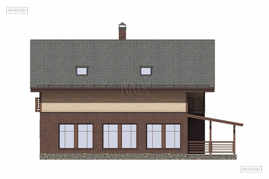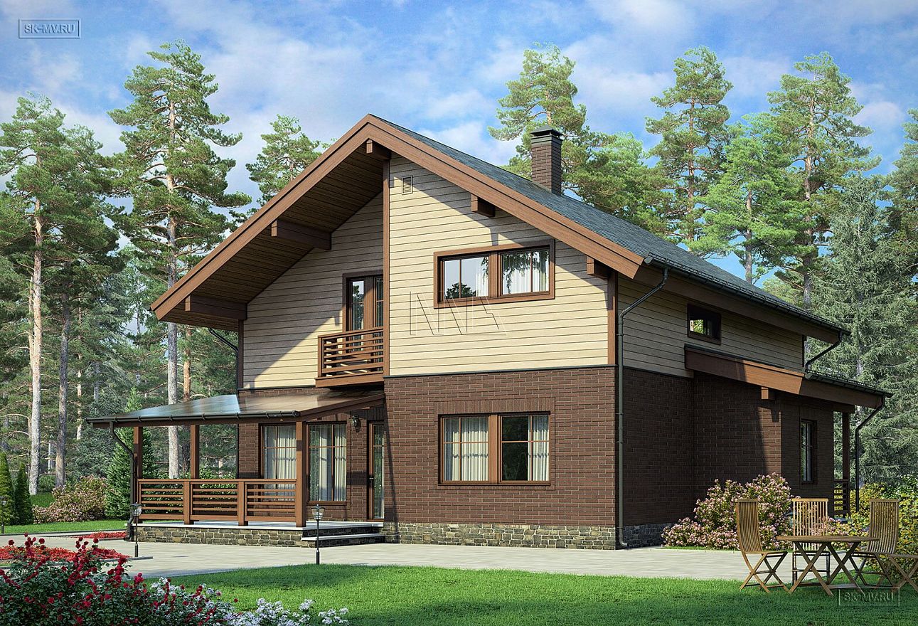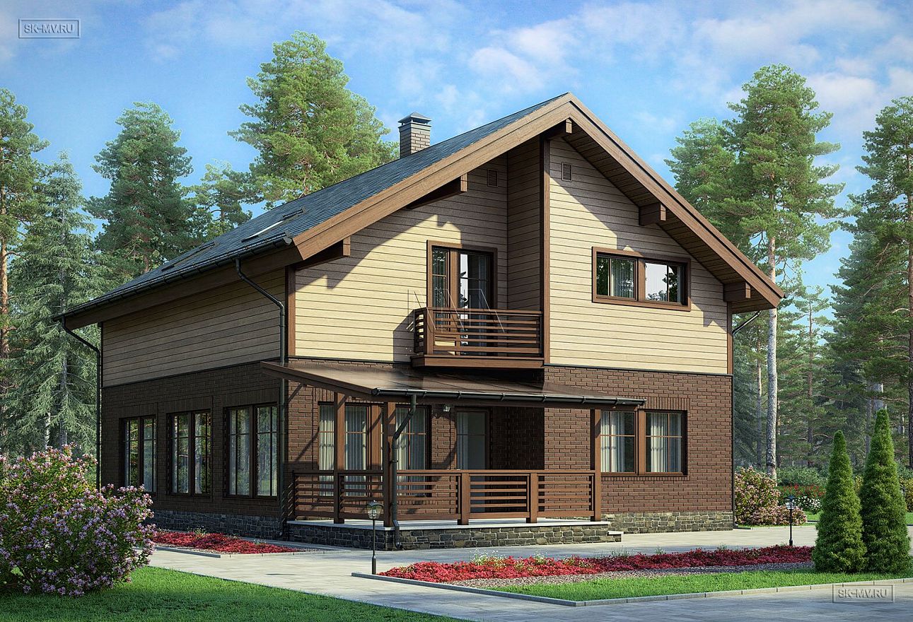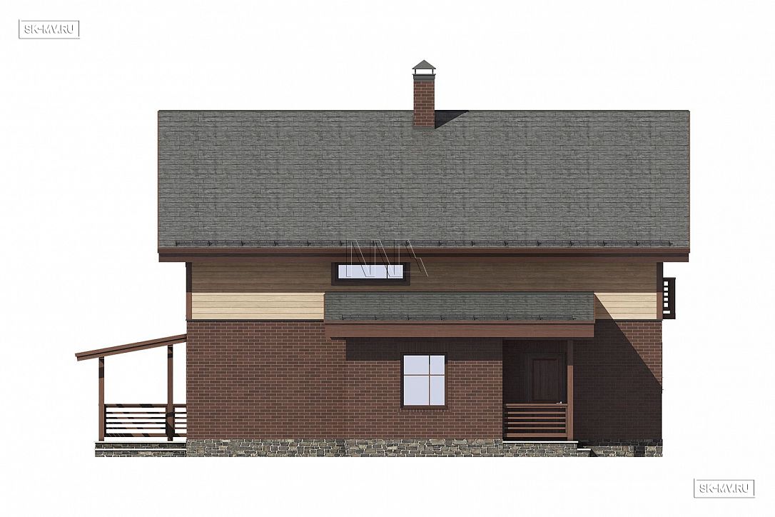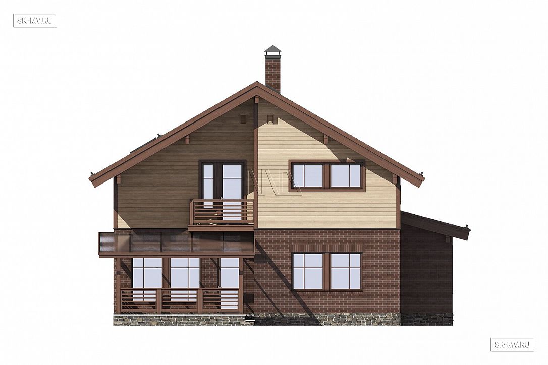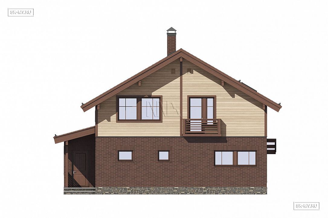 Прямоугольный дом с отделкой из кирпича и дерева (во втором варианте — отделка штукатуркой и деревом) с простой двускатной кровлей украшен только архитектурным каскадом балкона и террасы под прозрачной кровлей из поликарбоната. Простота геометрической формы преобразовывается в выразительную индивидуальность благодаря оригинальной комбинированной отделке фасадов.