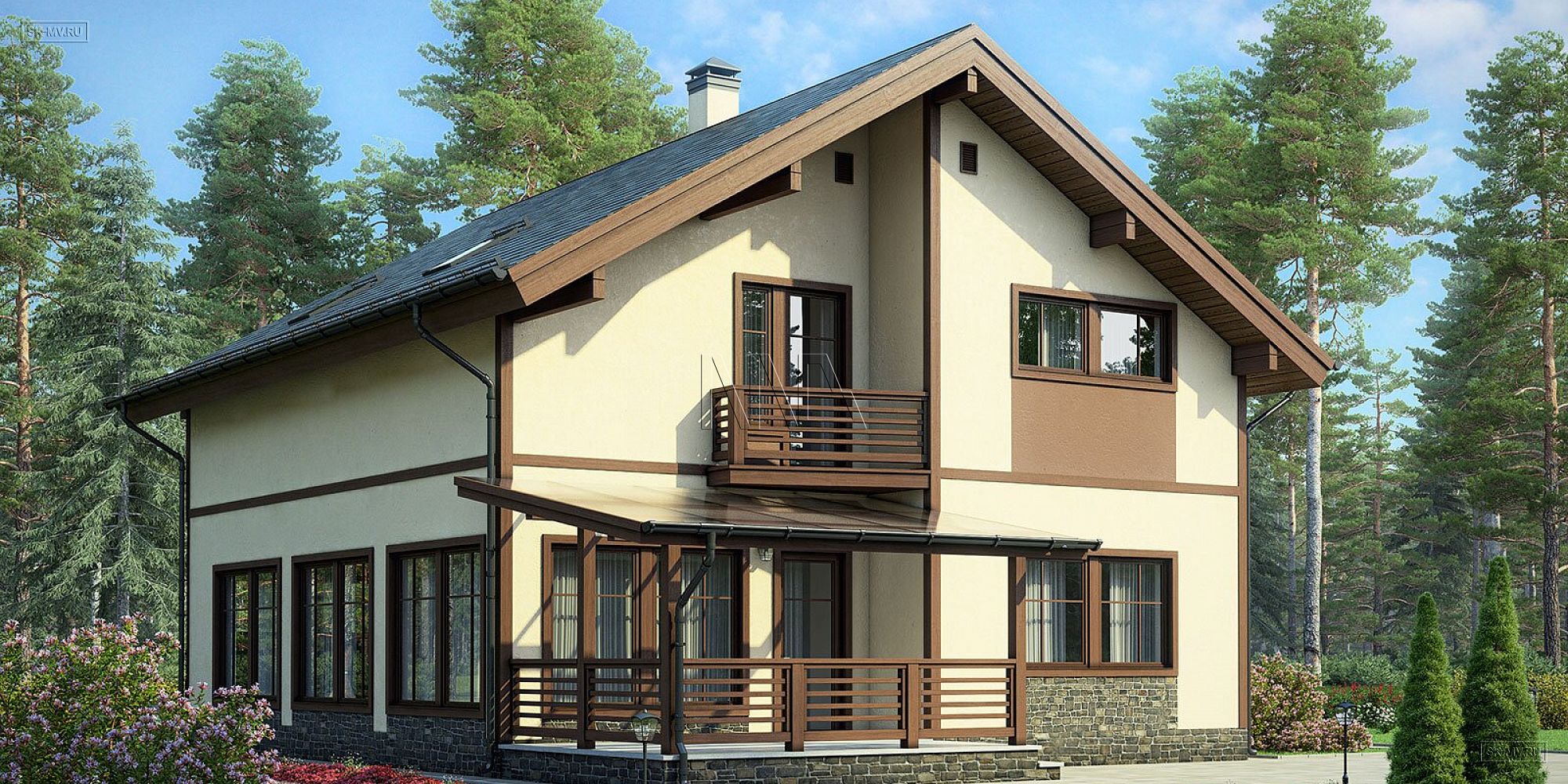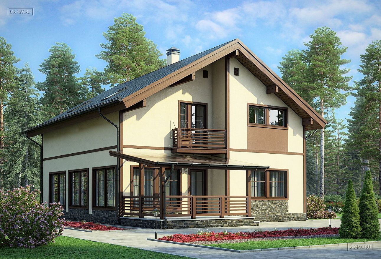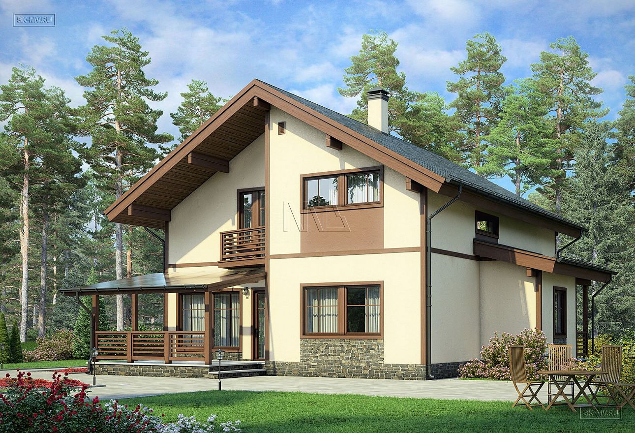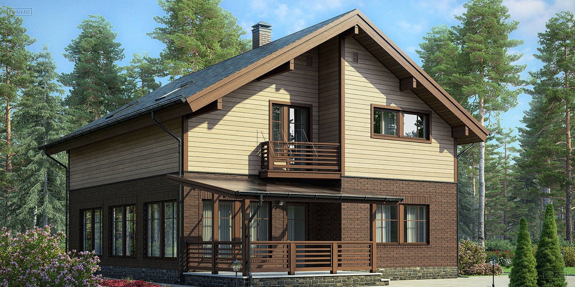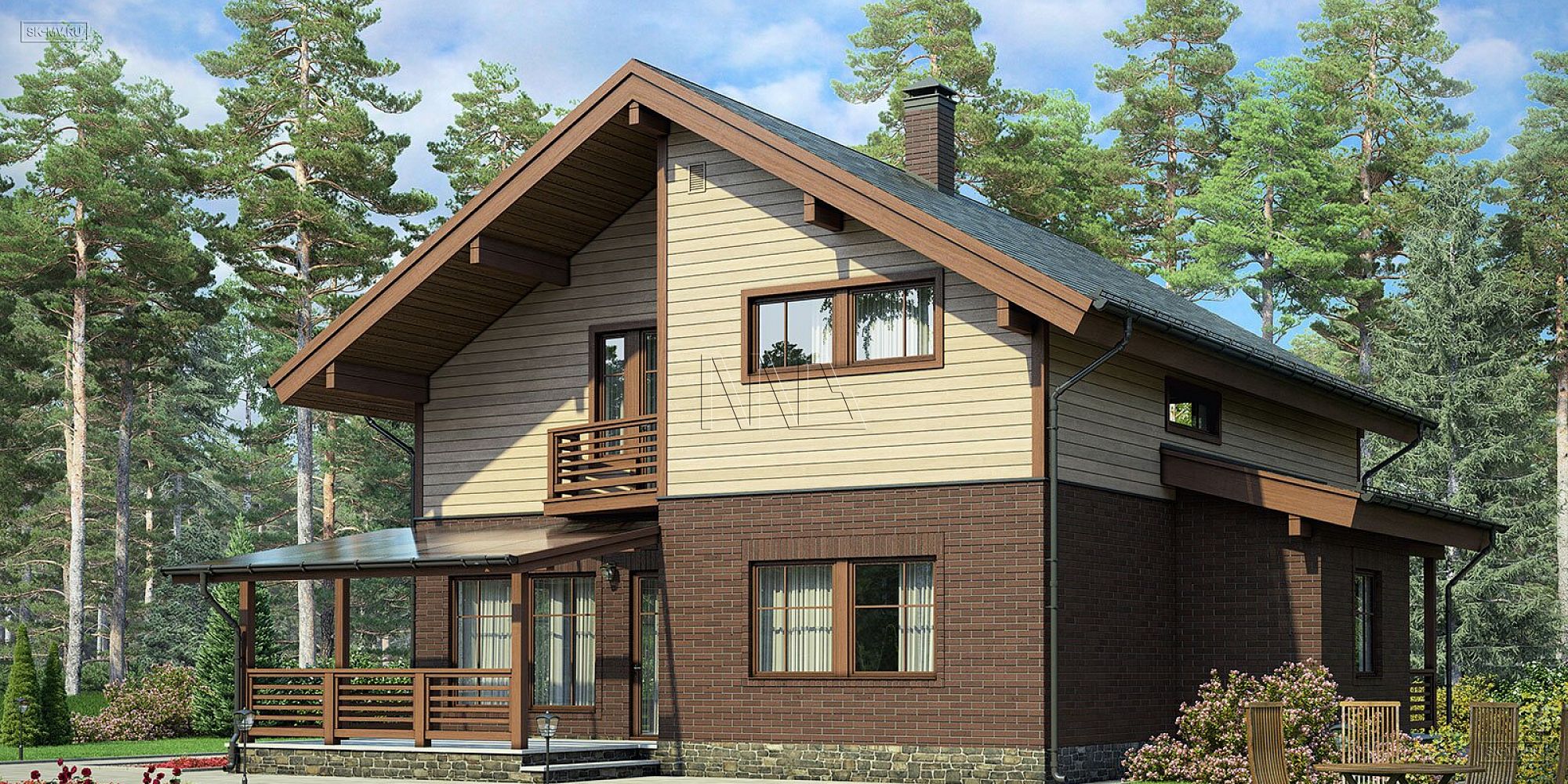 Прямоугольный дом с отделкой из кирпича и дерева (во втором варианте — отделка штукатуркой и деревом) с простой двускатной кровлей украшен только архитектурным каскадом балкона и террасы под прозрачной кровлей из поликарбоната. Простота геометрической формы преобразовывается в выразительную индивидуальность благодаря оригинальной комбинированной отделке фасадов.