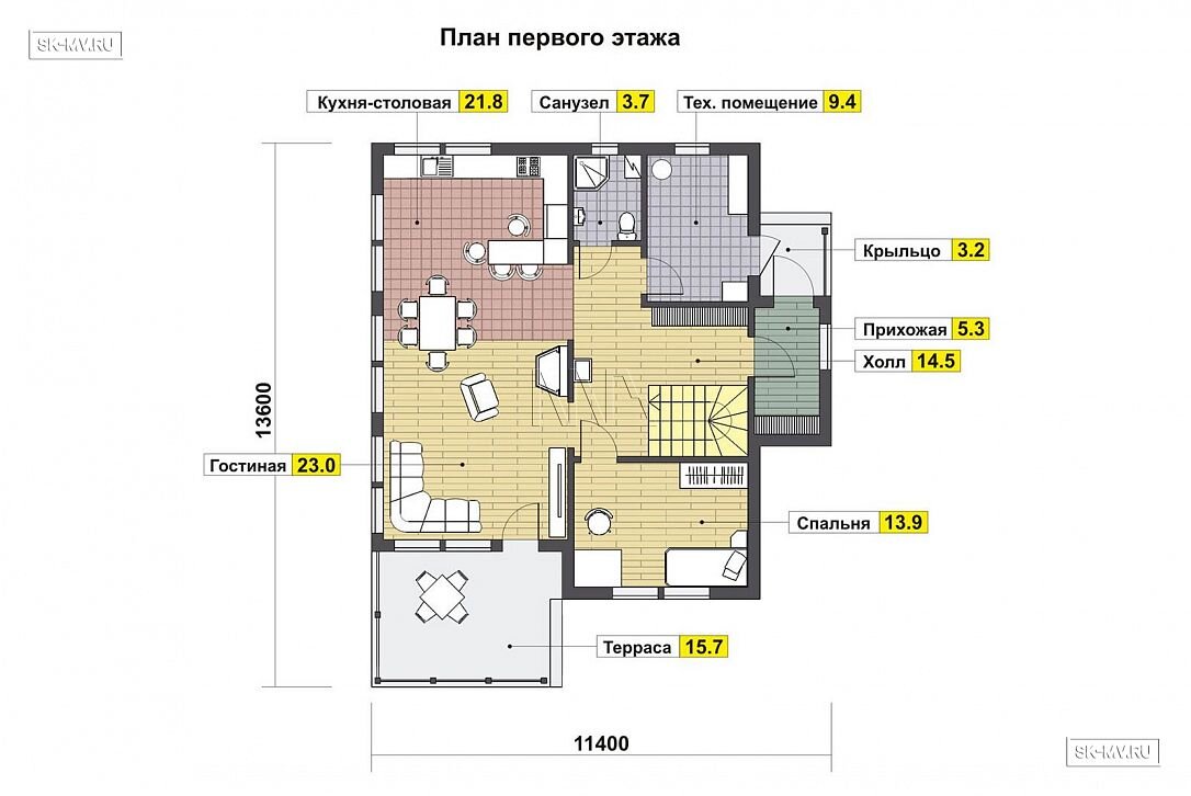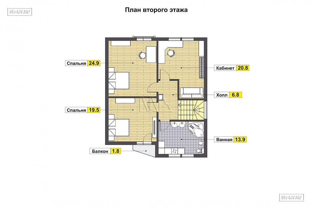 Типовой проект комбинированного каркасного дома «Европейский» площадью 182,5 кв.м разработан для строительства уютного жилища для семьи из 5-6 человек. Проект подходит почитателям классического английского стиля, любителям строгости и правильных геометрических форм.
