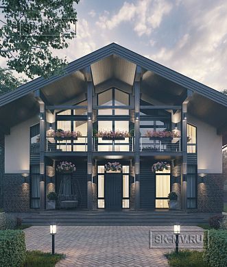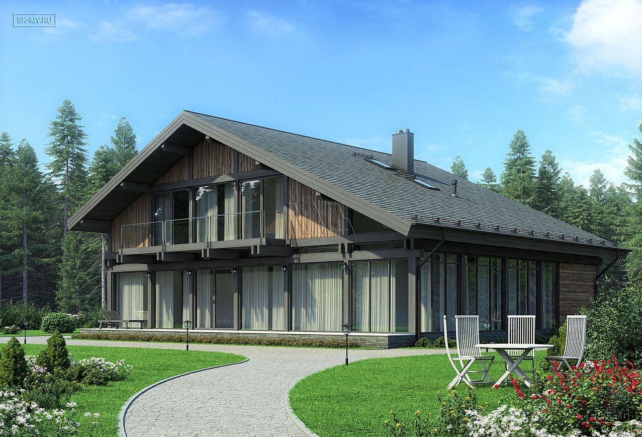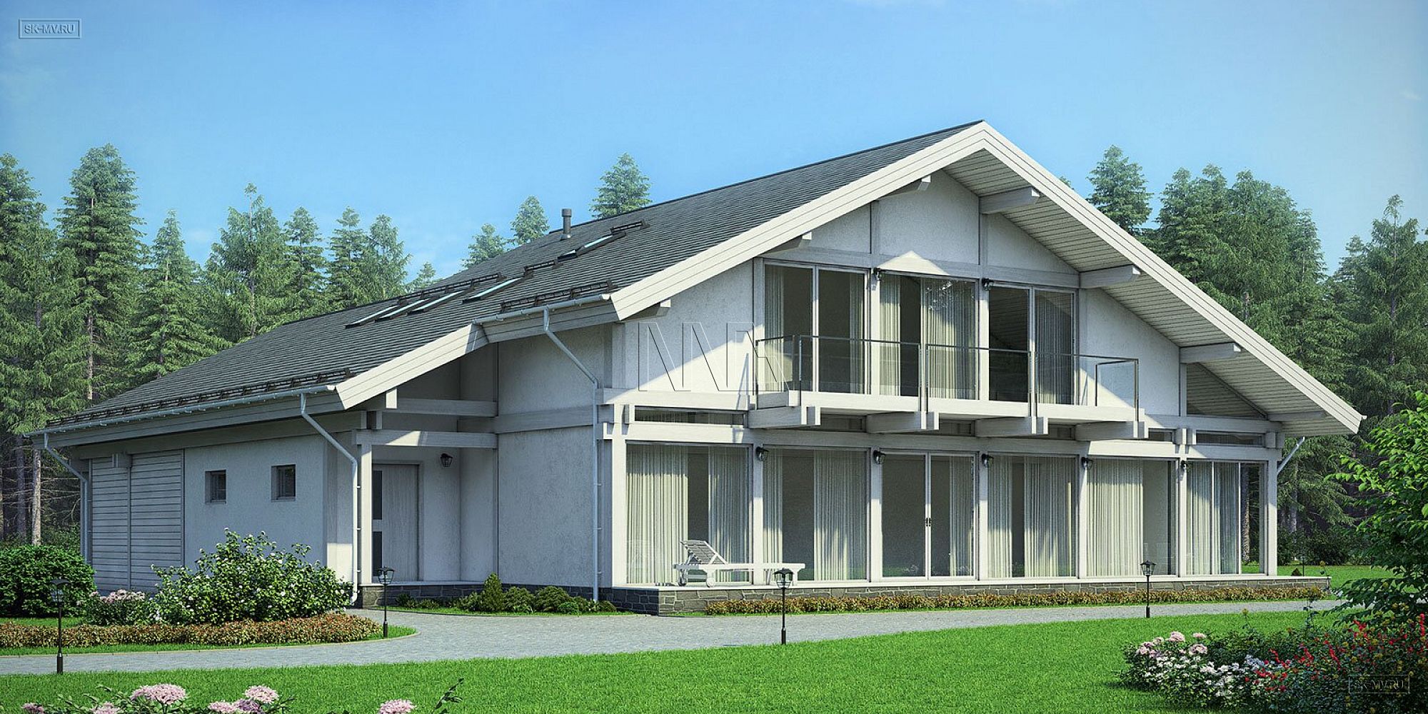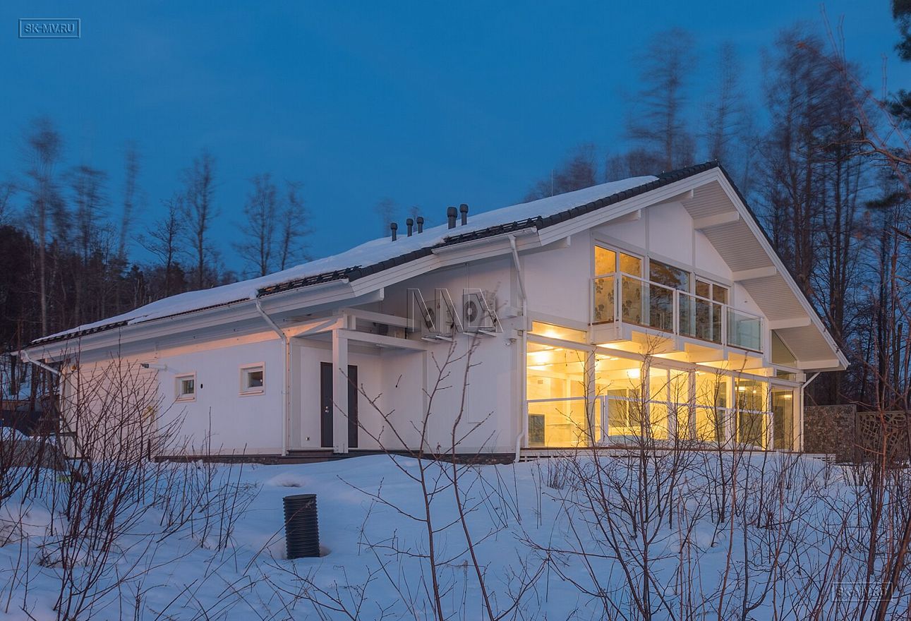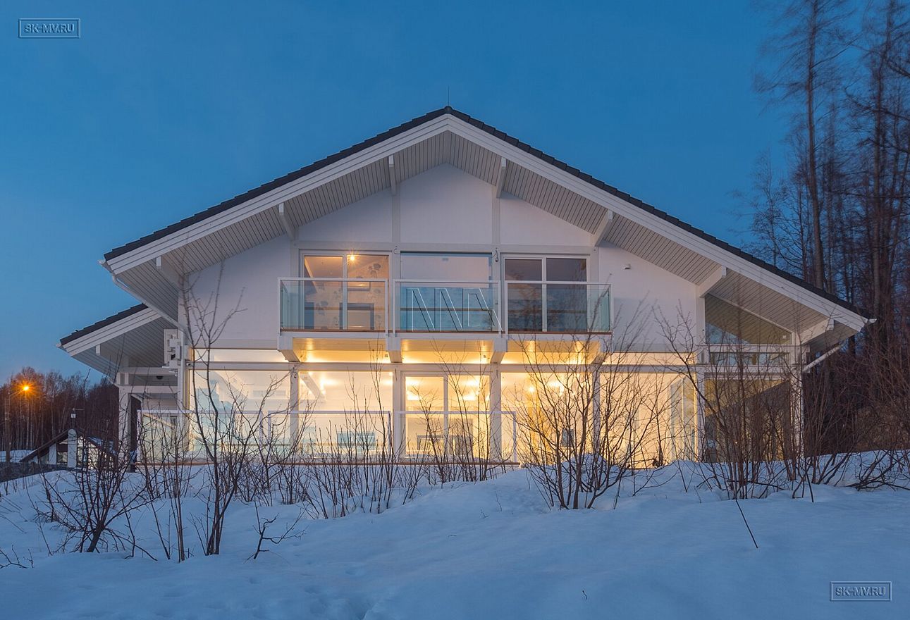 Массивные балки и стойки из клееного бруса создают несущий пространственный 3Д каркас коттеджа. Большие пролеты формируют большие пространства внутри. Большие окна дают возможность ощущать себя в единстве с природой. Светлая отделочная доска на фасаде. Дерево и стекло — только натуральные материалы внутри и снаружи — основа современного фахверка.