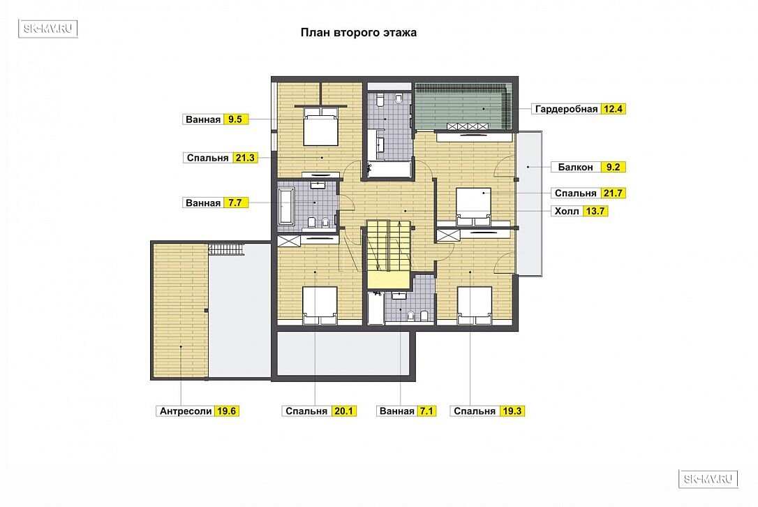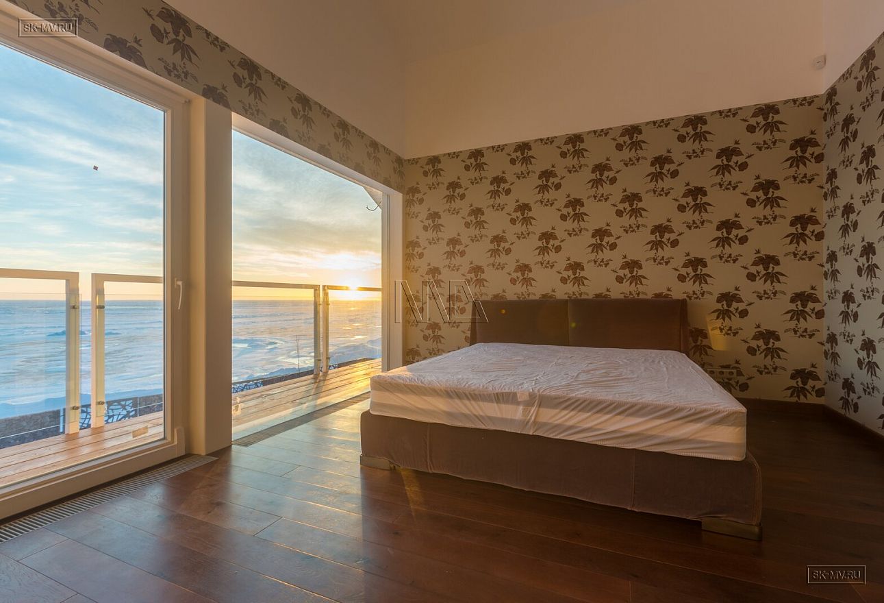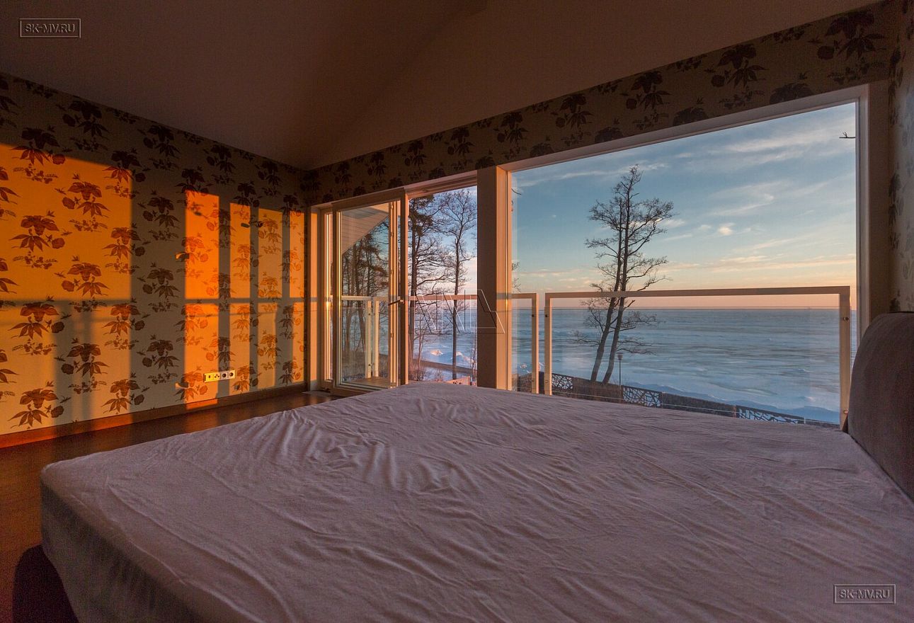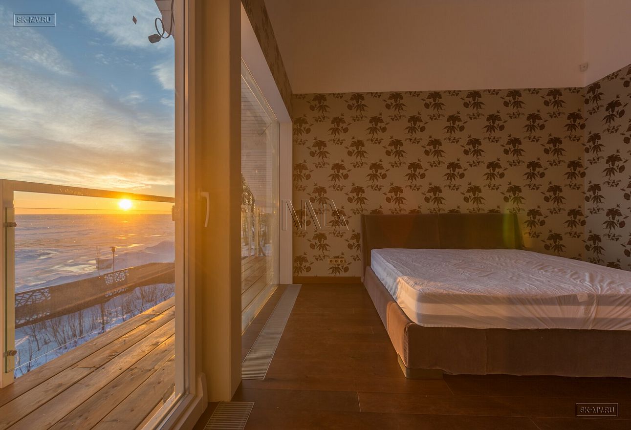 Второй мансардный этаж украшен балконом со слайдерным остеклением, чтобы ничто не мешало взгляду устремляться в даль. Две из четырех спален имеют выход на балкон — большая родительская мастер-спальня со своим сан.узлом и гардеробом и одна из гостевых спален.