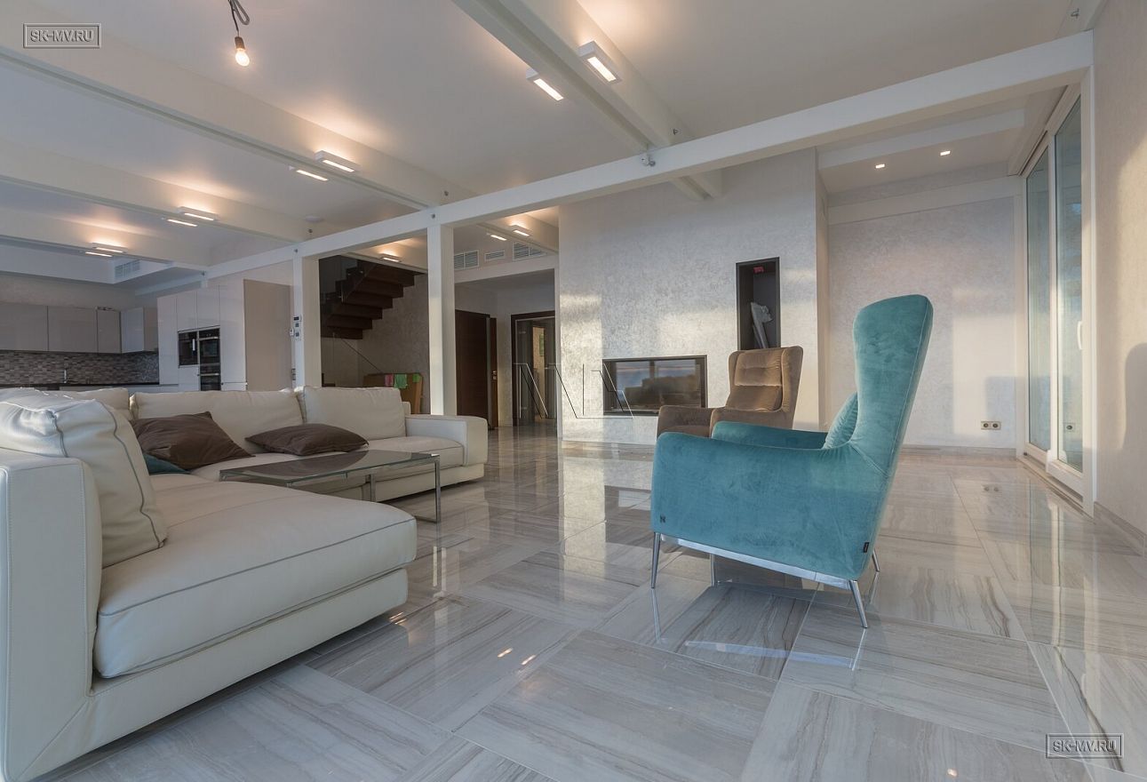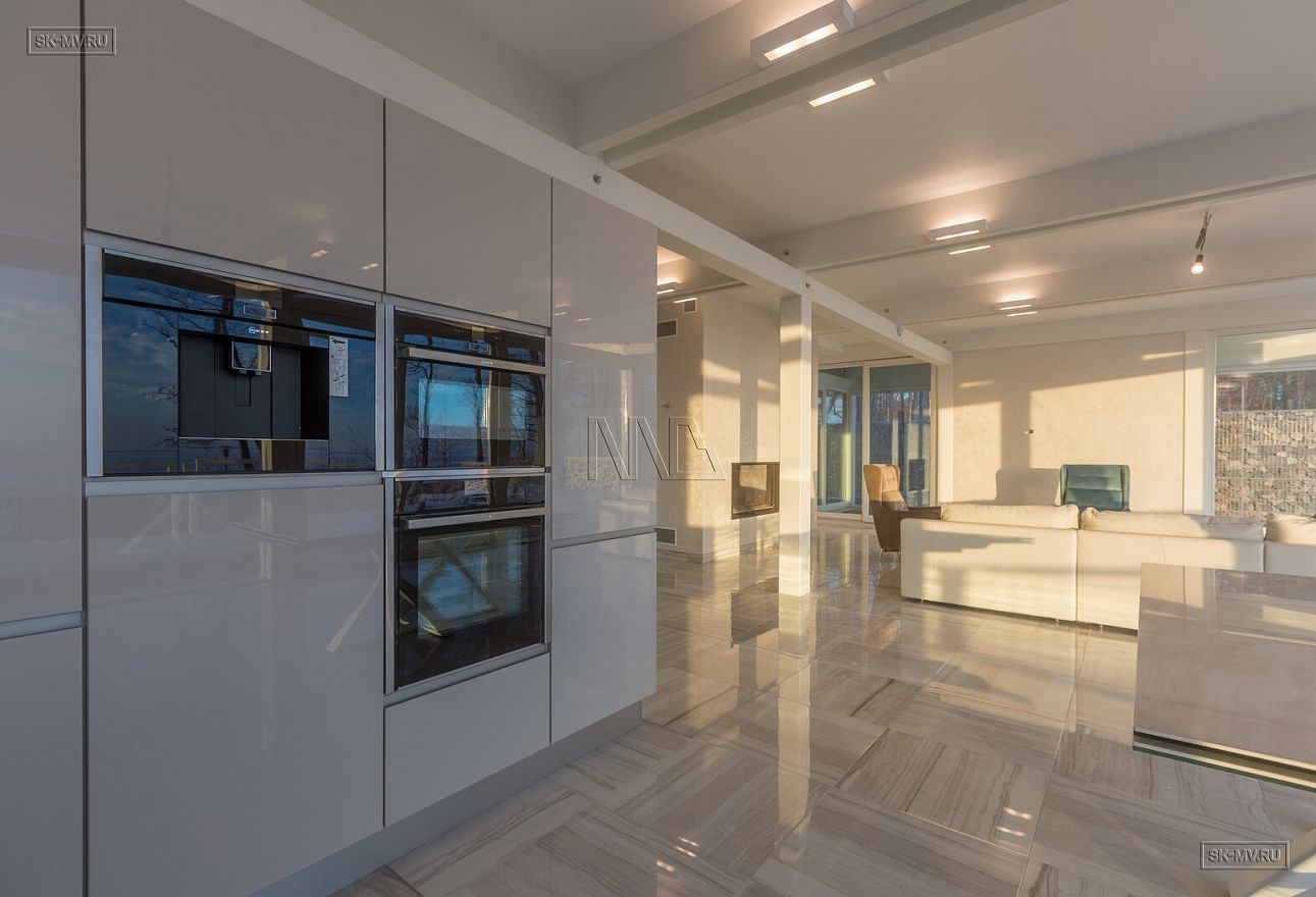 Как организовано пространство дома площадью чуть больше 400 кв.м внутри? Индивидуальный сценарий жизни хозяев продиктовал следующую организацию первого этажа и мансарды. На первом этаже большой кабинет хозяина, просторная открытая зона объединенной кухни-столовой с гостиной и выходом на террасу.