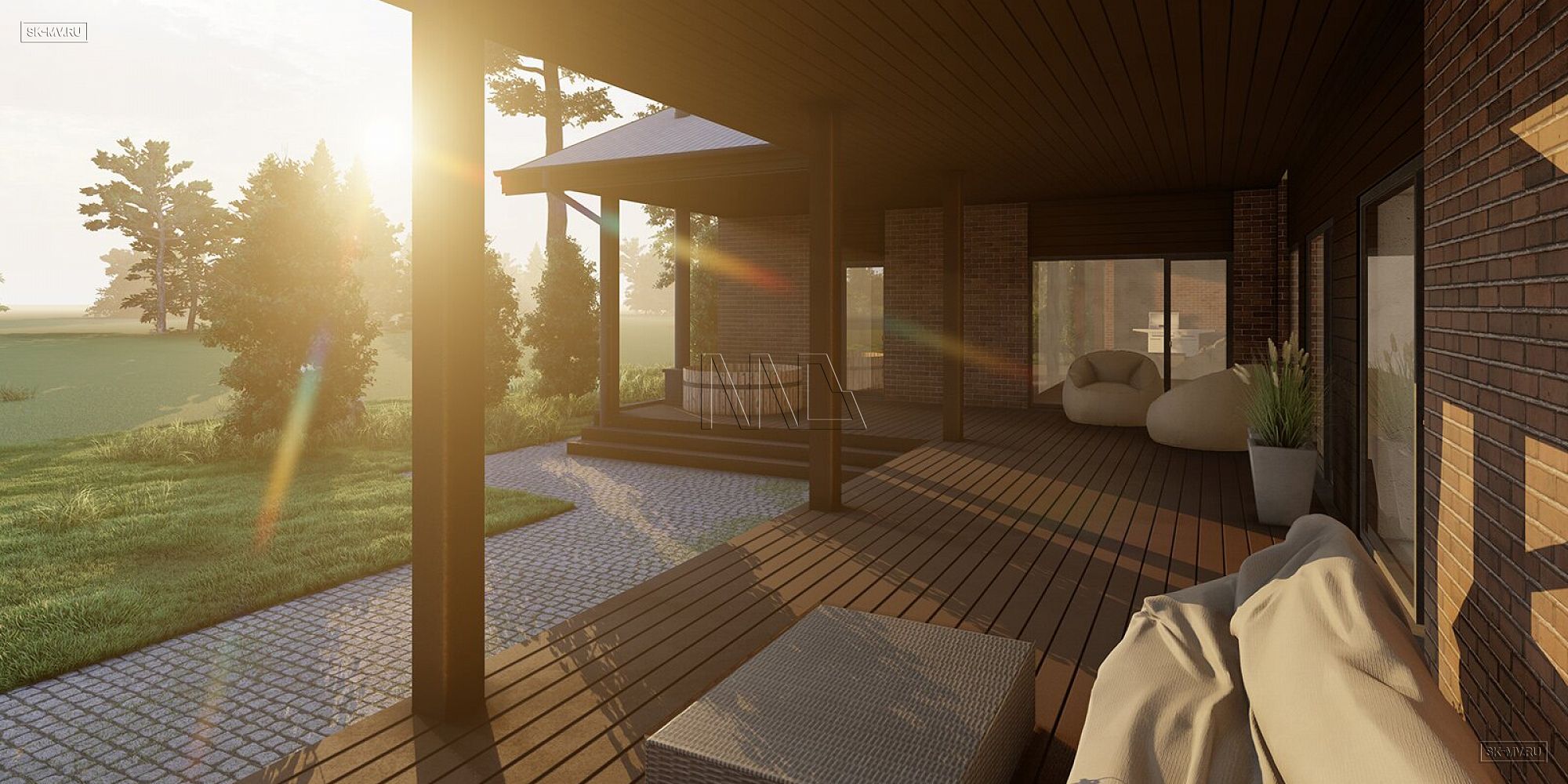 Г-образная форма дома создает приватное пространство, защищенное от ветра и посторонних глаз. Основная часть внутреннего дворика — широкая угловая терраса площадью 70,33 кв.м. На ней расположились две зоны отдыха: одна из них кухня-барбекю с настоящей каменной печью, а вторая — уличная часть спа-комплекса, оборудованная японской баней Фурако. Два выхода на террасу имеет спа-комплекс, есть выход из гостиной и из мастер-спальни.