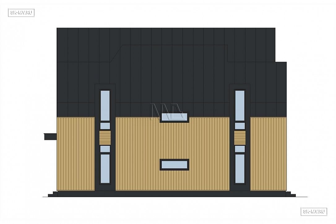 Скандинавский минимализм читается в лаконичности и экономичности формы, а также находит выражение в панорамном остеклении второсветной гостиной с камином и утопленной под фронтонным свесом широкой террасой и балконом.