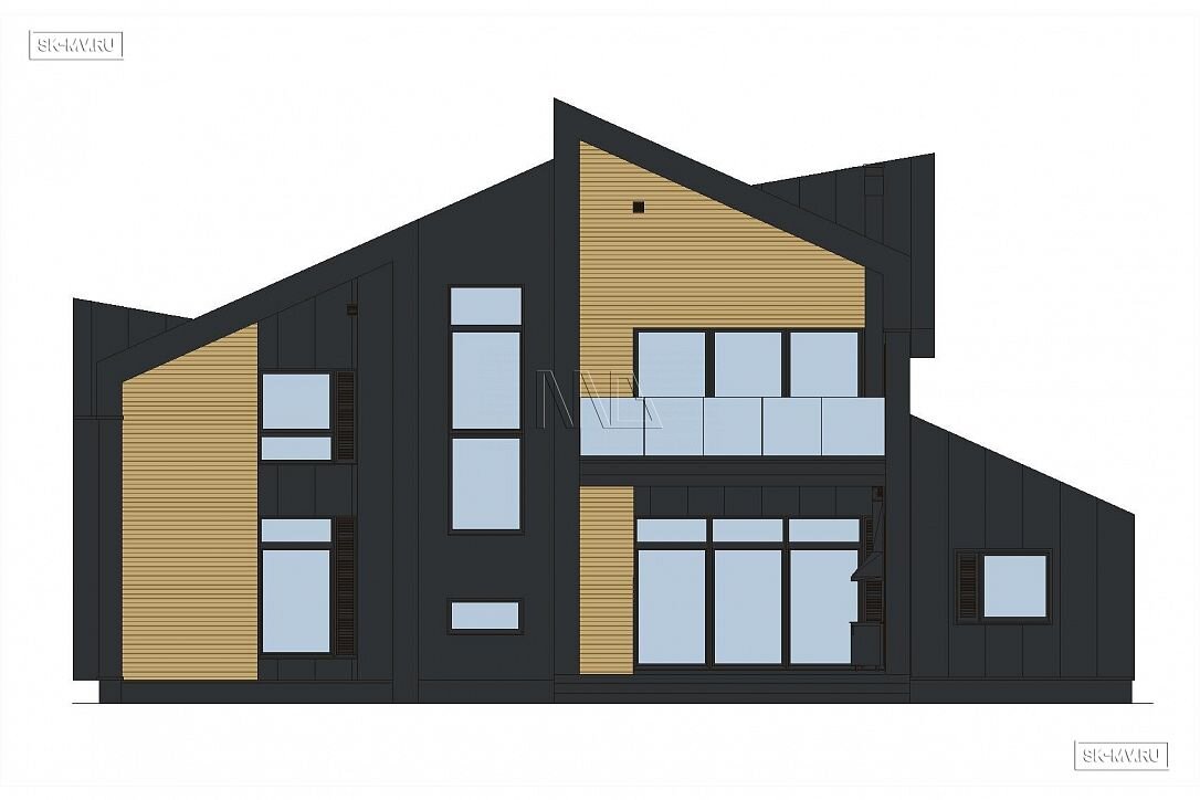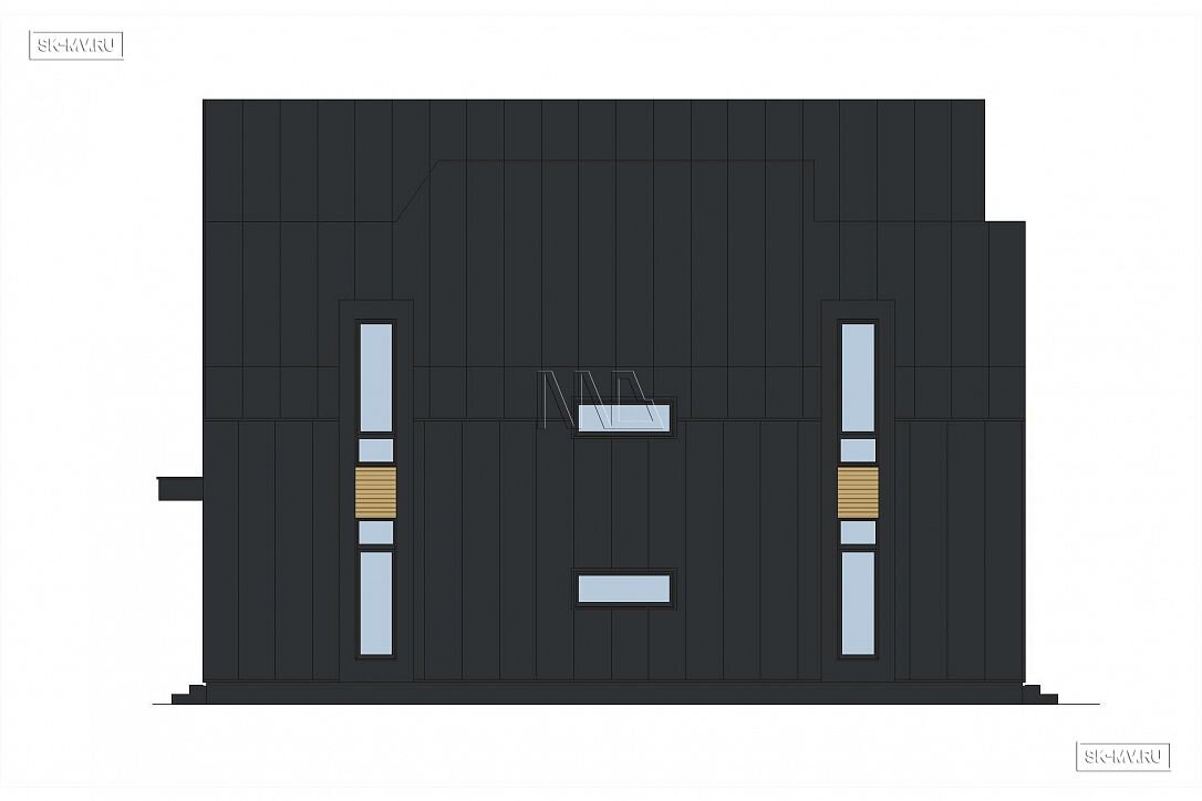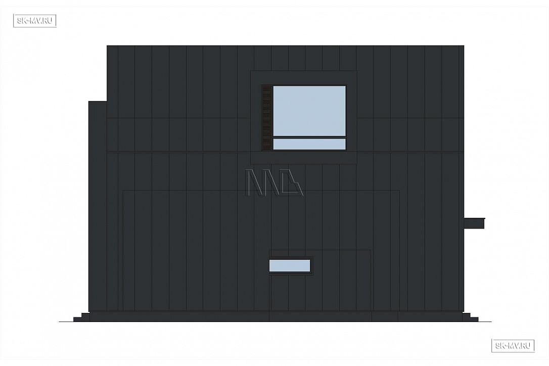 Архитектурный замысел основан на устройстве вентилируемого фасада, объединенного с подкровельным пространством, с плавным переходом кровельного материала на стены без устройства карнизных свесов. При этом металлические фальцевые панели доминируют на фасаде над лиственничным планкеном в соотношении 70/30.