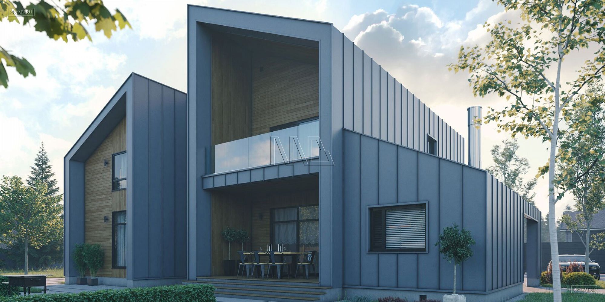 Проект современного загородного дома «Холст Металл» площадью 266,20 кв.м с террасой барбекю и навесом для автомобиля — решение, комбинирующее самые современные тенденции в загородном домостроении.