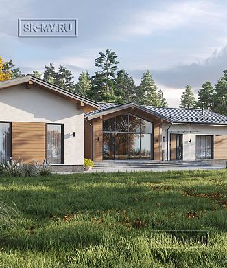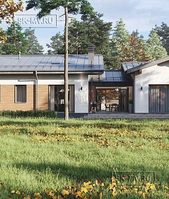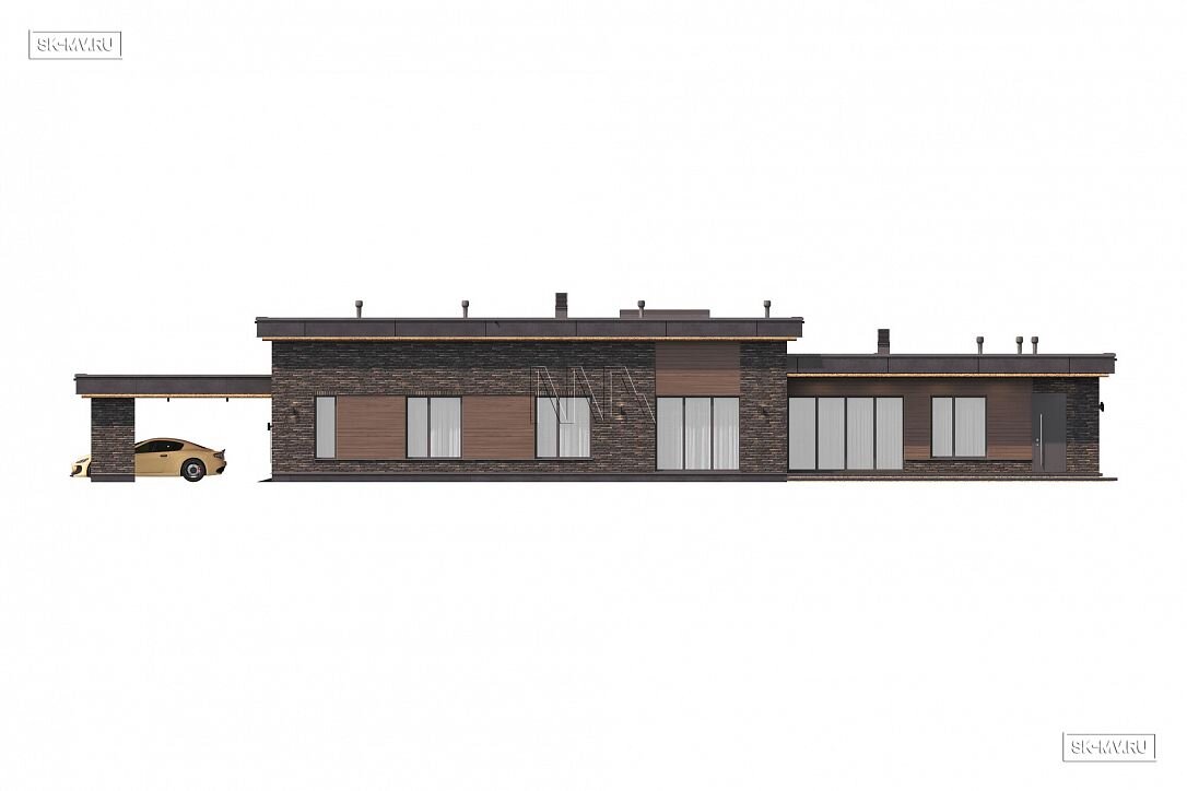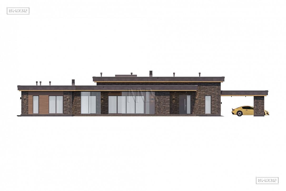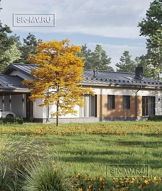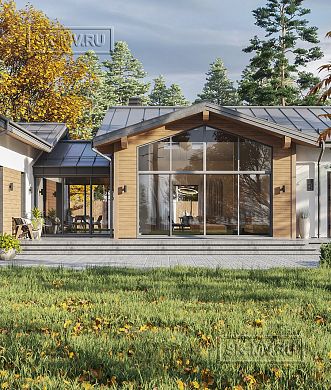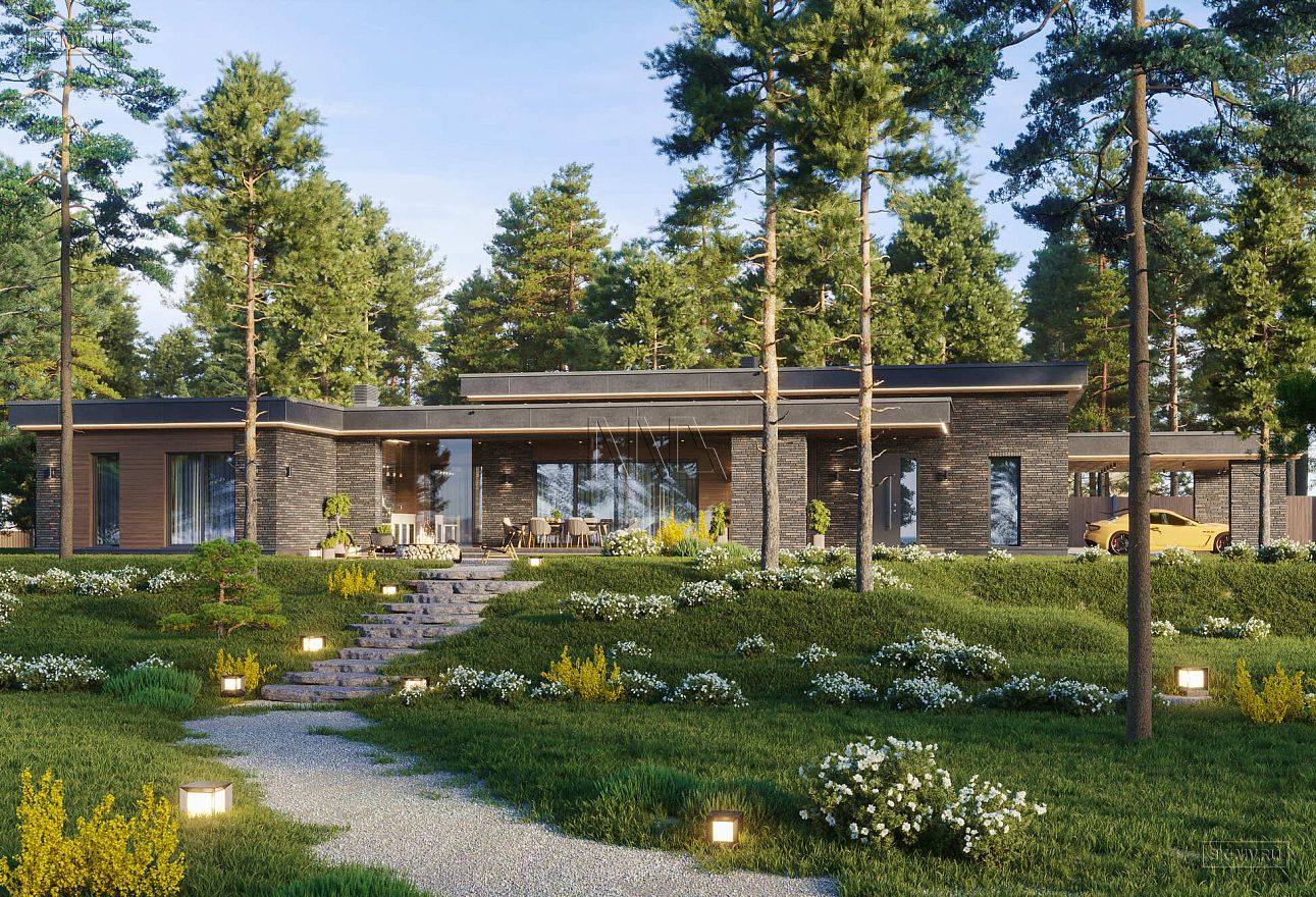 Проект одноэтажного загородного дома «Кириши 2» с мастер-спальней, верандой с раздвижными окнами, сауной и навесом на 2 автомобиля. Площадь дома — 341,32 кв.м.