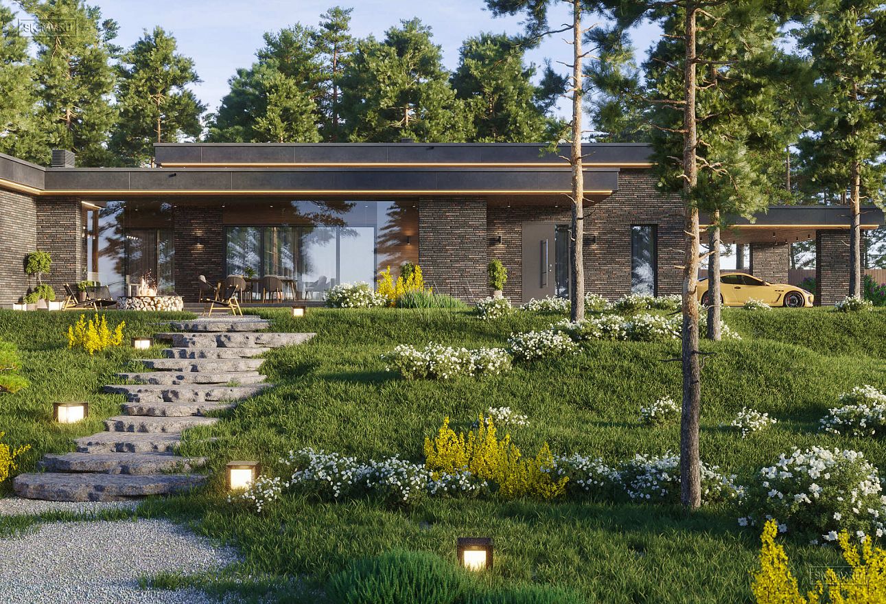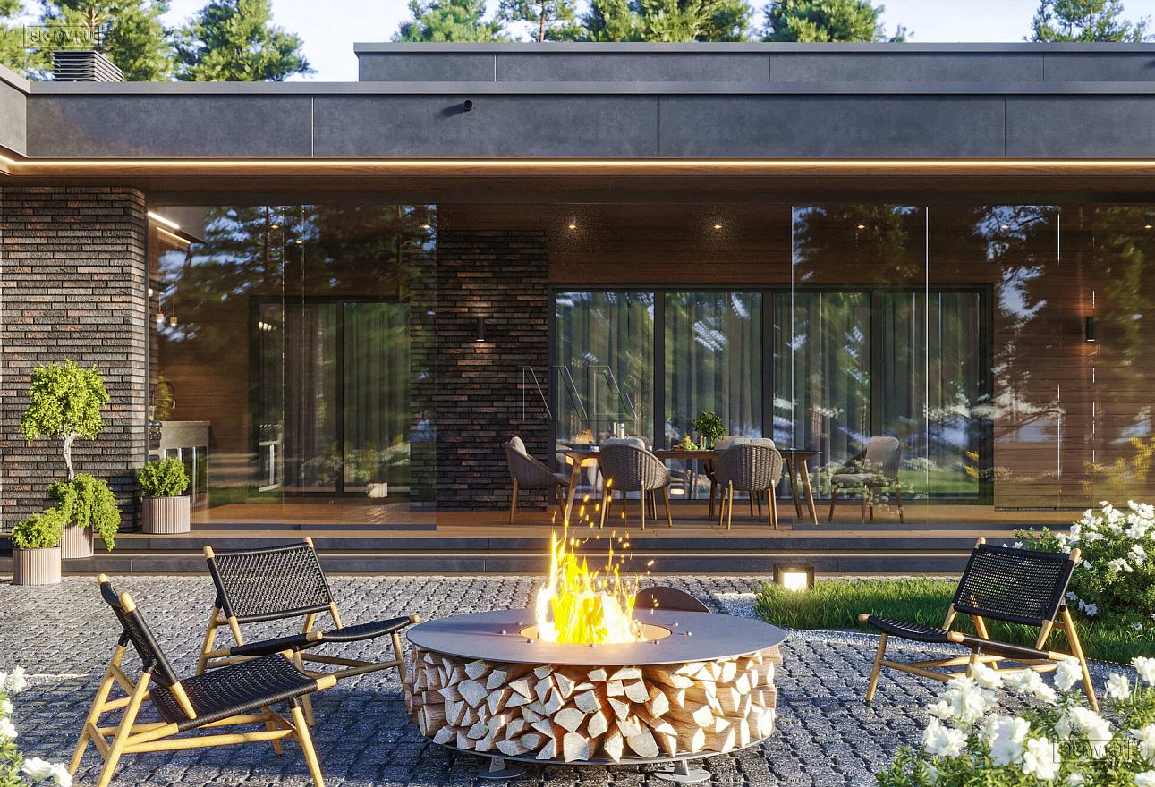 Дом выполнен в современном стиле, что подчеркивают такие элементы, как плоская кровля, темная минималистичная облицовка, широкие панорамные окна в пол. Экстерьер отличается сдержанными натуральными цветами: облицовочный кирпич смешанных оттенков темно-коричневого и дерево благородного каштанового тона.