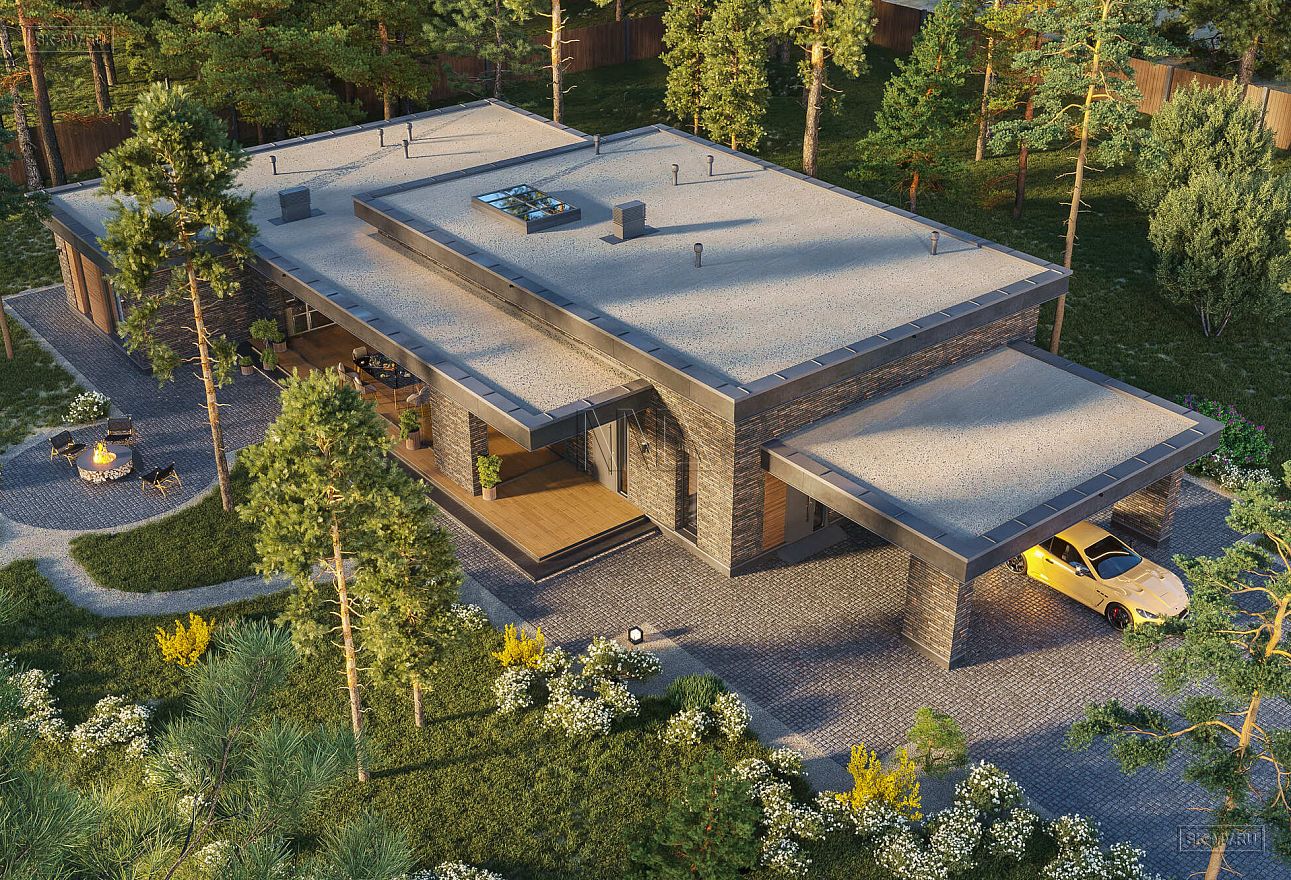 Крыша в этом проекте плоская, неэксплуатируемая. В разных частях дома отметка верхнего уровня отличается, визуально выделяя в здании три зоны: навес для автомобилей, основные жилые помещения, зону для работы и отдыха.