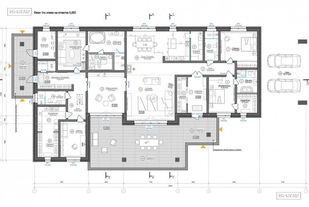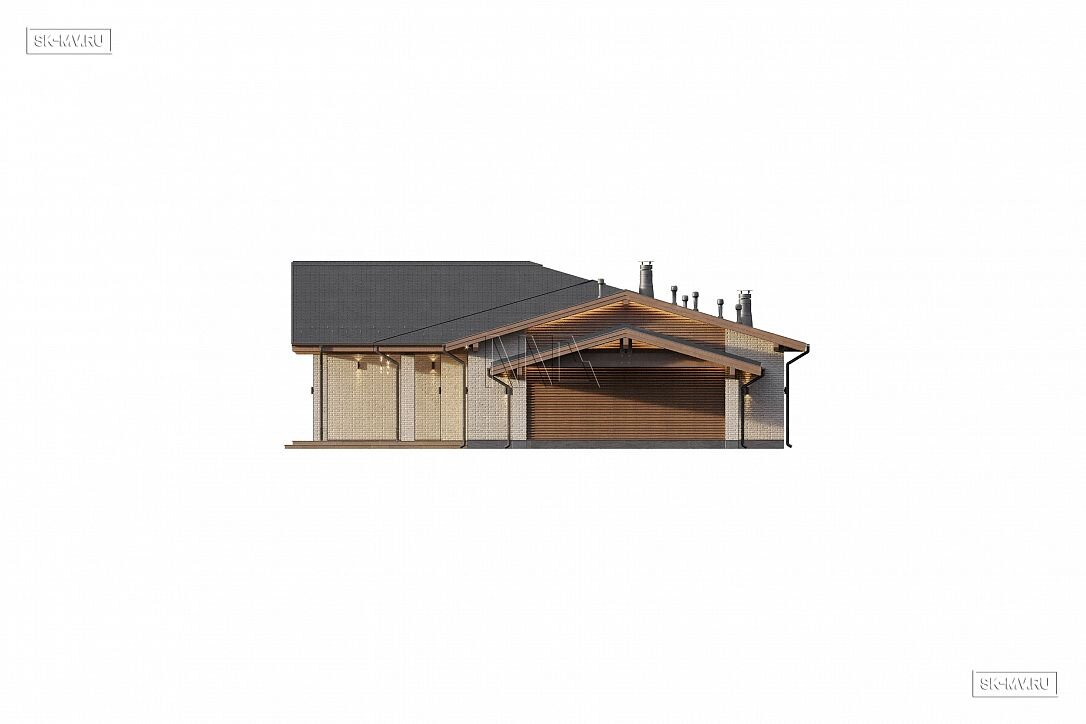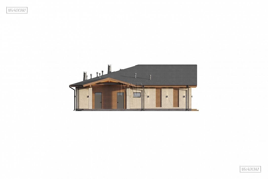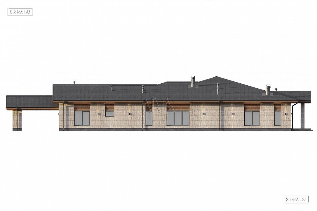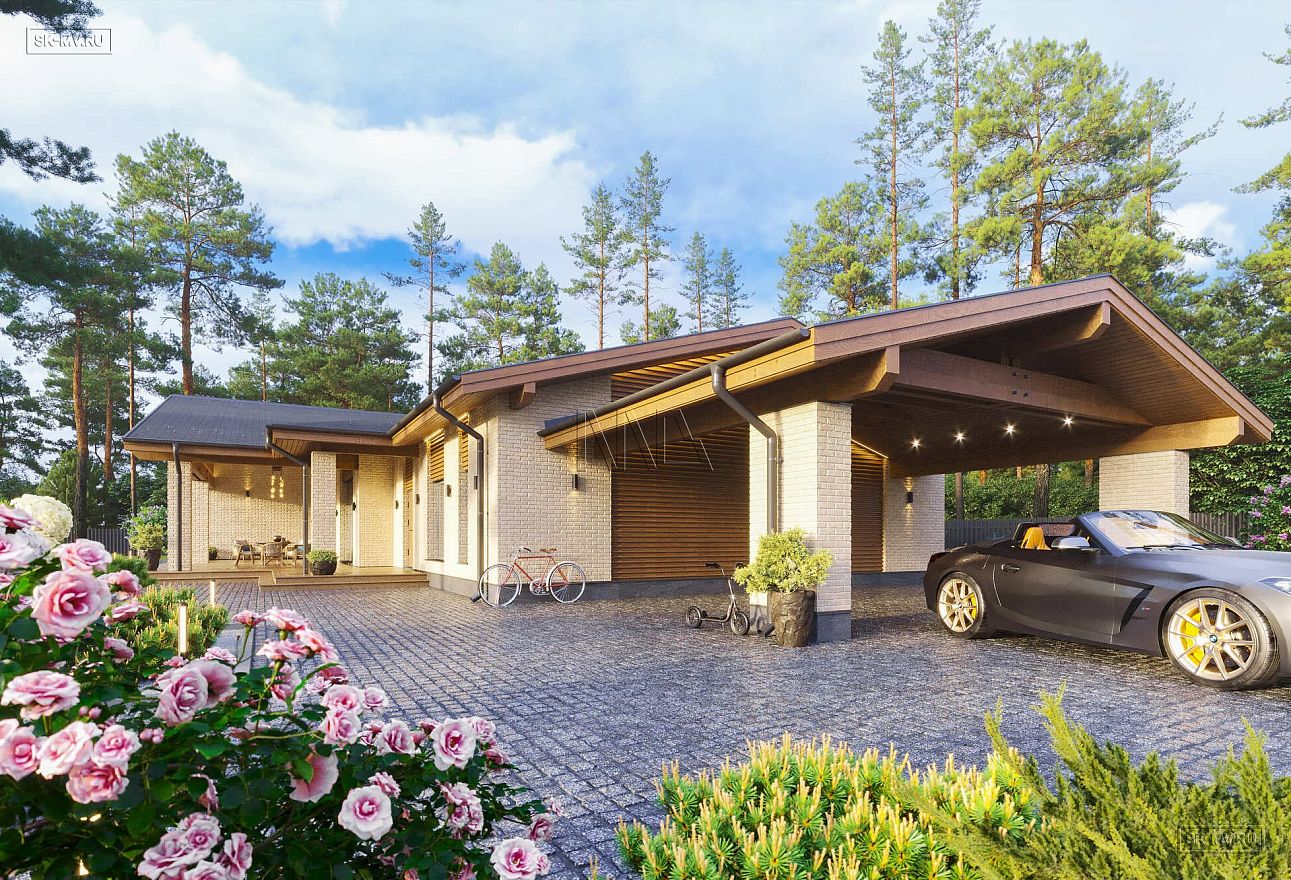 Проект современного одноэтажного загородного дома «Кириши» с мастер-спальней, террасой, СПА зоной и навесом на 2 автомобиля. Площадь дома — 374,33 кв.м.