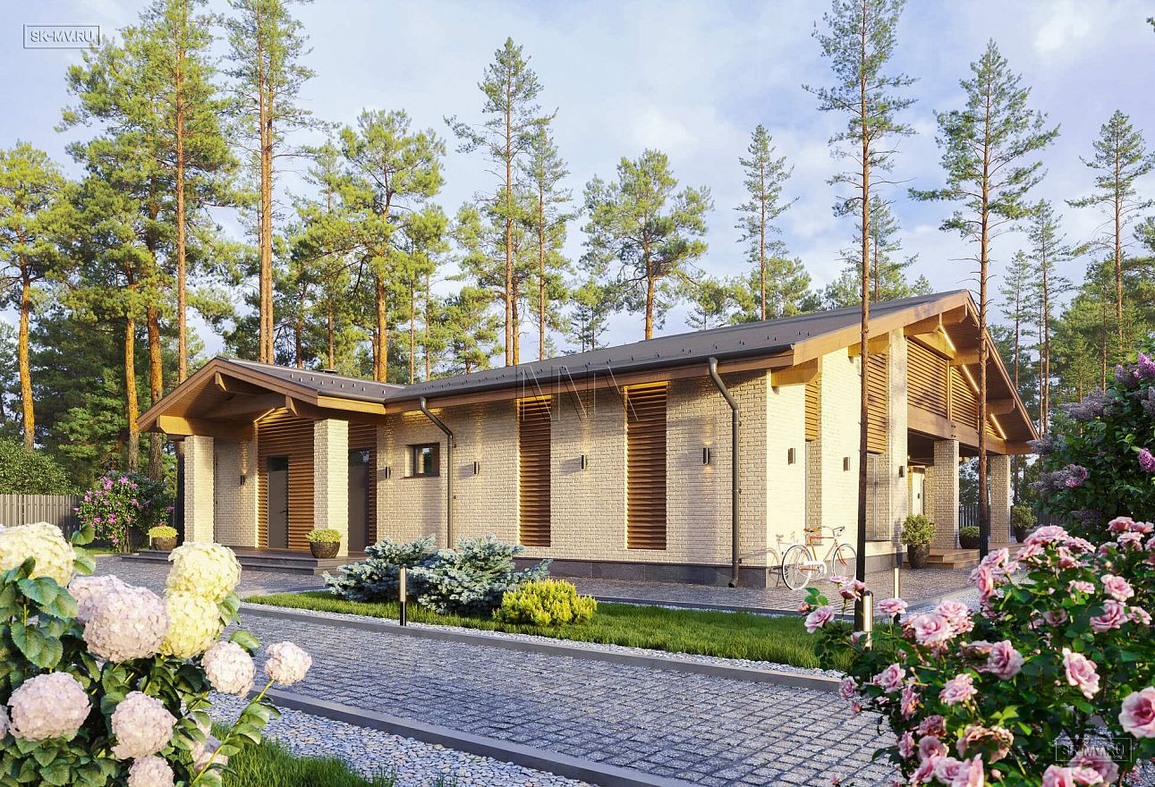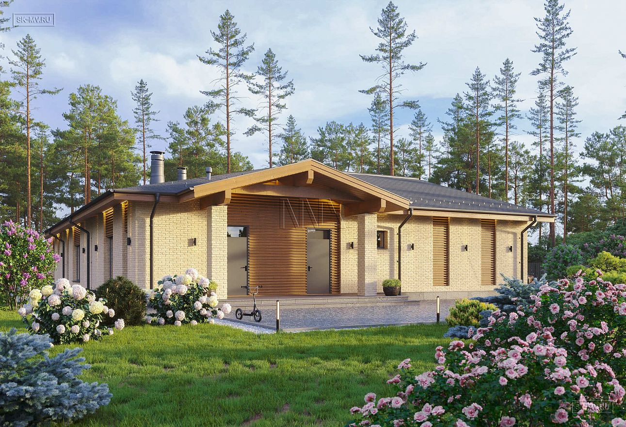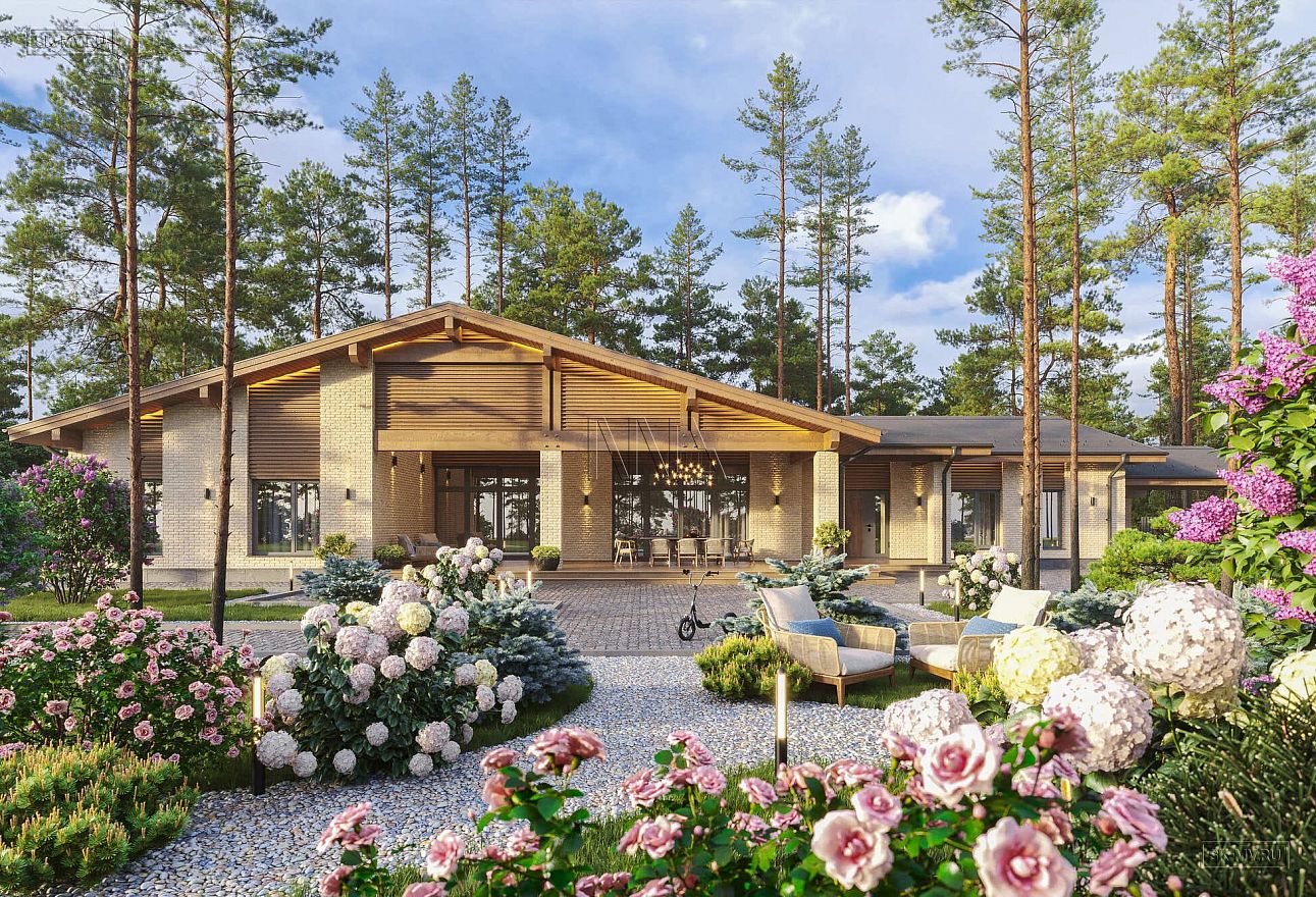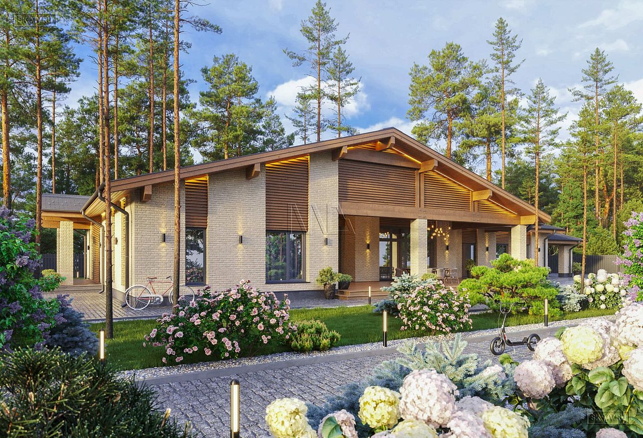 Простая геометрия дома, минимализм в отделке, большие панорамные окна, двухскатная кровля и дерево с видимой текстурой вдохновлены скандинавским стилем. Главная идея экстерьера — естественные цвета. Фасадная отделка привлекает внимание красотой натуральных материалов: облицовочный кирпич нейтральной природной бежевой тональности и дерево красивого насыщенного золотисто-коричневого оттенка.