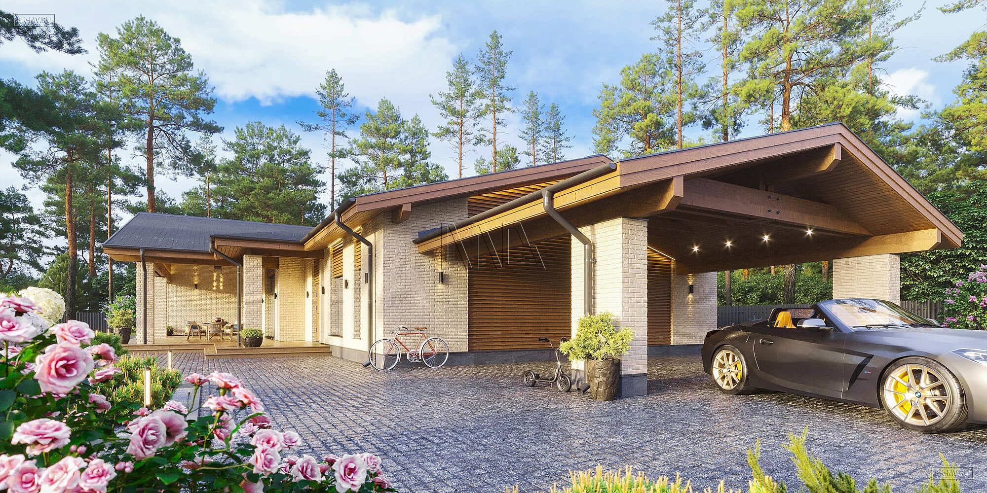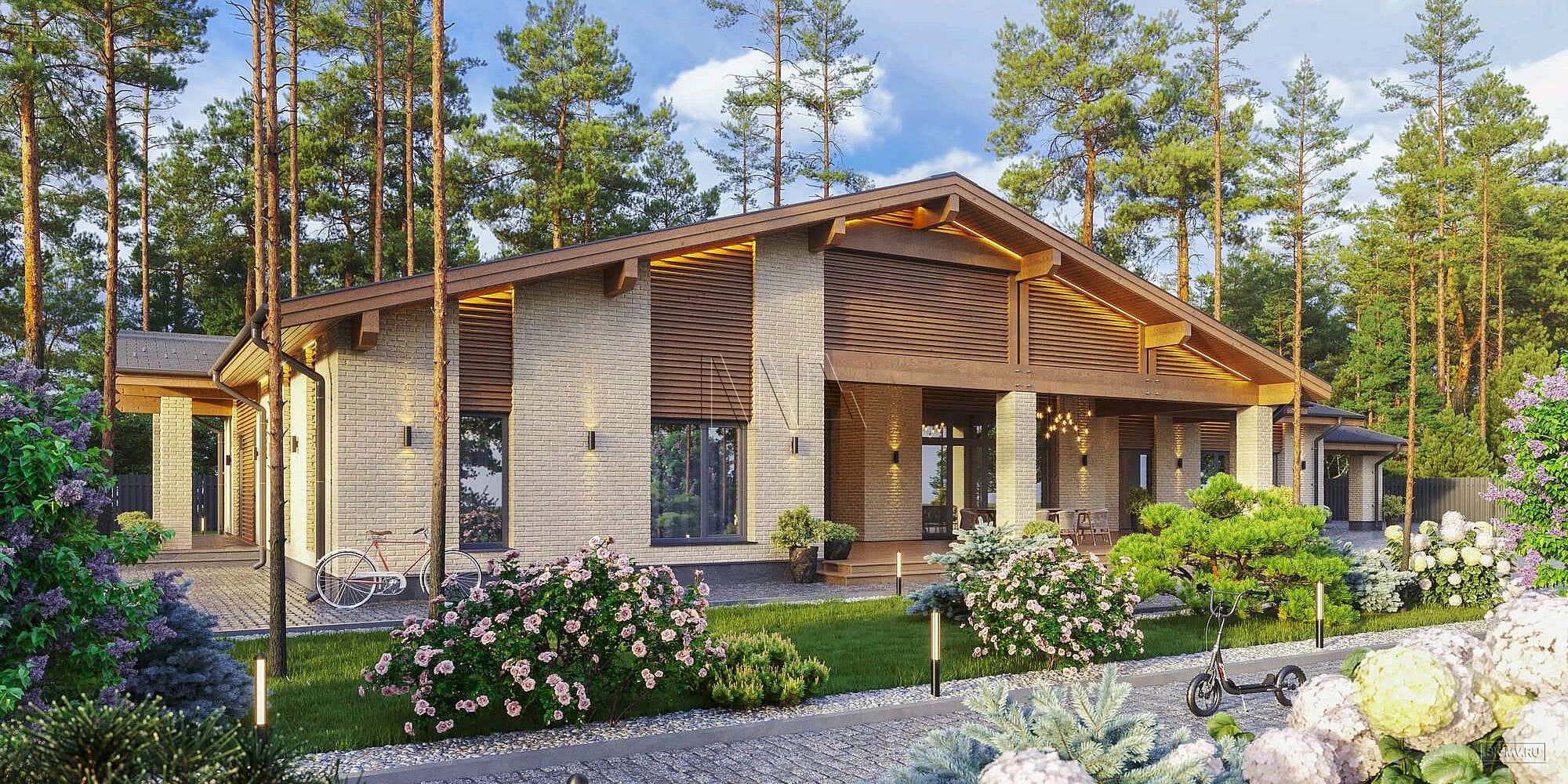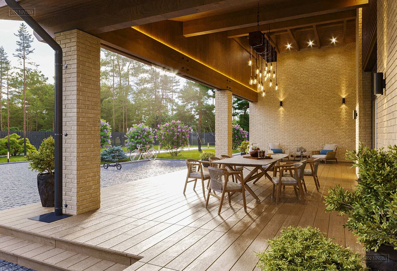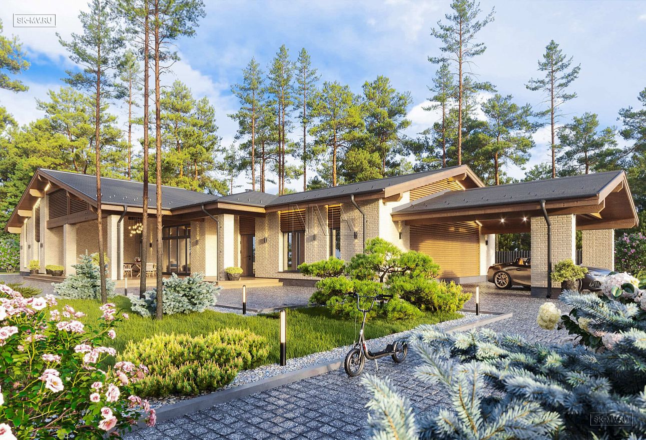 Простая геометрия дома, минимализм в отделке, большие панорамные окна, двухскатная кровля и дерево с видимой текстурой вдохновлены скандинавским стилем. Главная идея экстерьера — естественные цвета. Фасадная отделка привлекает внимание красотой натуральных материалов: облицовочный кирпич нейтральной природной бежевой тональности и дерево красивого насыщенного золотисто-коричневого оттенка.