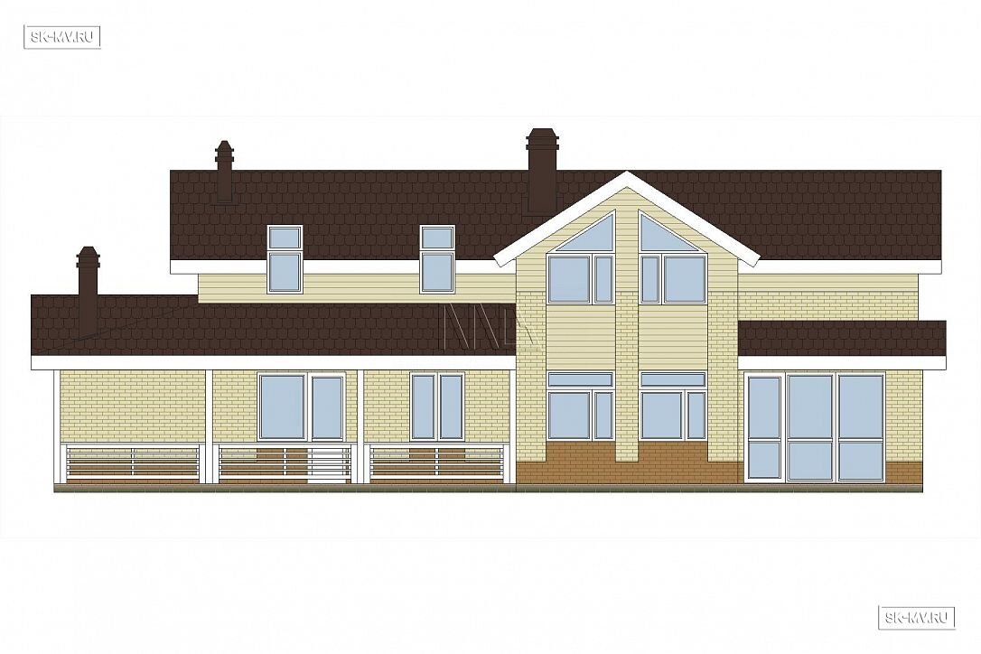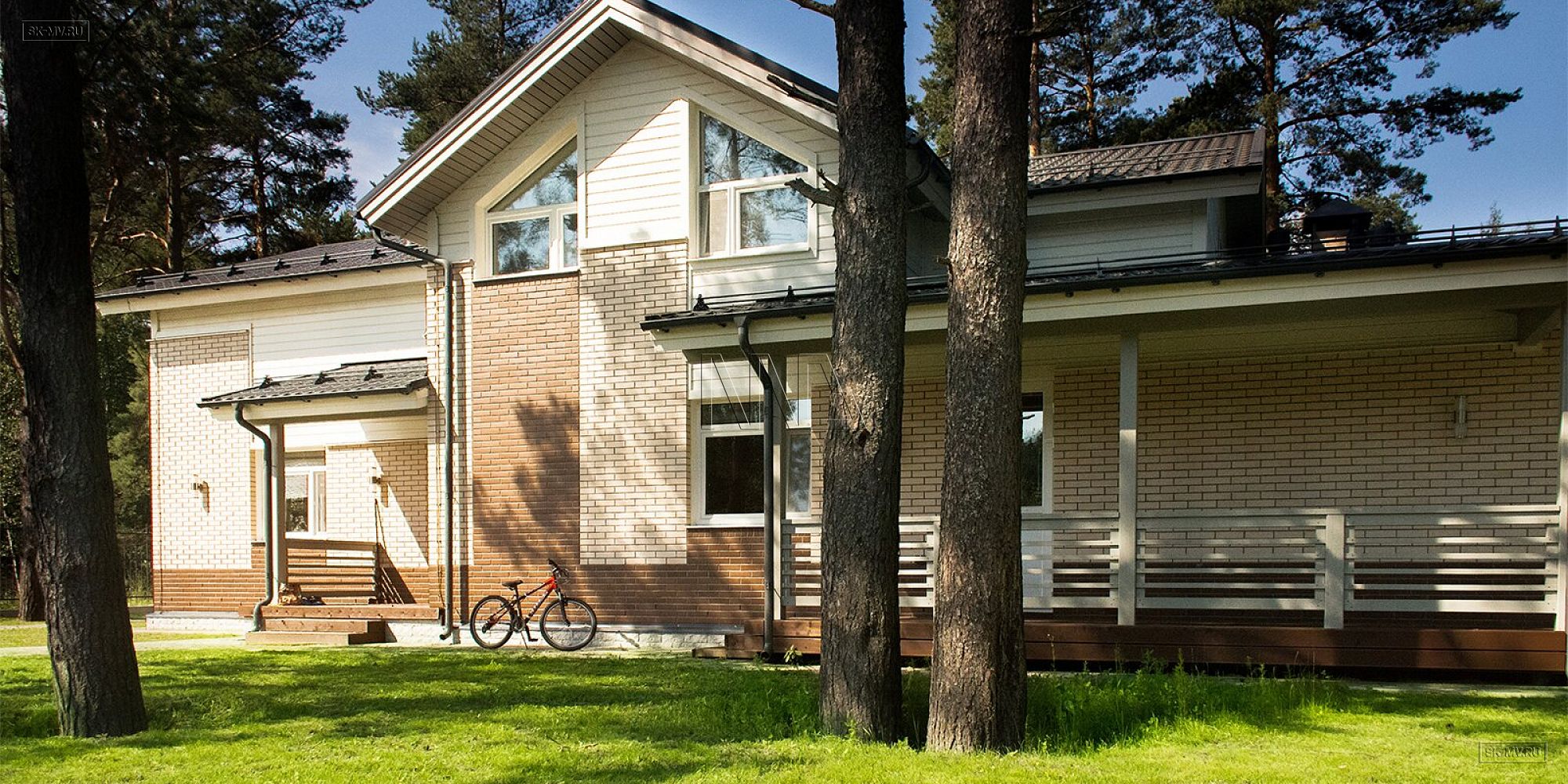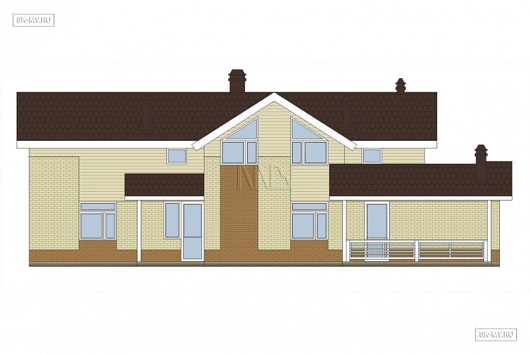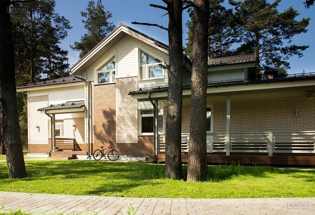 Фасад дома украшен комбинированной отделкой из коричневого и белого кирпича. Мансарда отделана белоснежной вагонкой. Ей в том выполнена подшивка карнизных свесов, окраска наличников, стоек и ограждений террасы. Фасадная отделка очень оригинальна в своем сочетании разноразмерных площадей из разных материалов. Образ дома завершает темно-серая кровля, водостоки и цокольный отлив.