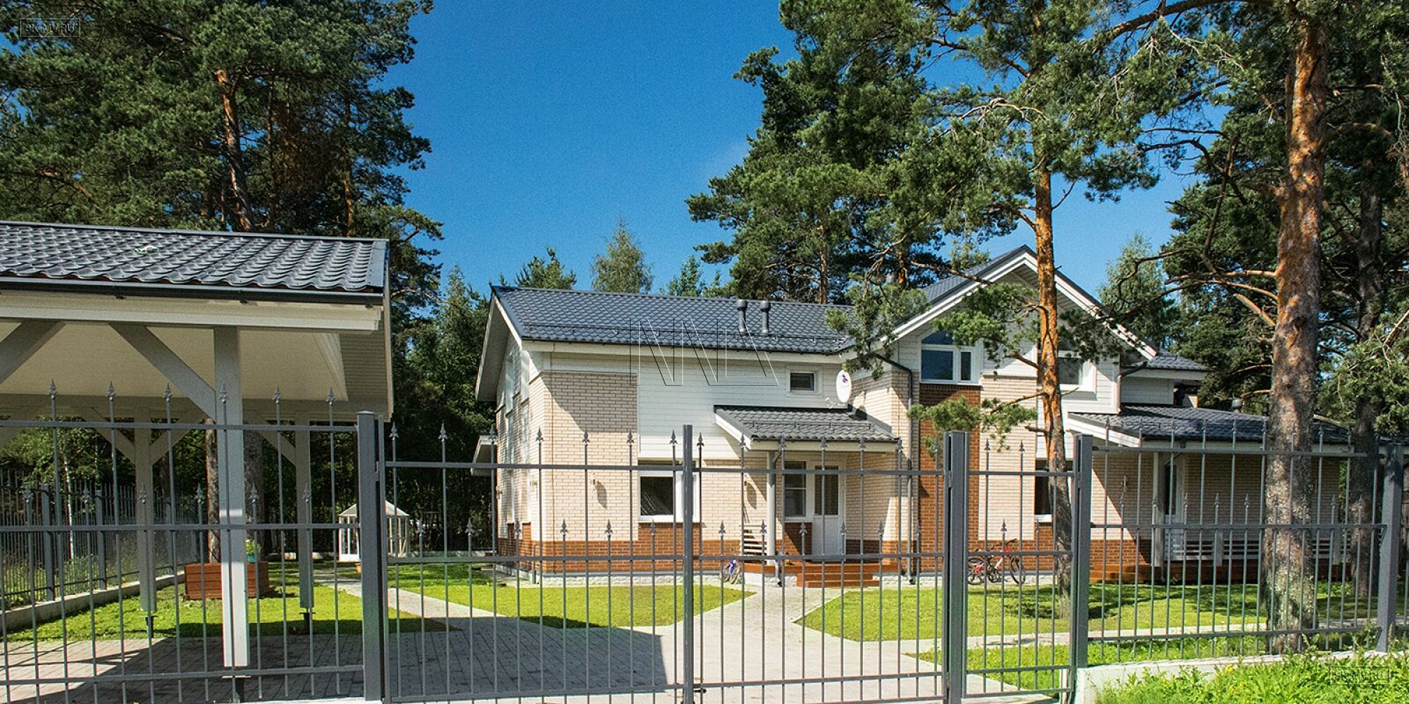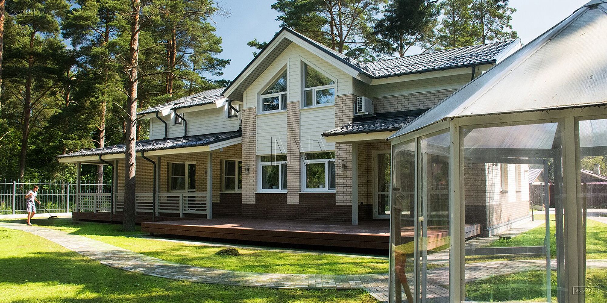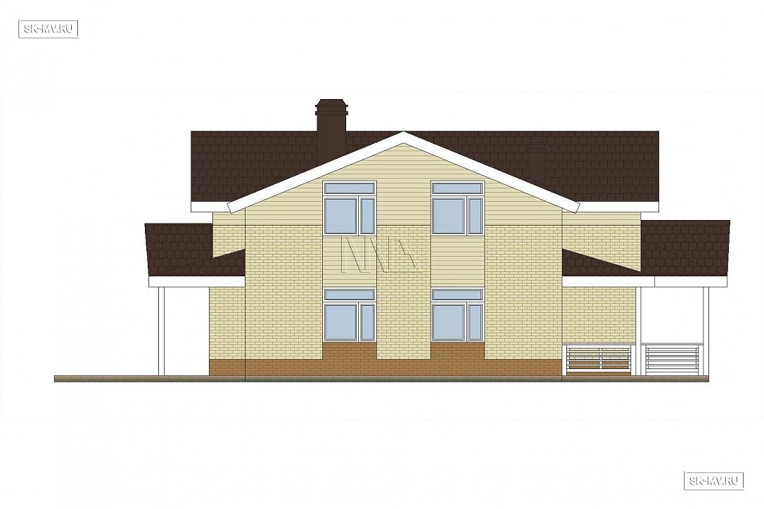 Фасад дома украшен комбинированной отделкой из коричневого и белого кирпича. Мансарда отделана белоснежной вагонкой. Ей в том выполнена подшивка карнизных свесов, окраска наличников, стоек и ограждений террасы. Фасадная отделка очень оригинальна в своем сочетании разноразмерных площадей из разных материалов. Образ дома завершает темно-серая кровля, водостоки и цокольный отлив.