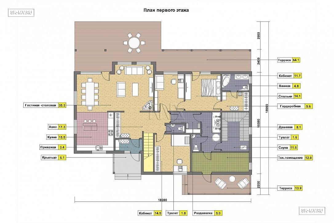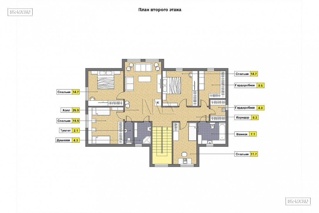 Проект «Лебяжье» — комбинированный дом с мансардой площадью 310 кв.м с семью спальнями для очень большой семьи. На первом этаже три спальни, которые могут стать кабинетом или мастерской. На мансардном этаже еще четыре спальни и большая гардеробная на всю семью.