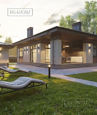 Проект современного одноэтажного загородного дома «Луга» в стиле барнхаус с крытой теплой террасой. Площадь дома — 222,92 кв.м.