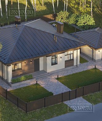 Широкая облицовочная доска — имитатор бруса — крепится вертикально, что создает иллюзию того, что одноэтажный удлиненный дом расправляется и выглядит выше. Доска пропитывается защитными составами и покрывается 2-3 слоями укрывного антисептика в цвет фальцевой кровли.