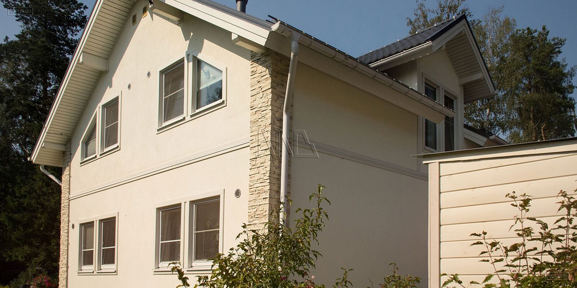 Выразительный эркер с высокими панорамными окнами, окруженный широкой террасой для летнего отдыха — центр архитектурной композиции этого дома. Много стекла, светлая штукатурка, песочного цвета неровный рустовый камень придают дому легкость.