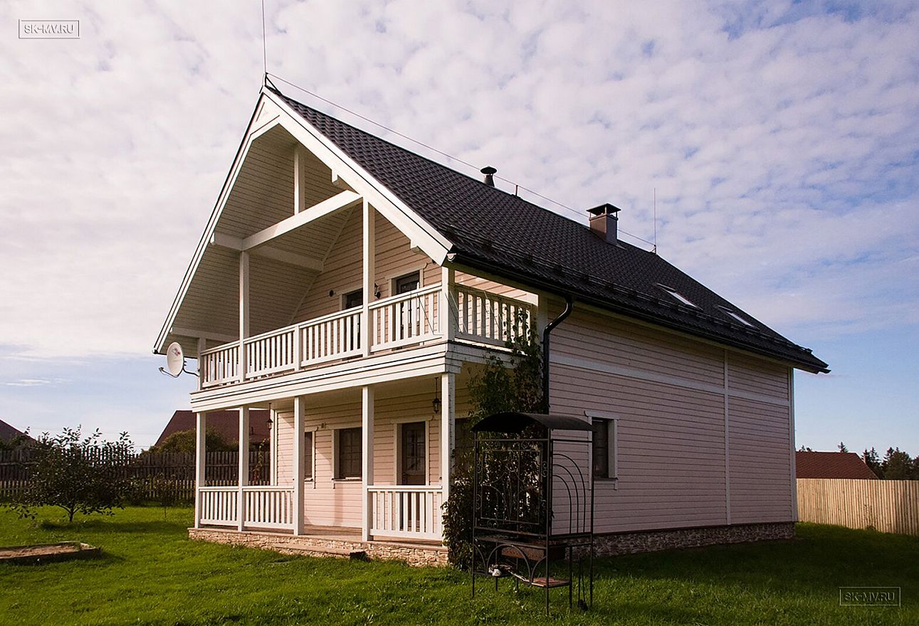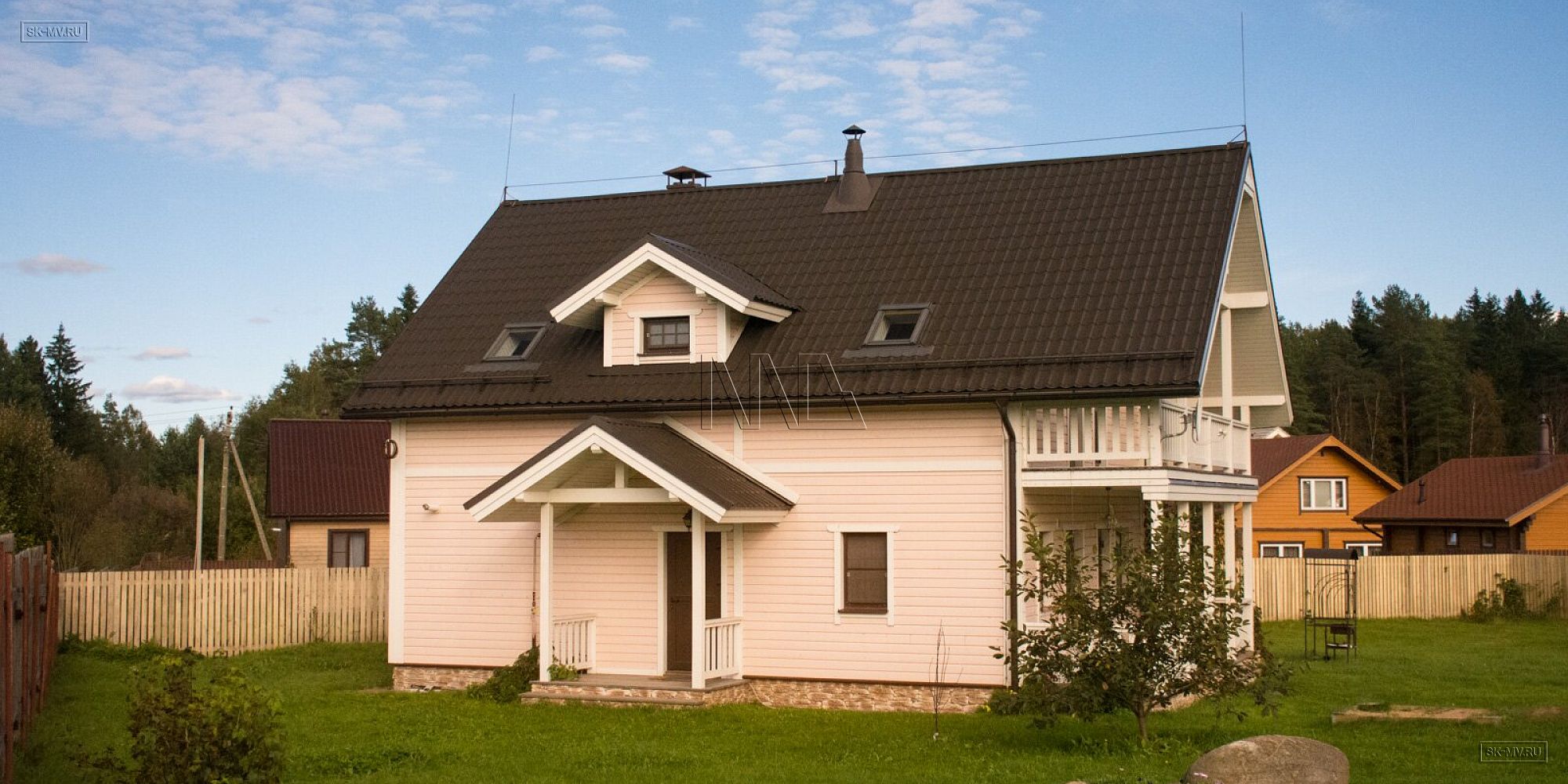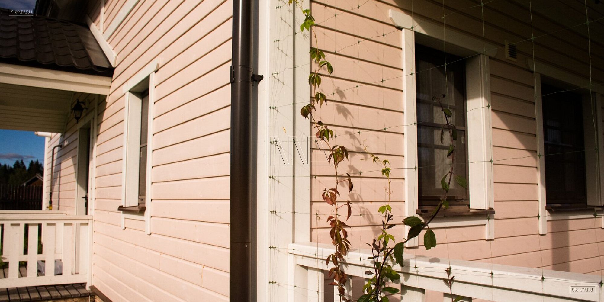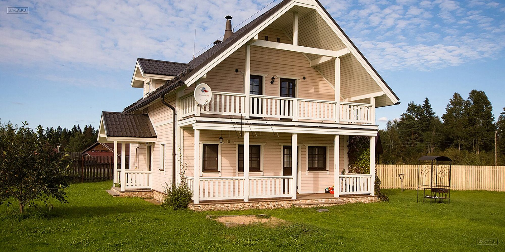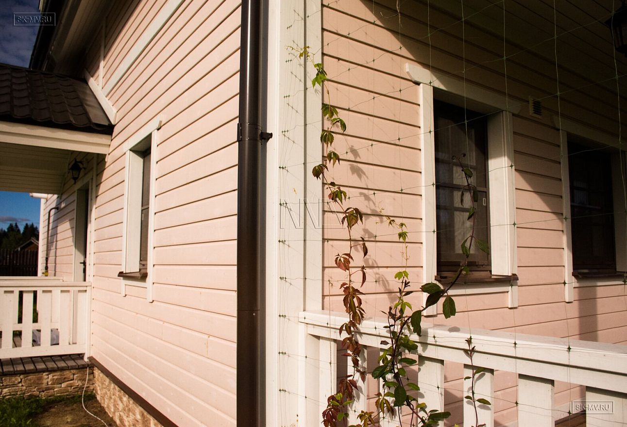 Фасадная отделка деревянной отделочной доской с окраской в сдержанный розовый цвет в сочетании с коричневой кровлей и декоративными планками, подшивкой, стойками и ограждениями белого цвета — типичная скандинавская классическая архитектура.