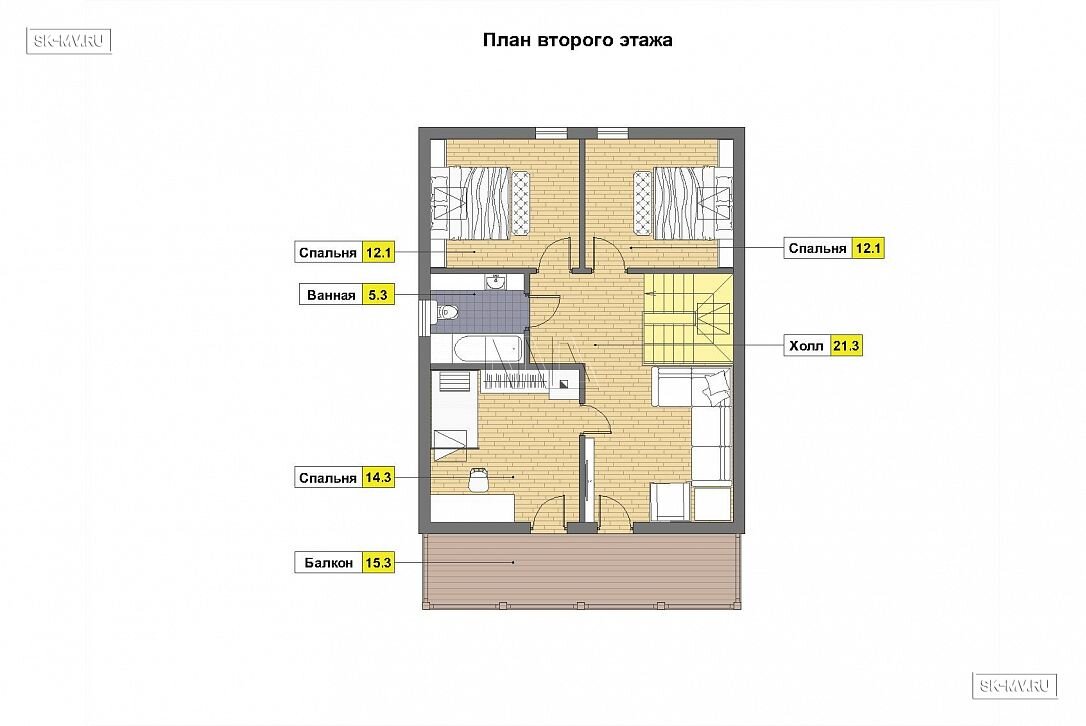 Планировка сделана очень грамотно согласно пожеланиям хозяев. На первом этаже объединенная с гостиной кухня с выходом на террасу. Не забыта и кладовка для хранения продуктов, сезонных вещей и консервации. В доме четыре спальни. Одна на нижнем этаже и три на мансарде с выходом на широкий балкон.