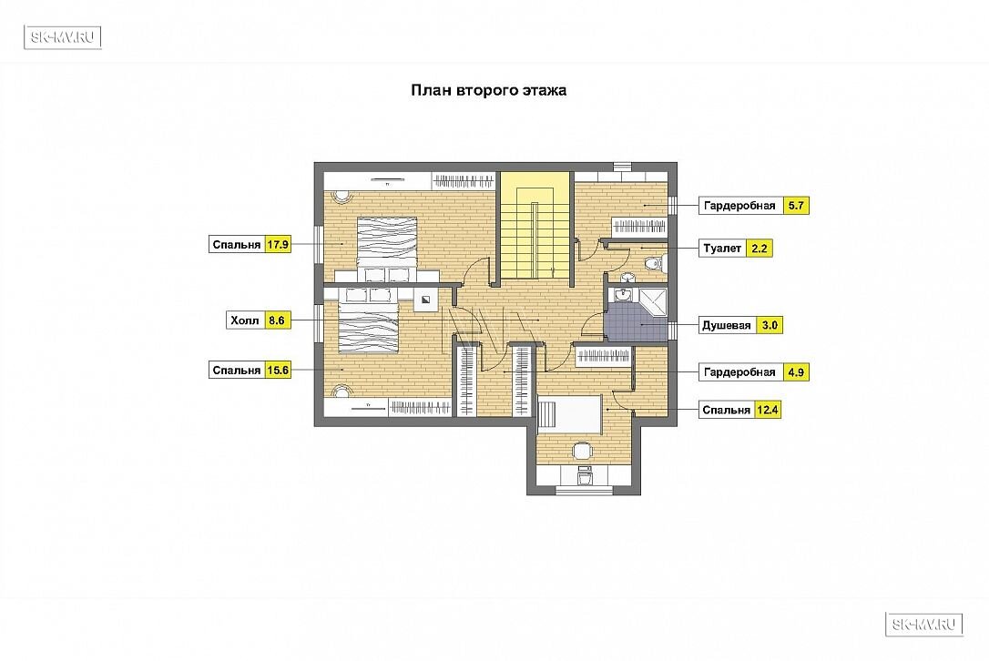 Внутри дома очень все рационально и скромно. Большая гостиная разделенная с кухней аркой и выходом на террасу. Небольшая спальня на первом этаже. Три спальни на втором этаже. Еще две большие общие гардеробные.