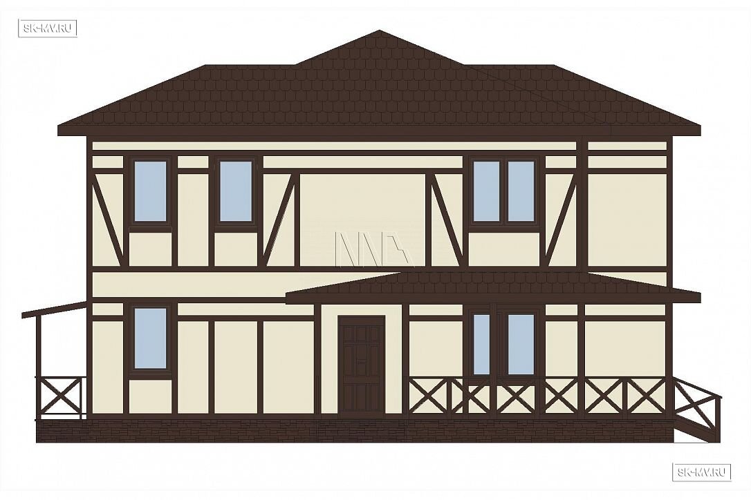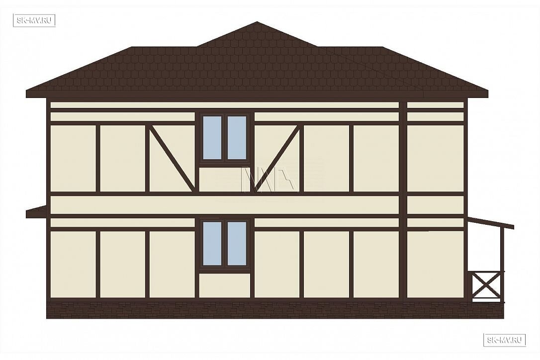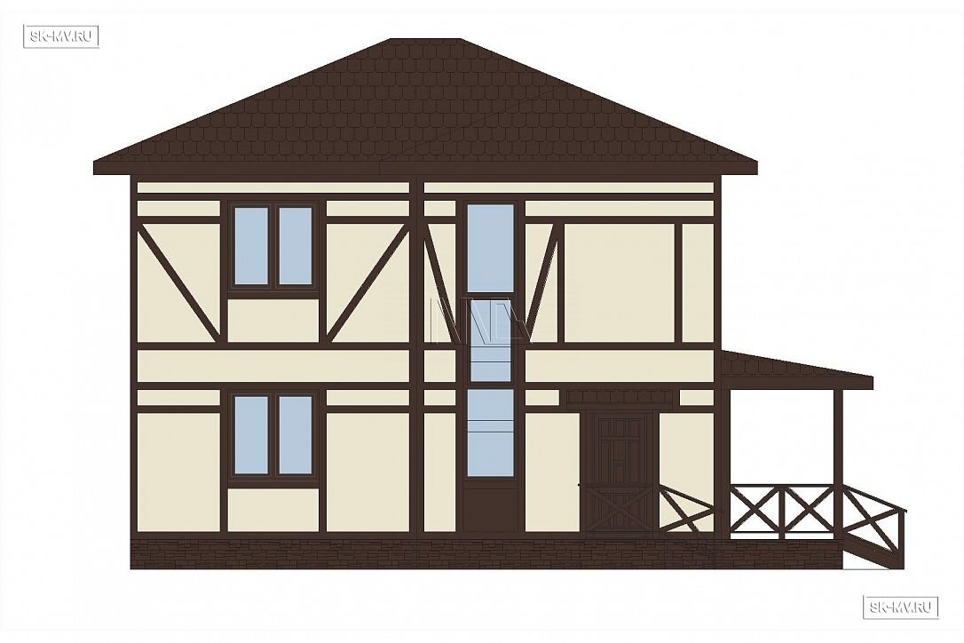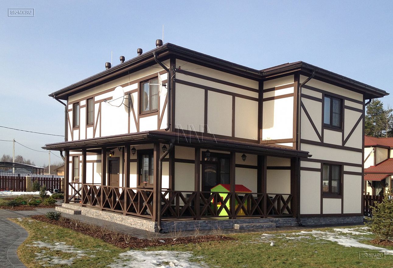 Проект современного двухэтажного дома в стиле фахверк площадью 170 кв.м с большой террасой и балконами. Именно такой стиль традиционно представлен в журналах и на страницах в сети. И с точки зрения загородного домостроения все же нужно различать традиционный фахверк и технологию строительства домов в стиле нового конструктивизма из дерева и стекла.