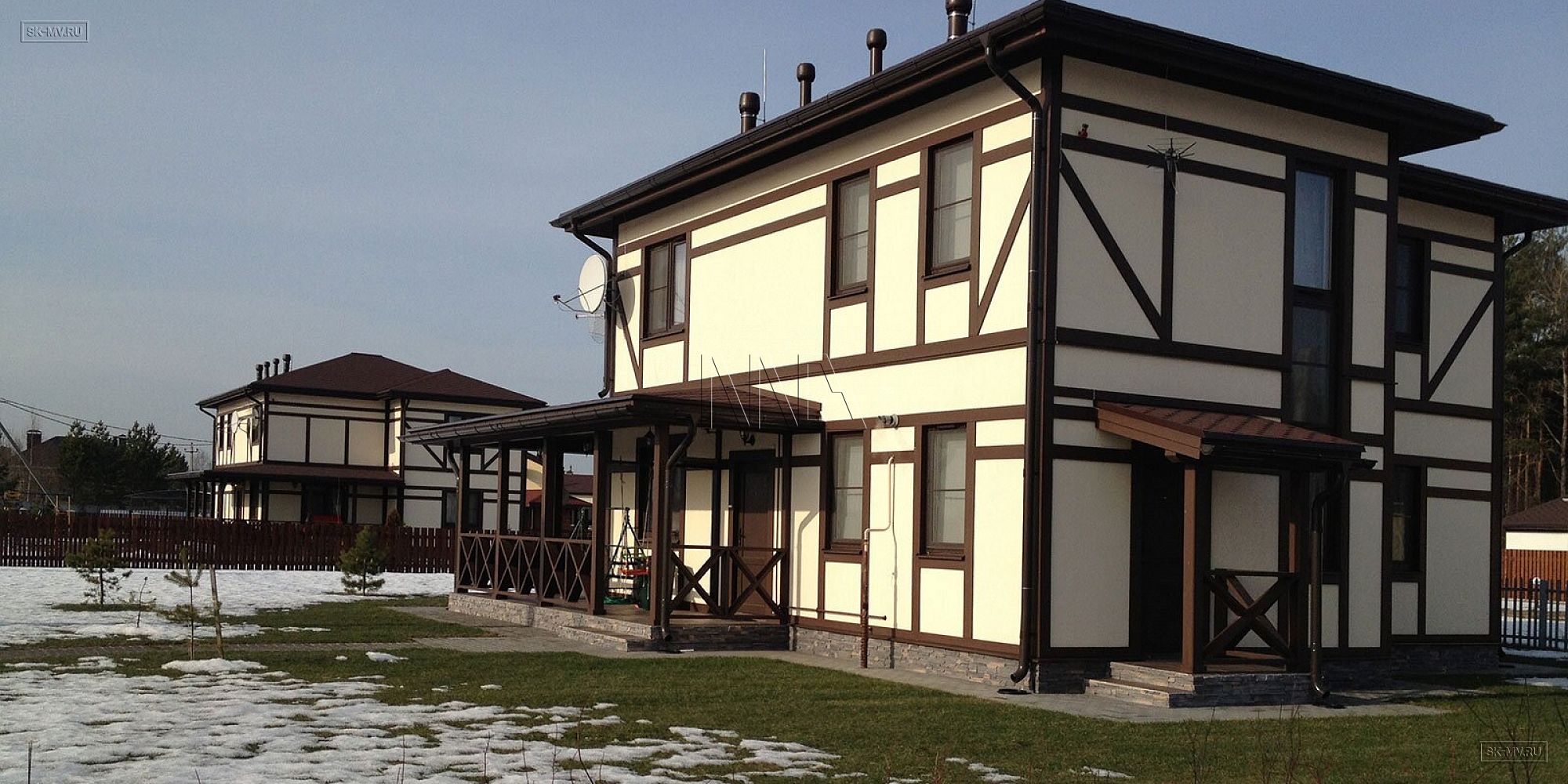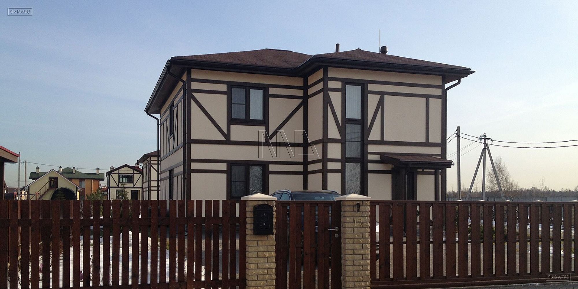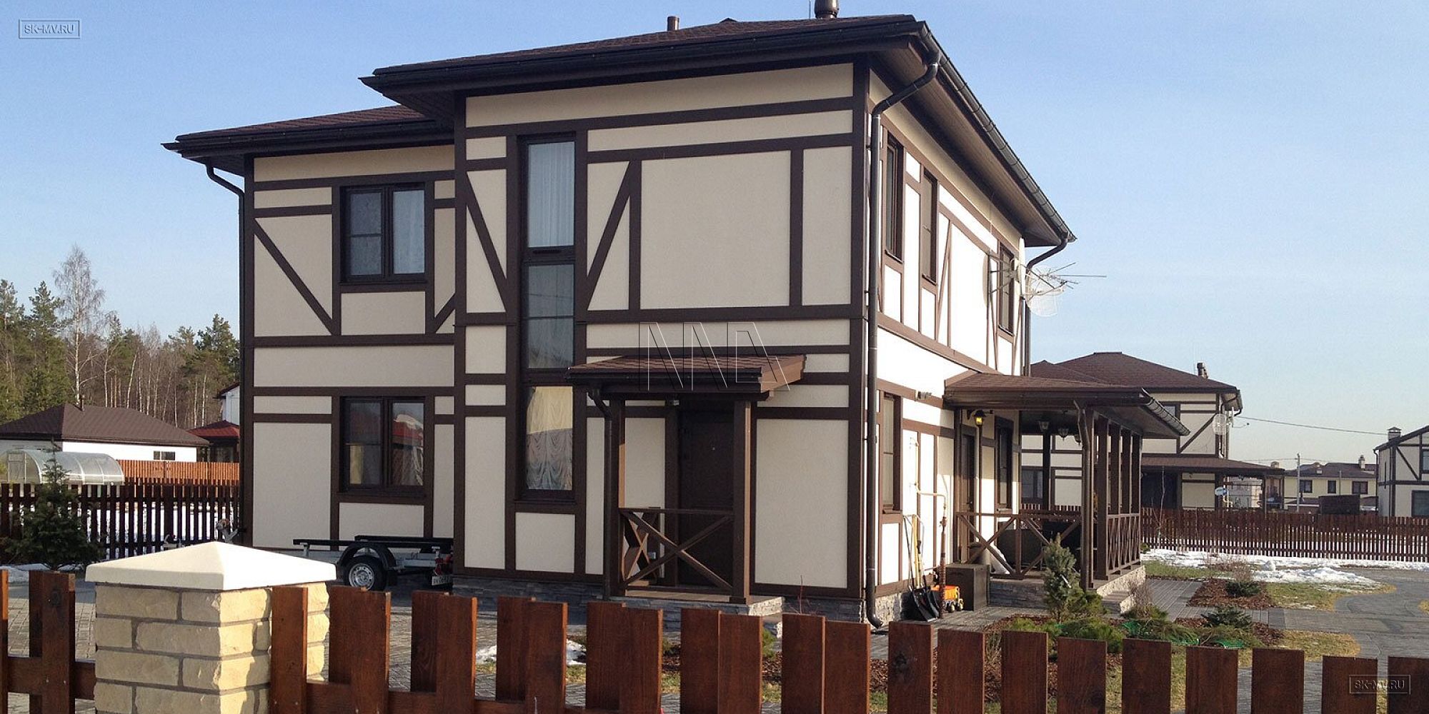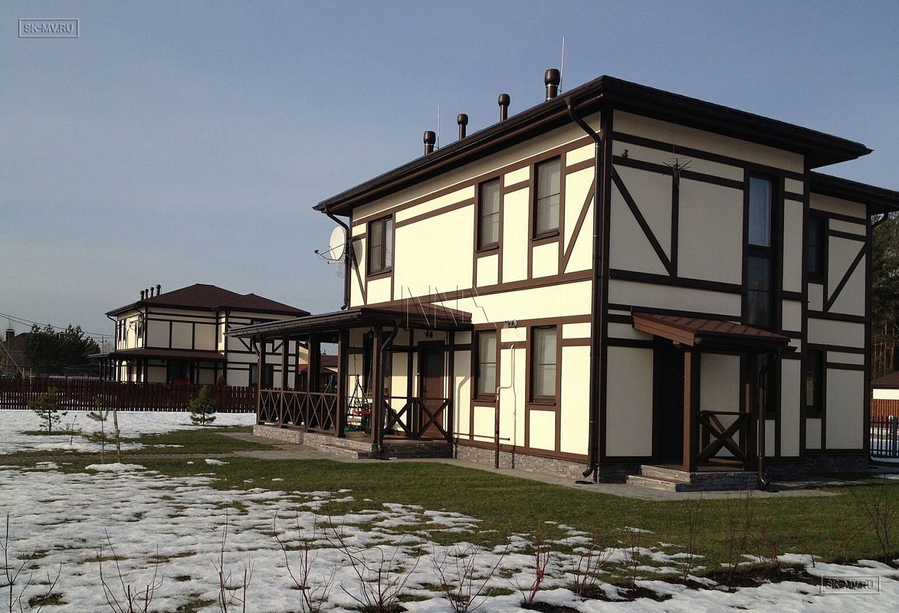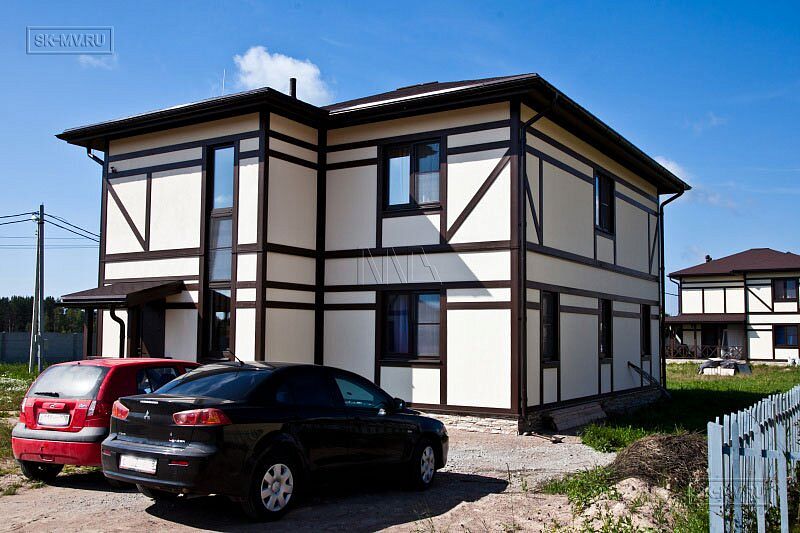 Архитектурное решение проекта «Парквэй» представляет собой сочетание современных технологий строительства энергоэффективного дома со стилизацией фасада под традиционную немецкую архитектуру. Имитация каркаса из темного дерева в стиле фахверк подразумевает использование коричневых деревянных декоративных балок и планок на белом оштукатуренном фасаде. Темно-коричневая кровля, террасы и балконы дополняют желаемый образ.