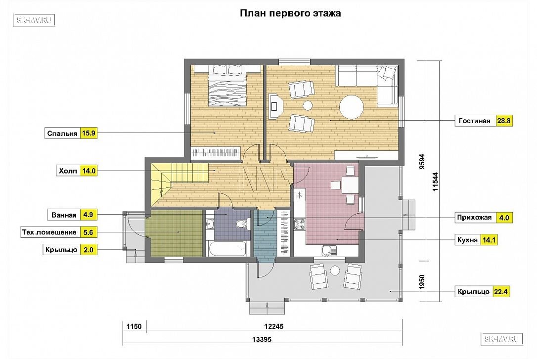 Наружные стены — каркас заводского изготовления из сухой строганной доски 45 × 145–195 мм.