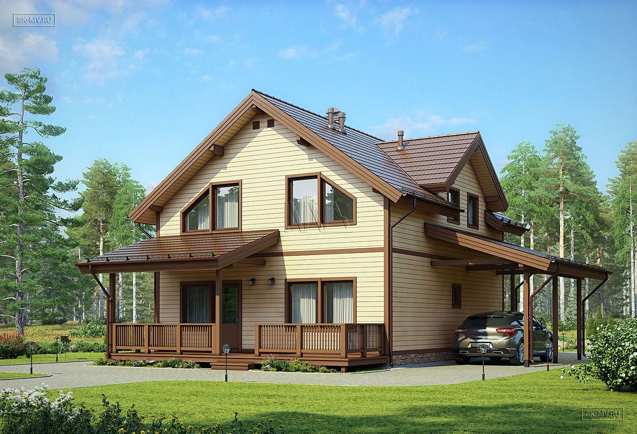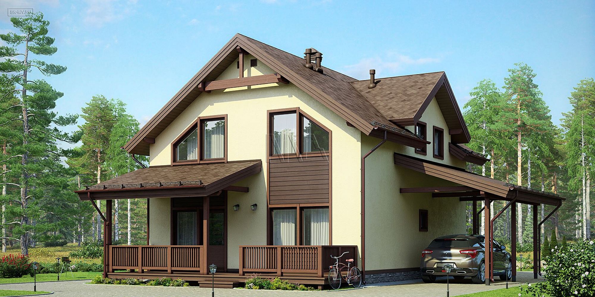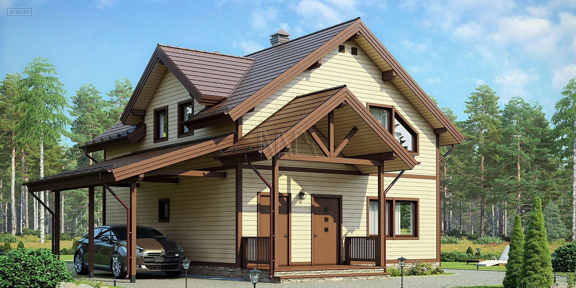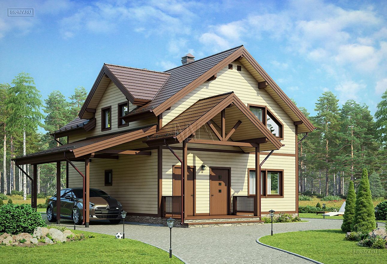 Проект «Пегелево» небольшого красивого двухэтажного дома площадью до 150 кв.м. с навесом для одного автомобиля — хорошее решение для строительства загородного коттеджа для молодой семьи с детьми. Проект «Пегелево» является видоизмененным аналогом проекта «МВ 1».