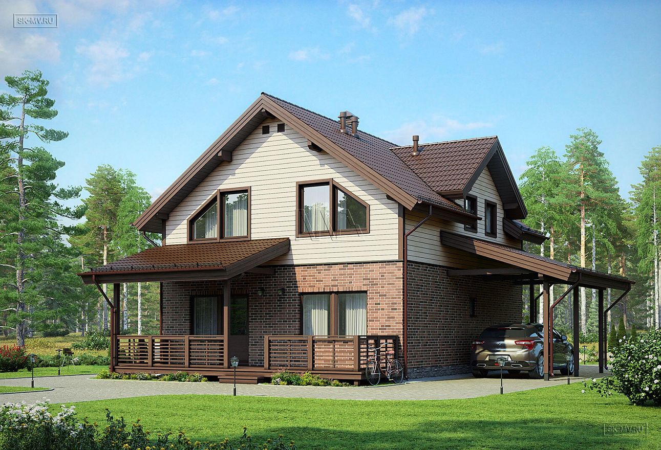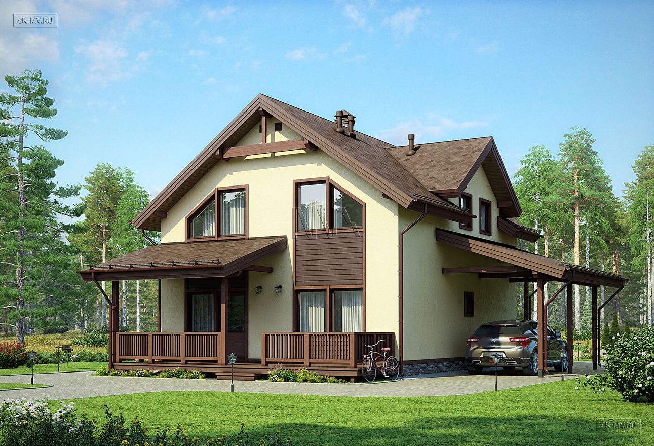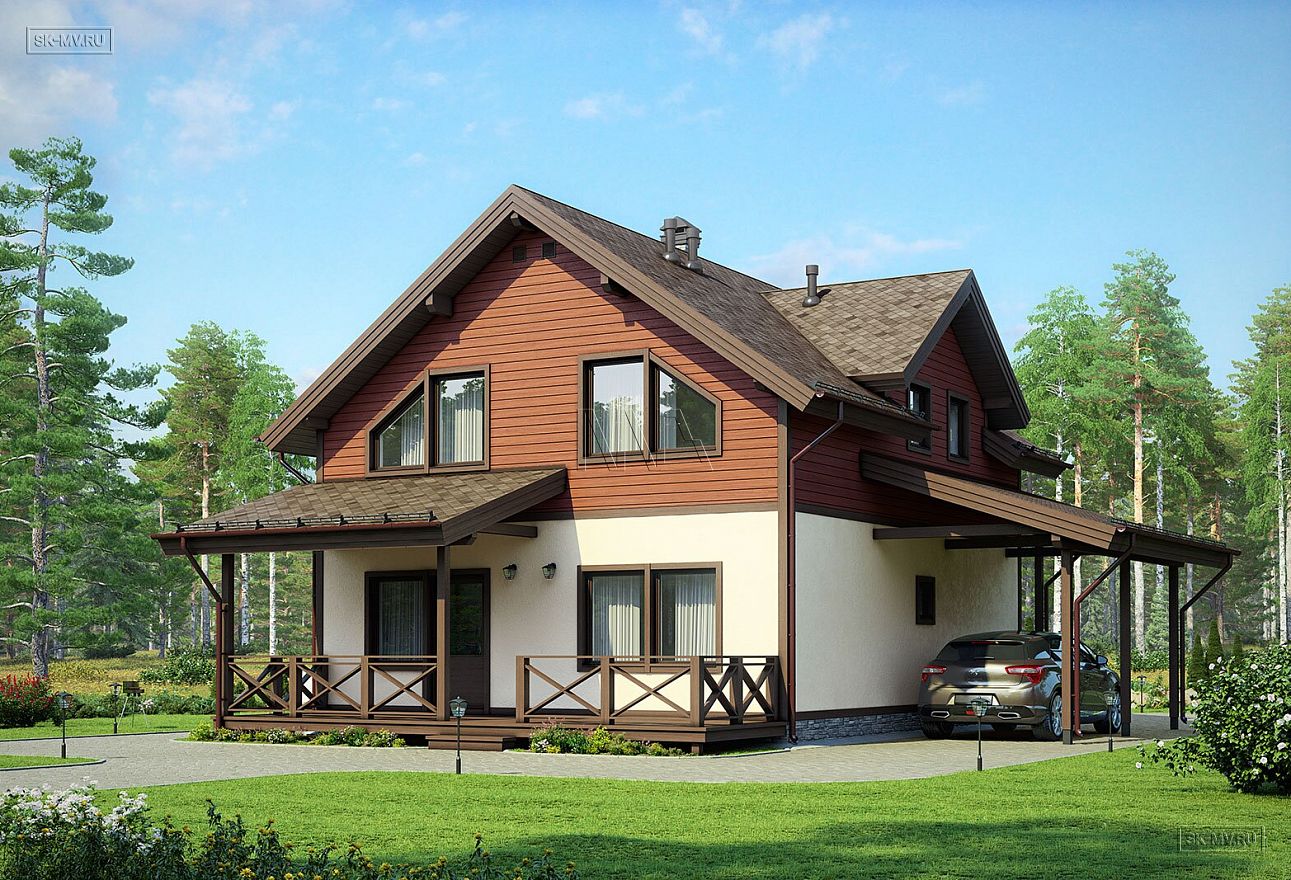 Проект «Пегелево» небольшого красивого двухэтажного дома площадью до 150 кв.м. с навесом для одного автомобиля — хорошее решение для строительства загородного коттеджа для молодой семьи с детьми. Проект «Пегелево» является видоизмененным аналогом проекта «МВ 1».