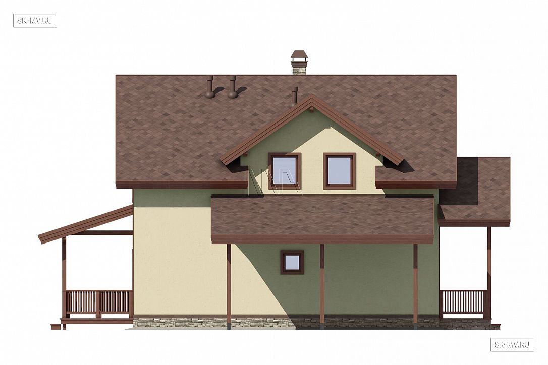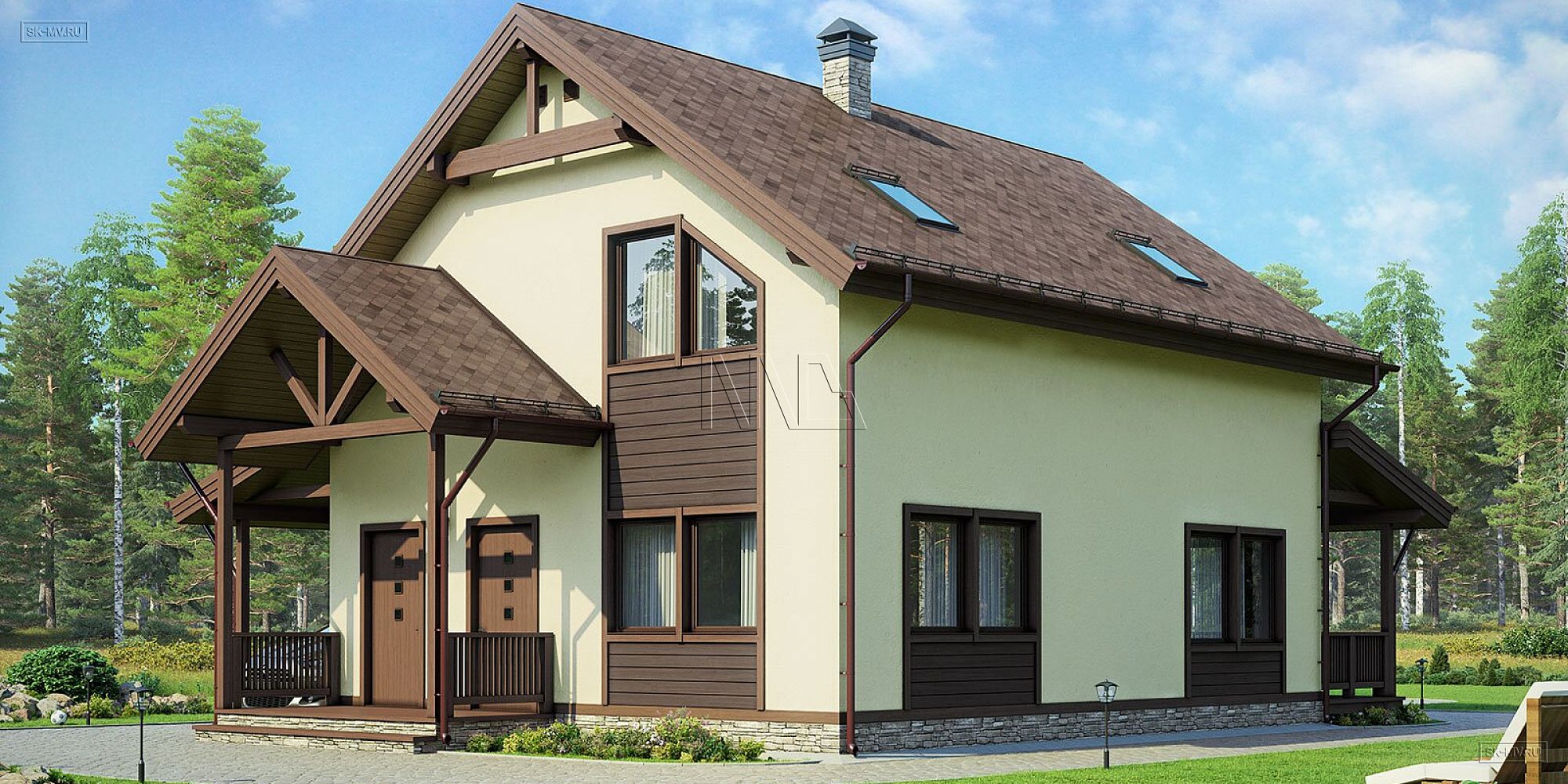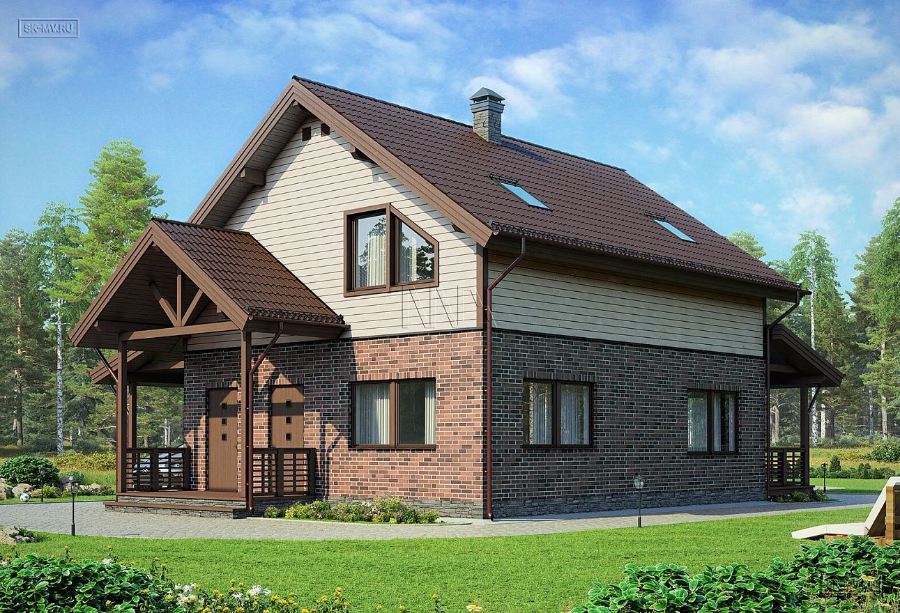 Особой популярностью пользуется вариант в английском стиле, где на фасаде сочетается пестрый красный отделочный кирпич на первом этаже, отделочная доска молочного цвета на втором этаже и коричневая кровля, подшивка карнизных свесов, коричневые элементы террас, стоек, балок и водосточной системы. Комбинированная отделка дома в английском стиле придает небольшому дому площадью до 150 кв.м солидность и в то же время наделяет его уникальным шармом.