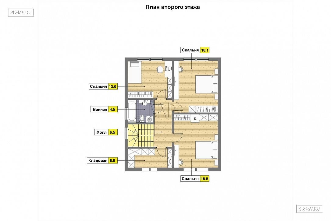 Помимо четырех спален, камина в центре просторной гостиной, большой кладовой на втором этаже на площади 147 кв.м уместилась котельная площадью 6,1 кв.м, что соответствует требованиям норм для газовой котельной. Также следует обратить внимание заказчиков строительства загородного дома по проекту «Пегелево» на возможность удобного выхода из кухни на террасу.