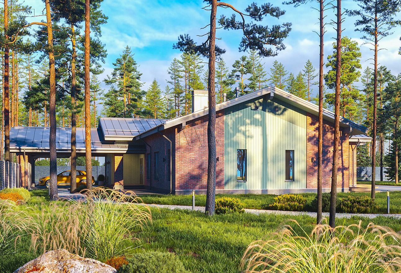 Фасадная отделка — имитация бруса с покрытием Tikkurila Vinha в комбинации с красным облицовочным кирпичом рустик. В подборе цветовой гаммы архитектор отталкивался от основ гармоничного сочетания цветов в цветовом спектре.