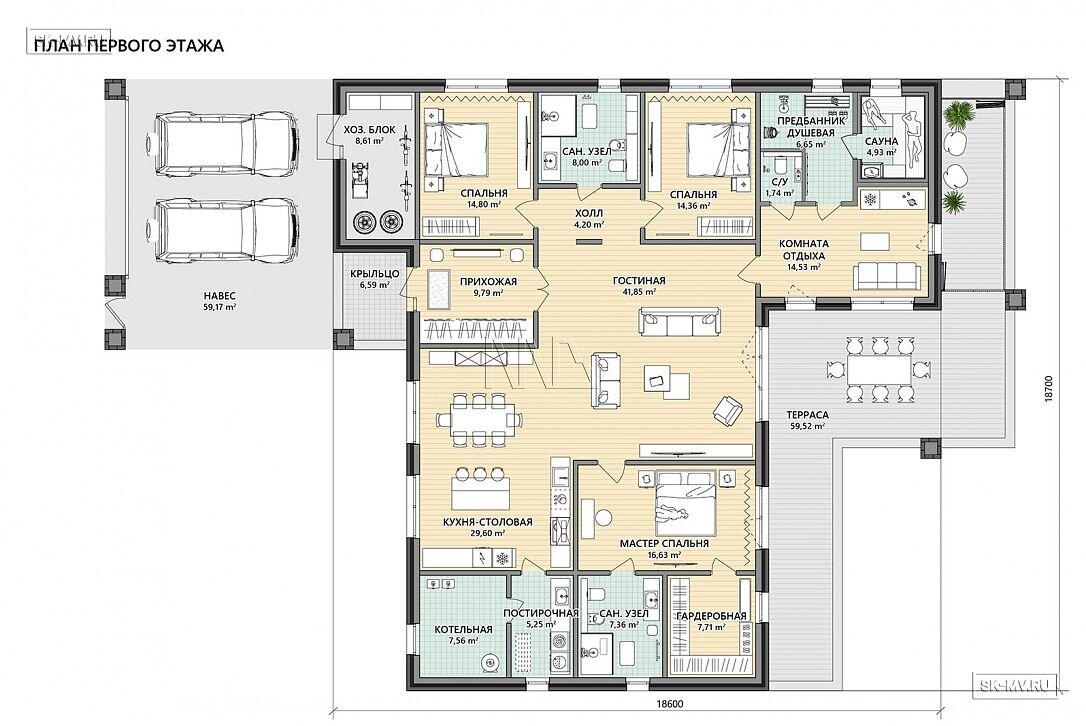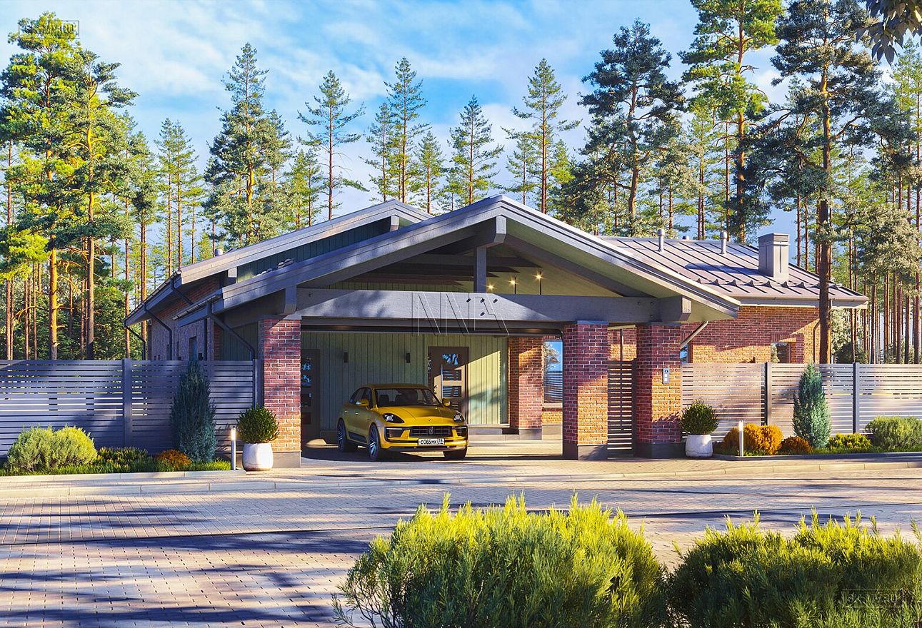 Прихожая с гардеробной как буфер между теплой гостиной и холодным крыльцом. От крыльца до колонн забора организован навес для двух автомобилей с подъемными воротами на въезде и калиткой. Такое решение облегчает задачу чистки территории въездной группы от снега.