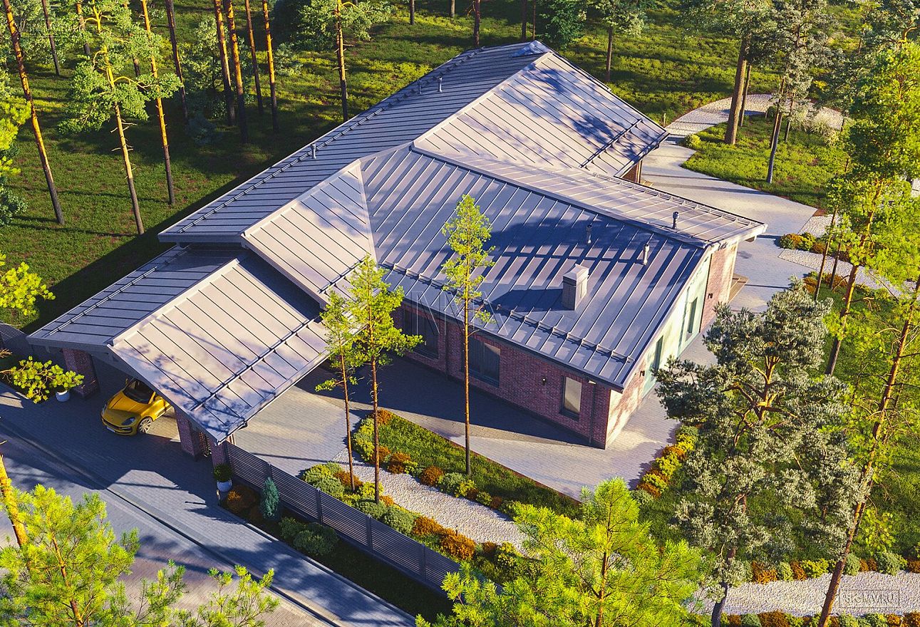 Также были учтены требования коттеджного поселка к использованию темно-серого цвета на для забора и кровли. Темно-серая фальцевая кровля дома поддерживается на фасаде идентичным цветом оконного профиля.