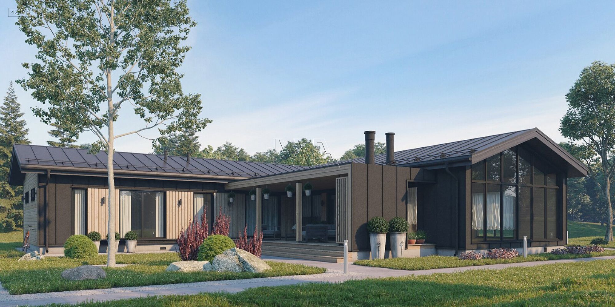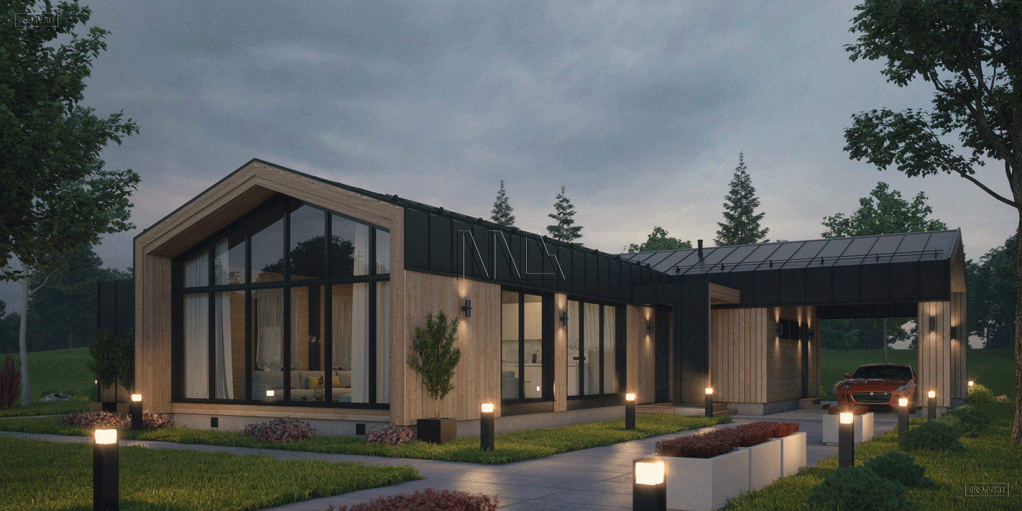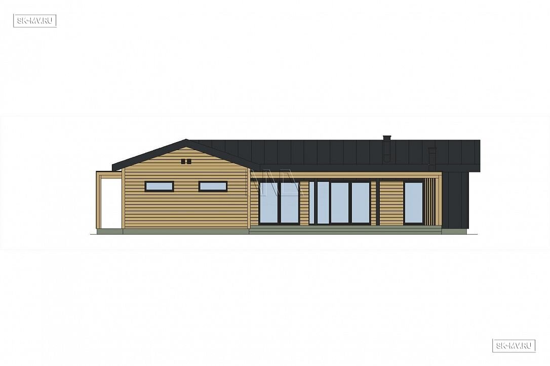 Проект одноэтажного дома «Пирогово» площадью 187 кв.м с террасой и навесом для автомобиля — отражение новой тенденции в загородном домостроении, поскольку сейчас заказчики все чаще и чаще отдают предпочтении одноэтажным домам.