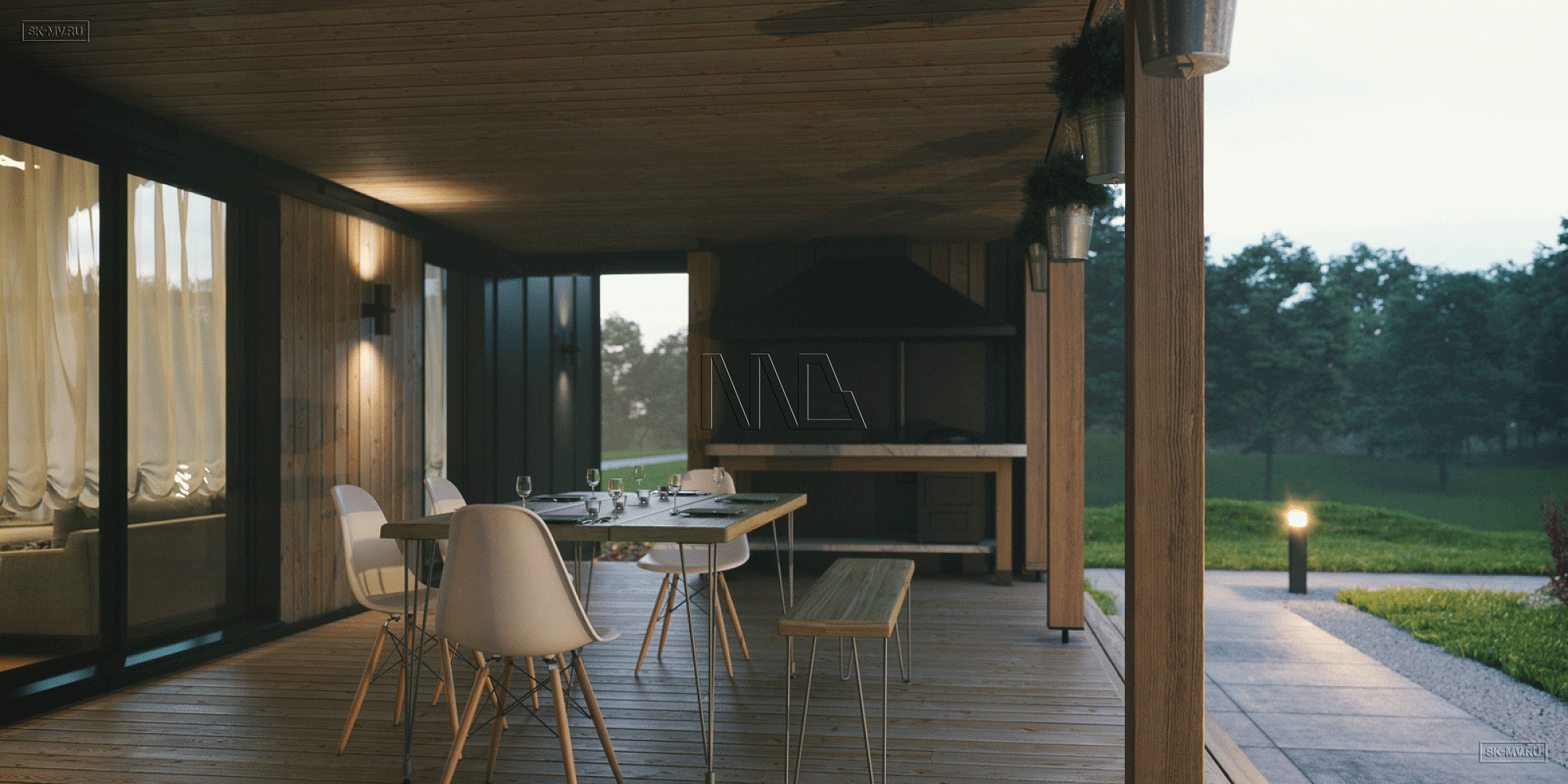 Проект «Пирогово» интересен своим объемно-планировочным решением. Высокие потолки, трехстороннее панорамное остекление гостиной, глубокая терраса под кровлей на скандинавский манер для отдыха в любую погоду, спа-зона с сауной, а также две мастер-спальни с гардеробными и санузлами.